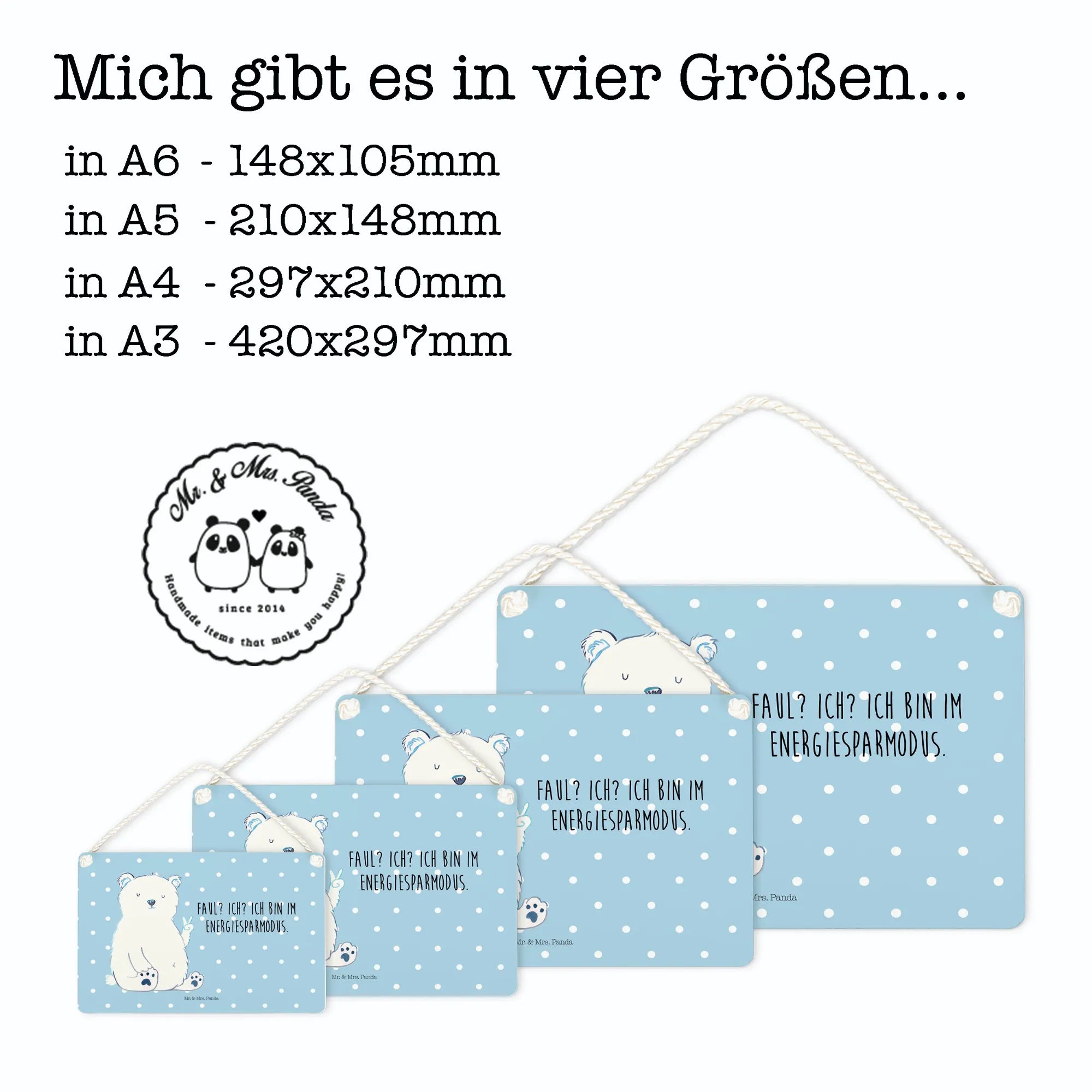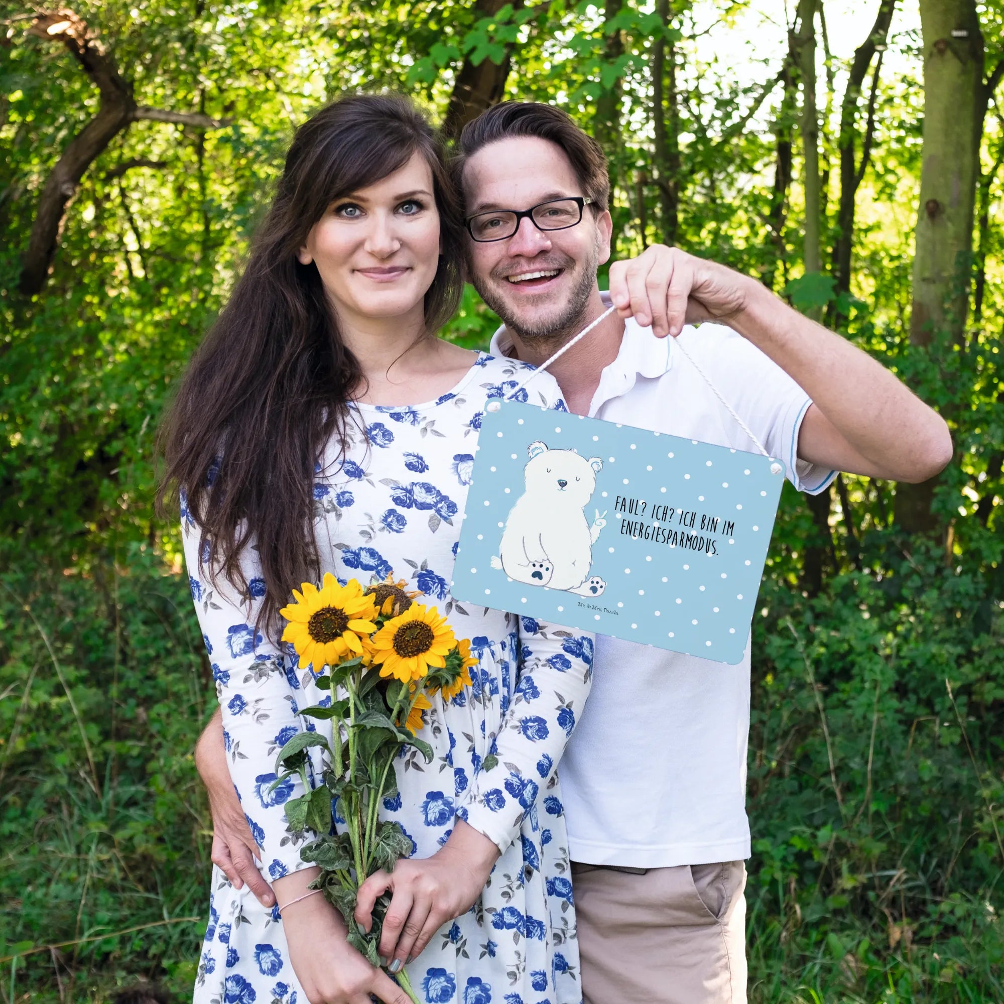 Schau dir unser wunderschönes Deko Schild "Eisbär Faul" von Mr. & Mrs. Panda an! Dieses liebevoll gestaltete Schild wird jedes Zuhause verschönern und ist ein perfektes Geschenk für Bärchenliebhaber und Leute, die gerne relaxen. In einem entspannten Blau Pastell gehalten, zeigt das Schild einen süßen Eisbären, der lässig das Peace-Zeichen macht. Mit einem dazu passenden Slogan: "Faul? Ich? Ich bin im Energiesparmodus." ist es nicht nur eine tolle Wanddeko, sondern sorgt auch für einen Schmunzler und ein wenig gute Laune im Büro oder Homeoffice!