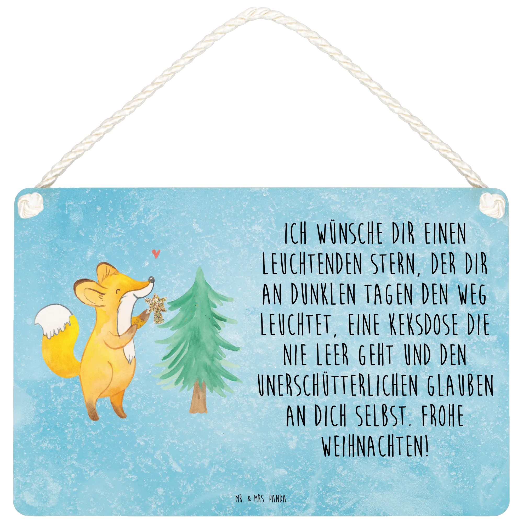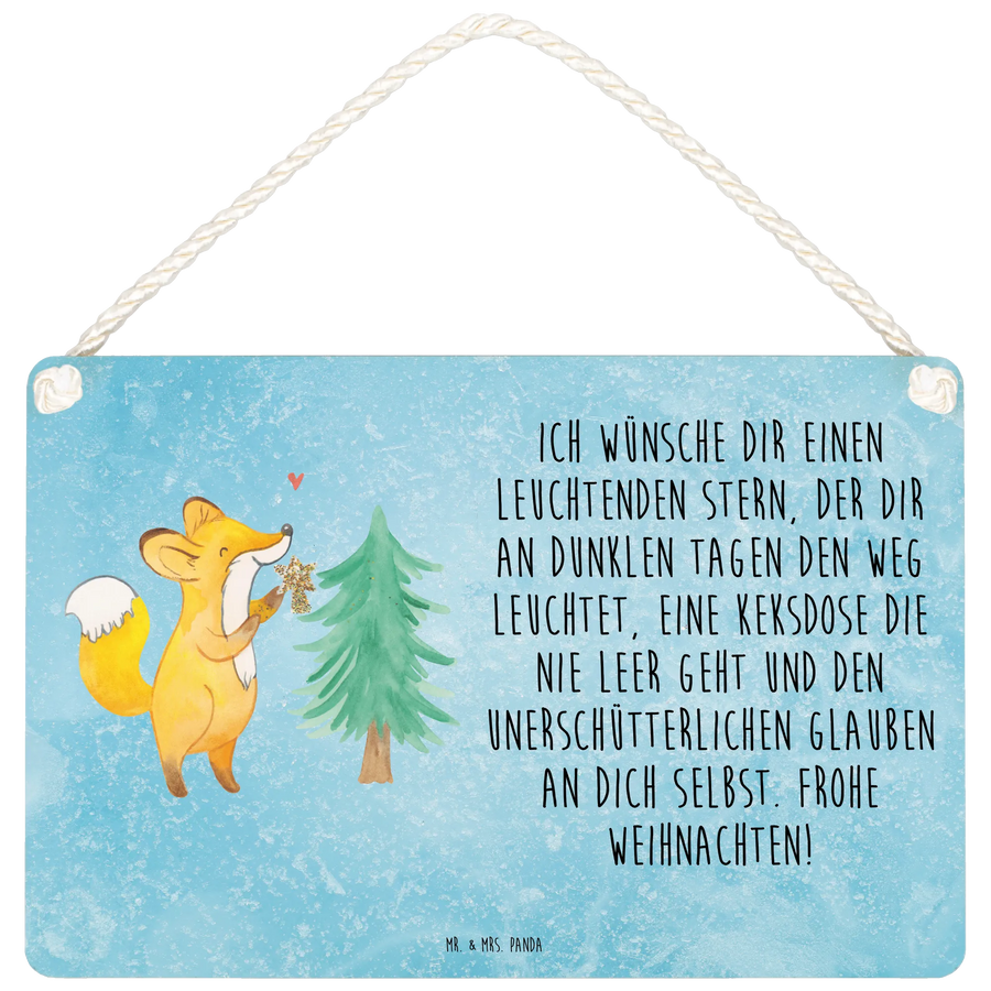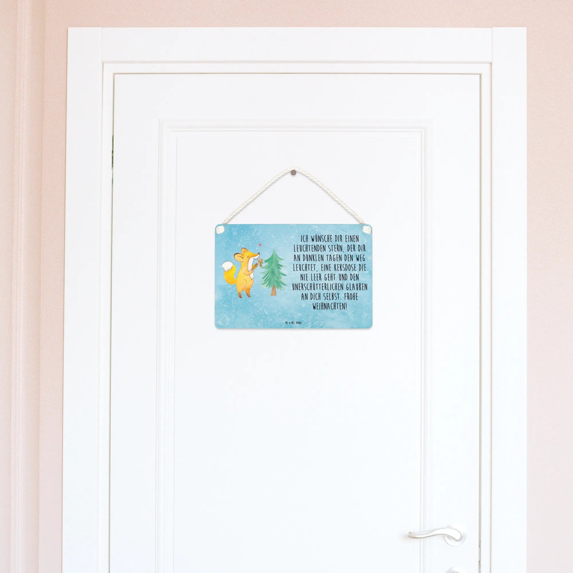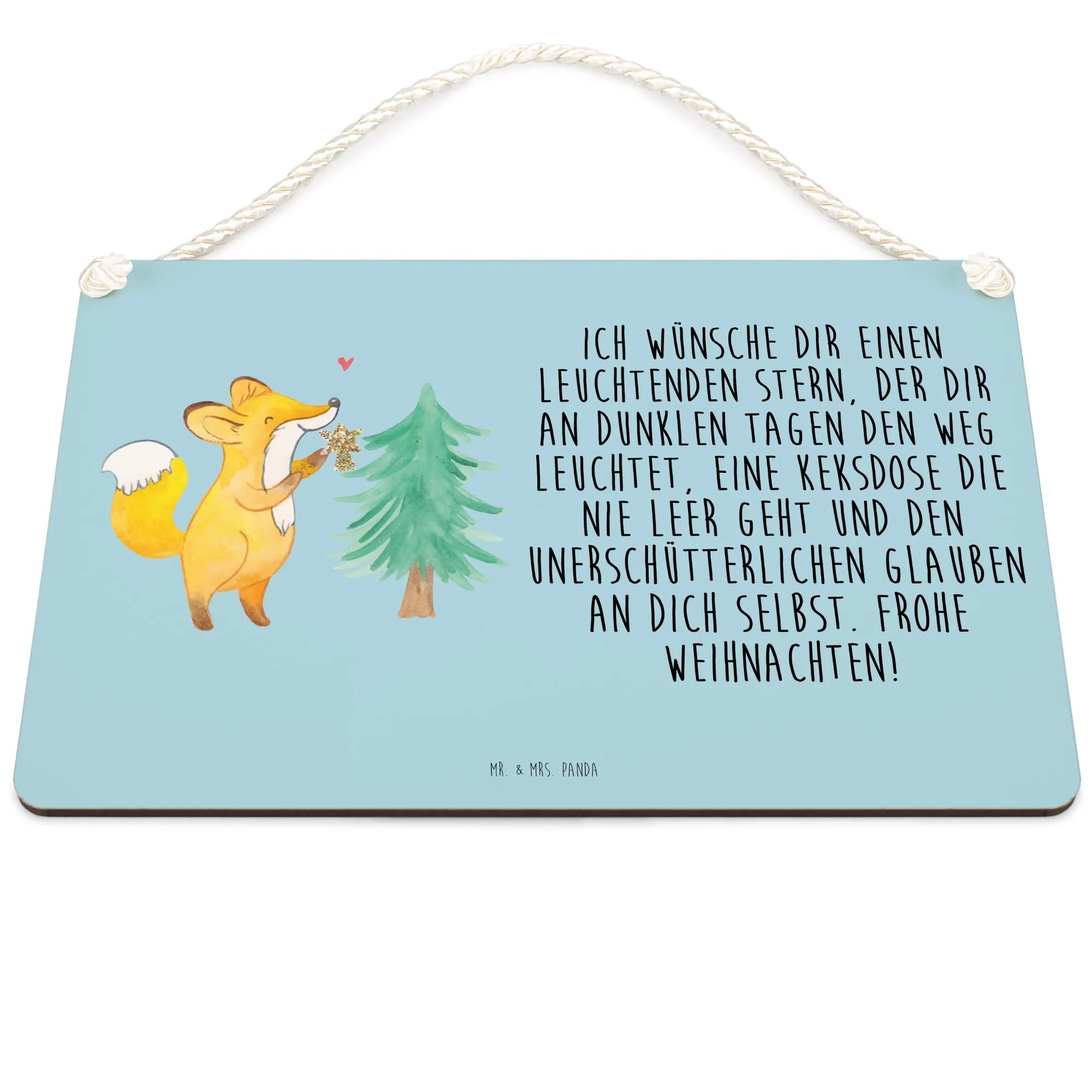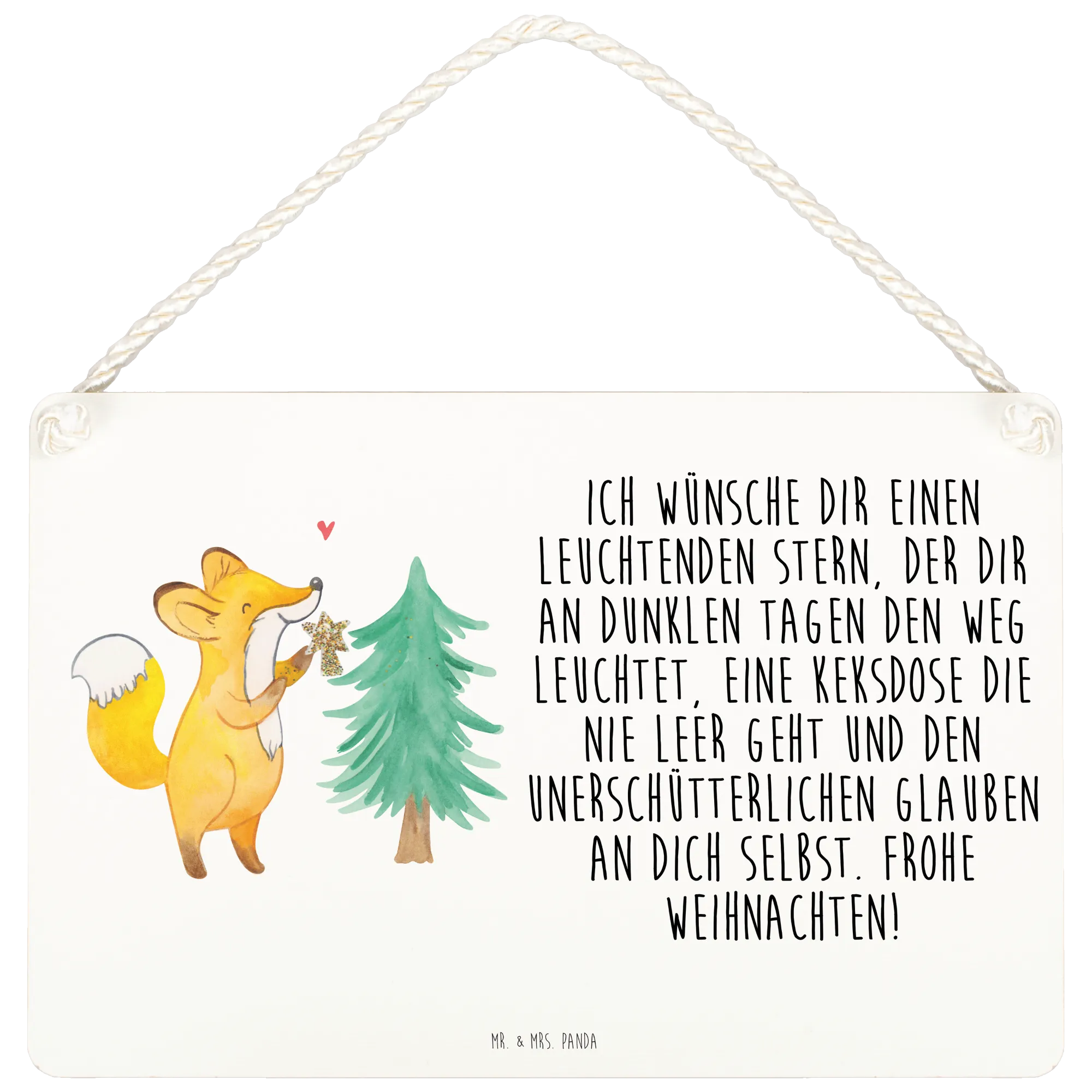 Der Slogan "Ich wünsche dir einen leuchtenden Stern, der dir an dunklen Tagen den Weg leuchtet, eine Keksdose die nie leer geht und den unerschütterlichen Glauben an dich selbst. Frohe Weihnachten!" verleiht dem Schild eine zusätzliche persönliche Note. Die Kombination aus dem fröhlichen Fuchs, dem geschmückten Weihnachtsbaum und dem warmherzigen Spruch macht dieses Deko Schild zu einer wunderbaren Erinnerung für die besinnliche Zeit.