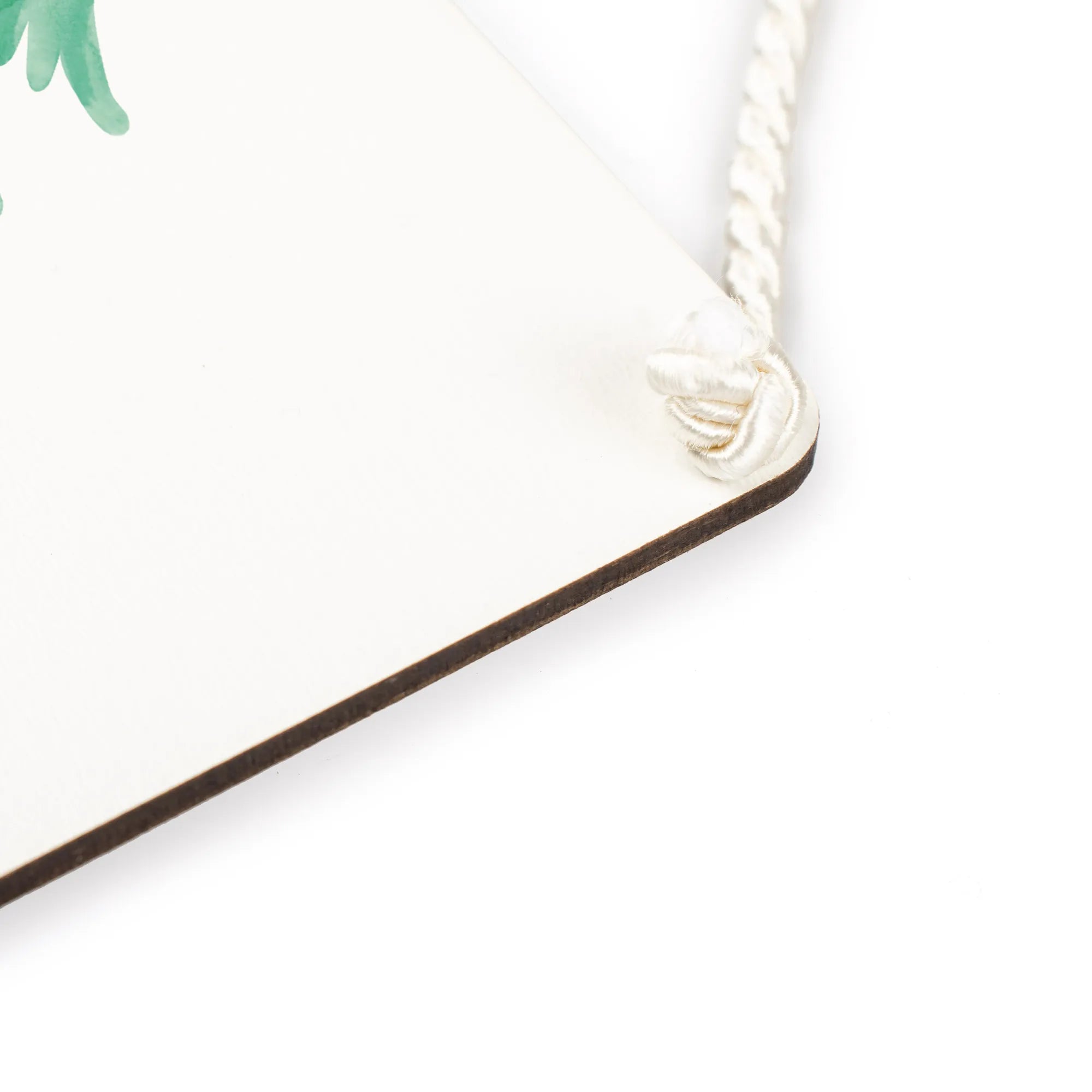 Das Schild misst im DIN A5 Format und wird aus hochwertiger beschichteter Holzfaser gefertigt, was für eine lange Lebensdauer sorgt. Mit der hübsch gedrehten Kordel kannst du das Schild leicht aufhängen – sei es an der Tür oder als Wandschild in deinem Wohnbereich.