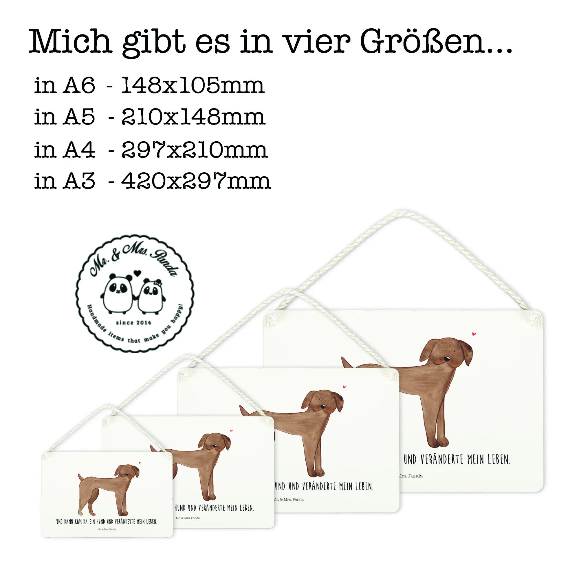 Das Deko Schild hat die praktische Größe von DIN A4 und passt perfekt an die Wand oder Tür. Die wunderschön gedrehte Kordel zur Aufhängung sorgt dafür, dass du dein Schild einfach und elegant anbringen kannst. Die Hunde Kollektion von Mr. & Mrs. Panda ist nicht nur originell, sondern auch voller Herzblut gestaltet. Jeder Spruch und jedes Motiv wurde mit viel Liebe und Freude entworfen.