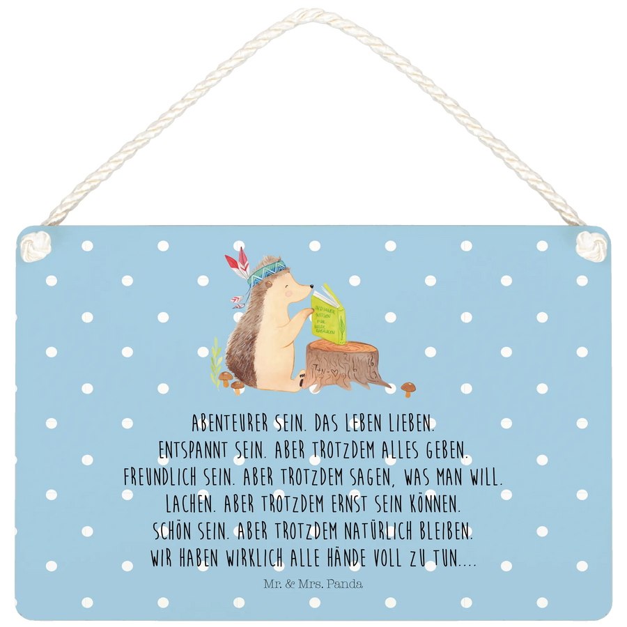 Entdecke das zauberhafte Deko Schild "Igel Indianer" aus der Waldtiere Kollektion von Mr. & Mrs. Panda! Dieses wunderschöne Schild aus beschichteter Holzfaser ist nicht nur eine fantastische Wanddeko, sondern auch ein liebenswerter Hingucker für jede Tür. Es zeigt einen kleinen Igel mit einem bunten Federschmuck auf dem Kopf, der an einem Baumstumpf sitzt und ein Buch über Abenteuer liest. Die Kombination aus süßem Design und dem inspirierenden Slogan "Abenteurer sein. Das Leben lieben. Entspannt sein. Aber trotzdem alles geben..." macht dieses Schild zu einem perfekten Geschenk für Freunde, Familie oder für dich selbst!