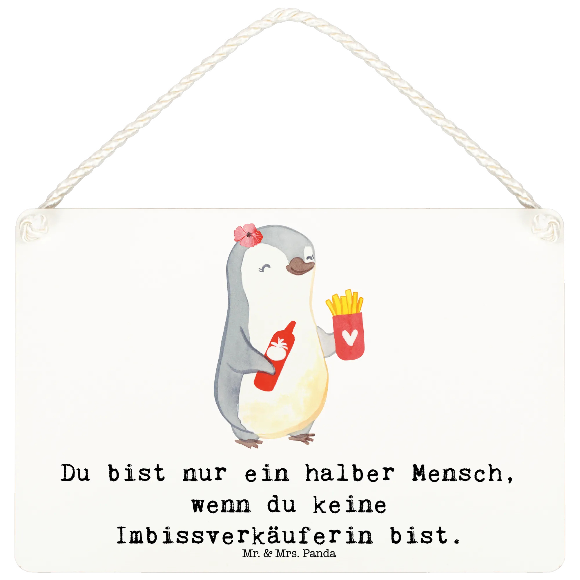 Das Deko Schild "Imbissverkäuferin mit Herz" von Mr. & Mrs. Panda ist das perfekte Geschenk für alle Imbissbesitzerinnen und Pommesverkäuferinnen. Wenn du jemanden kennst, der leidenschaftlich in der Gastronomie tätig ist und die besten Pommes in der Stadt verkauft, dann ist dieses Schild genau das Richtige!
