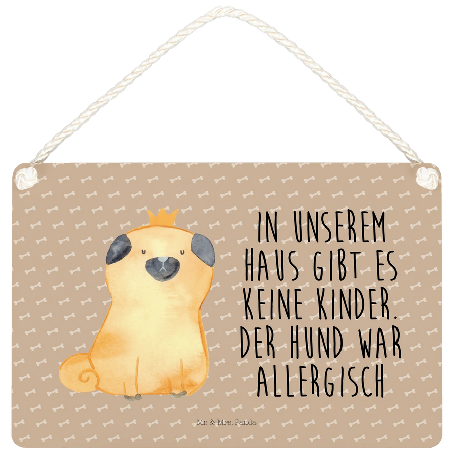 Suchst du nach der perfekten Deko für dein Zuhause oder ein Geschenk für einen lieben Hundebesitzer? Dann ist unser wunderschönes Deko Schild „Mops Krone“ von Mr. & Mrs. Panda genau das Richtige für dich! Dieses edle Holzschild mit dem lustigen Spruch „In unserem Haus gibt es keine Kinder. Der Hund war allergisch.“ bringt nicht nur gute Laune, sondern auch einen Hauch von Individualität in dein Heim.
