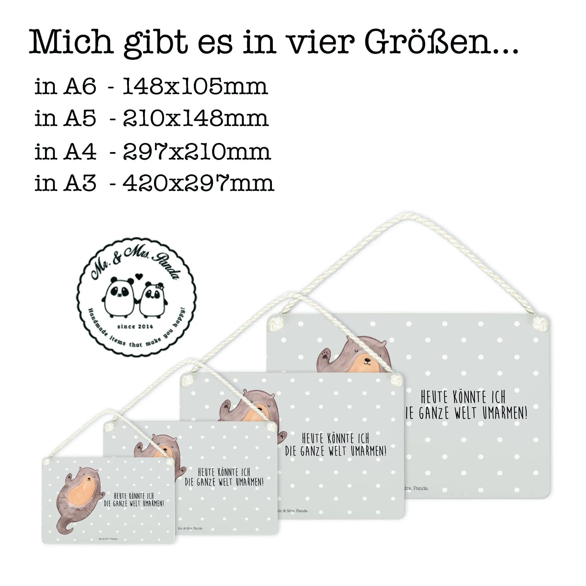 Suchst du das perfekte Geschenk für einen echten Otter-Fan? Dann ist unser Deko Schild "Otter Umarmen" aus der liebevollen Otter-Kollektion von Mr. & Mrs. Panda genau das Richtige! Dieses wundervolle Holzschild bringt nicht nur gute Laune in jedes Zuhause, sondern es hat auch einen ganz besonderen Spruch: "Heute könnte ich die ganze Welt umarmen!". Das niedliche Design mit dem schwimmenden Otter, der seine Arme ausbreitet, um das Leben zu begrüßen, zaubert jedem ein Lächeln ins Gesicht.