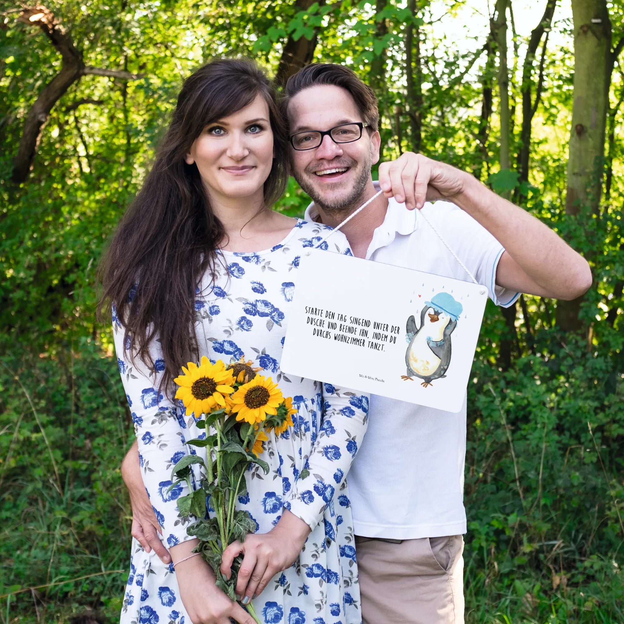 Das wunderschöne Deko Schild 'Pinguin duscht' aus der Pinguin-Kollektion von Mr. & Mrs. Panda bringt nicht nur Freude, sondern auch einen Hauch von Motivation in dein Zuhause. Mit einem niedlichen Pinguin, der fröhlich unter einem Regenschauer duscht und eine Duschhaube trägt, zaubert dieses Schild jedem ein Lächeln ins Gesicht.