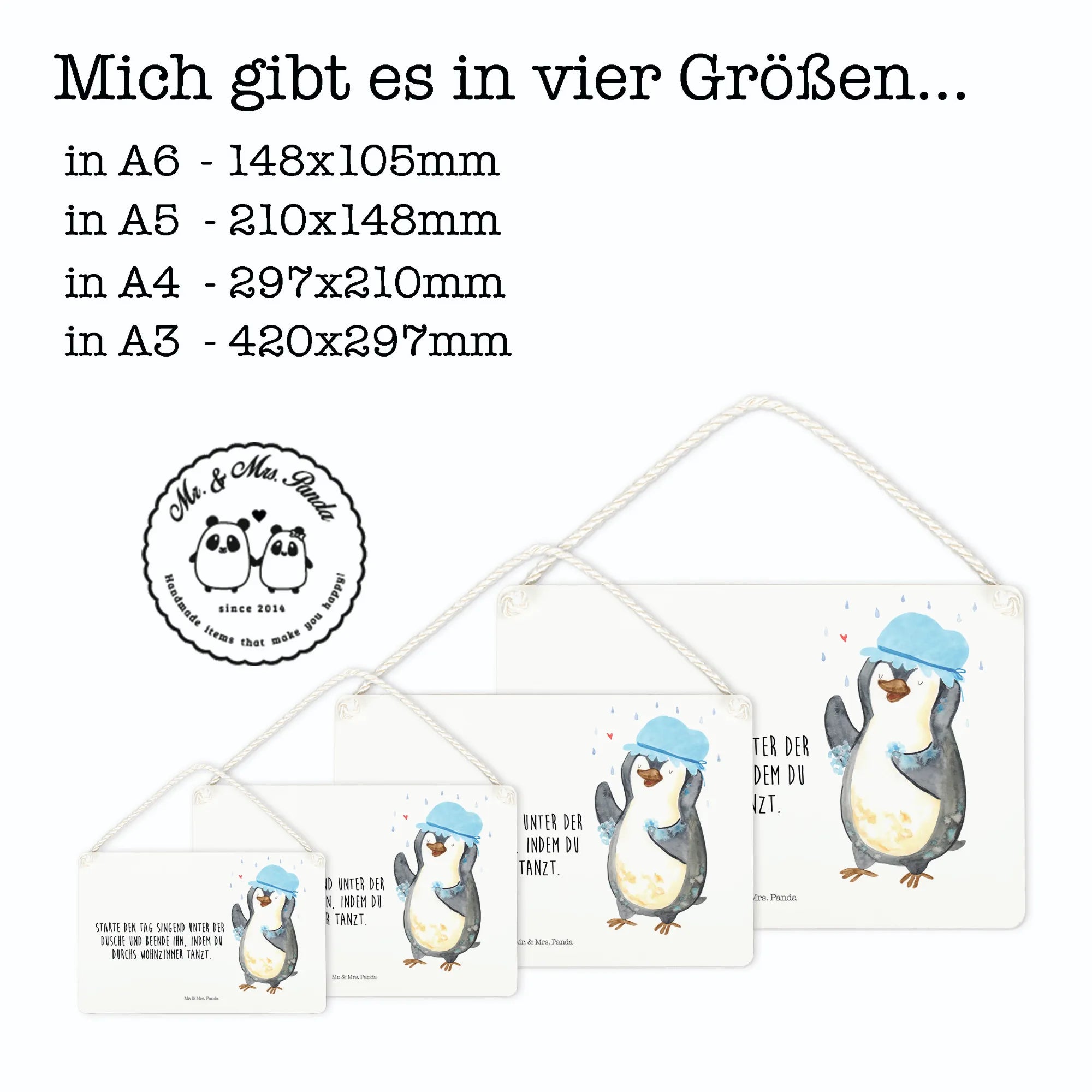 Stell dir vor, wie dieser fröhliche Pinguin, der unter dem Regenschauer mit Duschhaube steht und sein Lebensmotto verkörpert, deine morgendliche Routine aufhellt! Das Schild ist aus hochwertiger beschichteter Holzfaser gefertigt und sorgt für eine langlebige und edle Optik. Mit den Maßen von DIN A4 passt es ideal für deine Tür oder Wand und wird dort zum Hingucker!