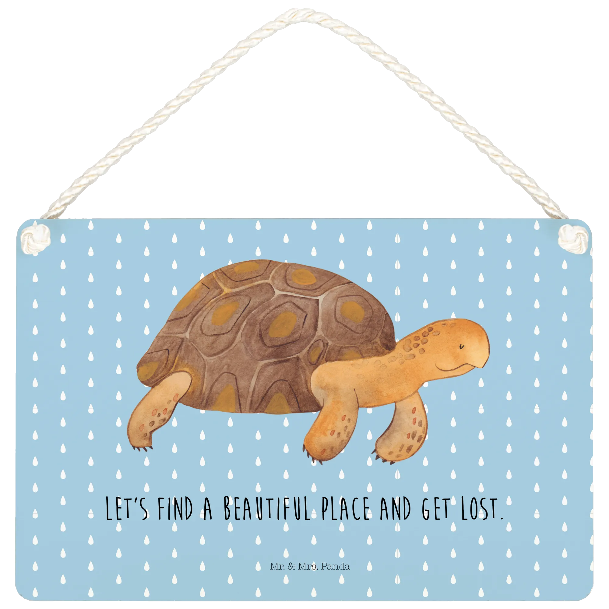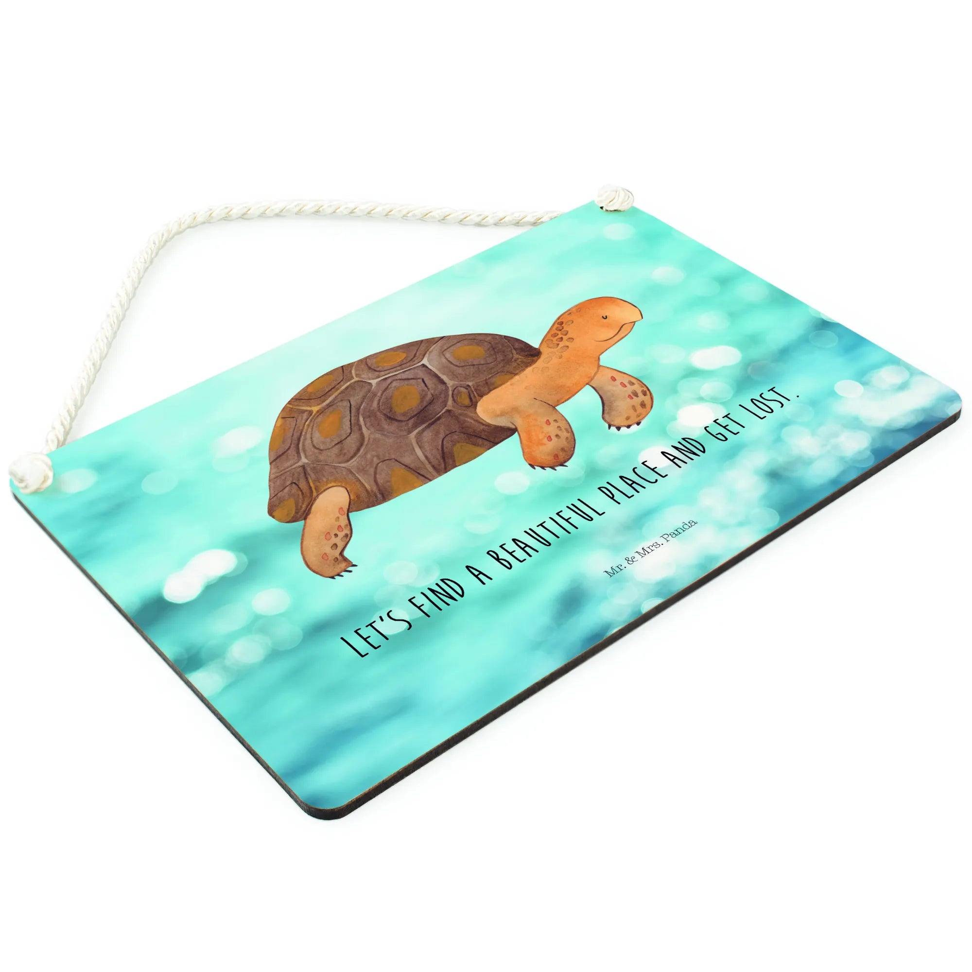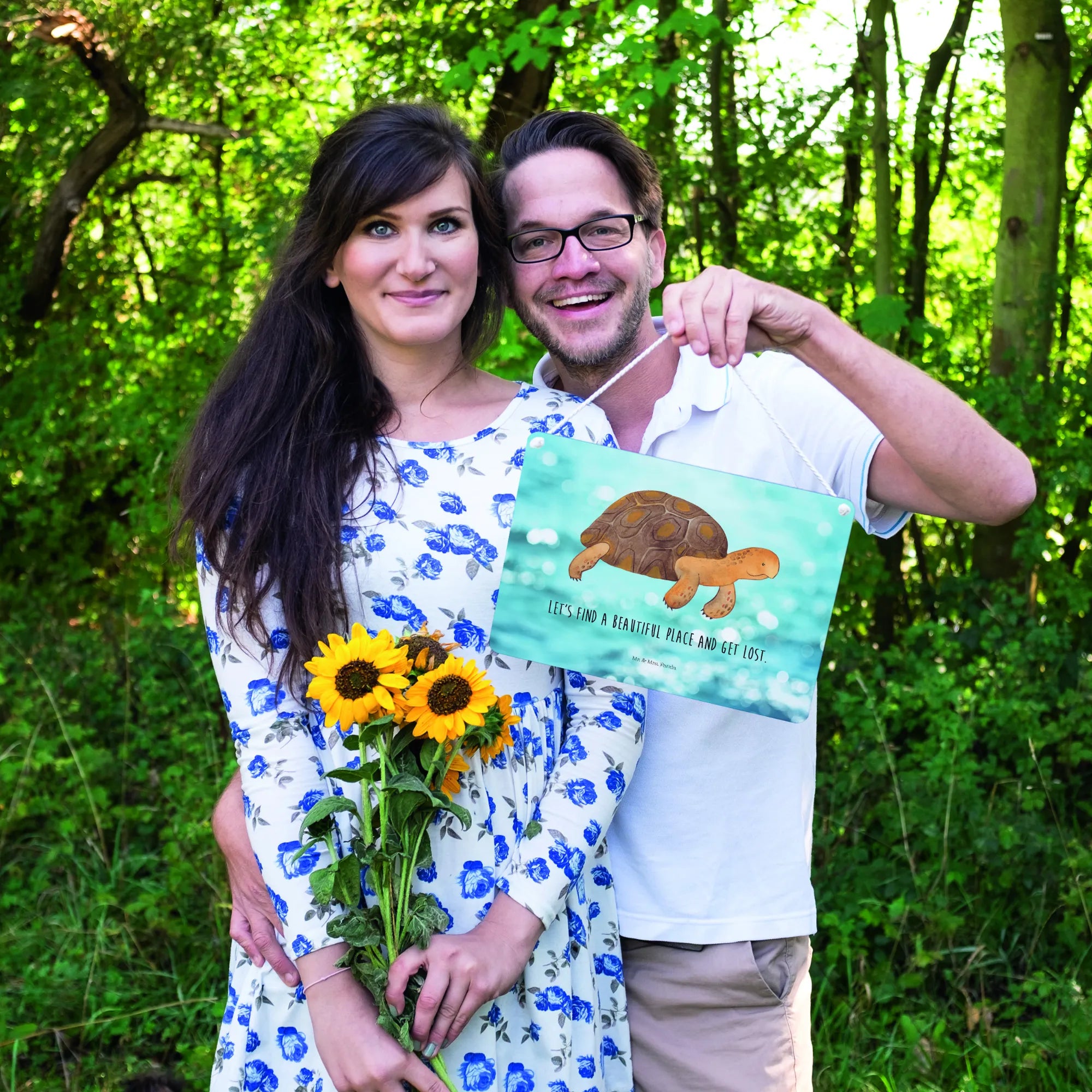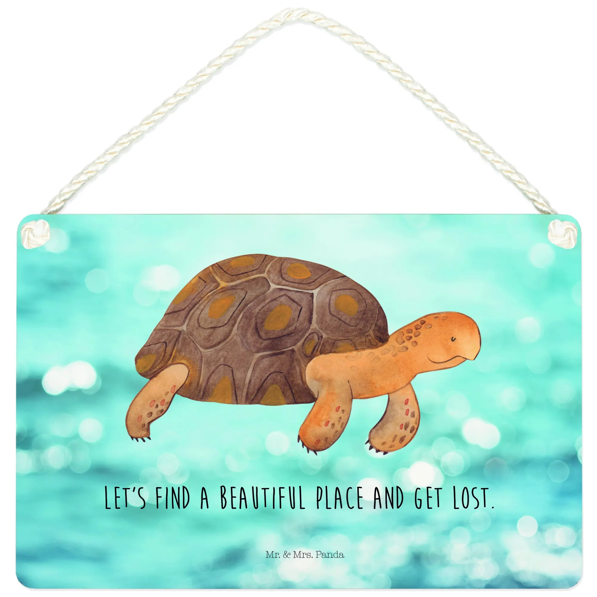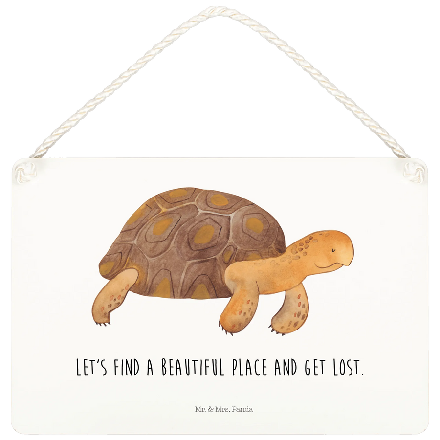 Die Schildkröte auf dem Schild strahlt Ruhe und Gelassenheit aus. Ihr freundliches Lächeln und die entspannten Züge bringen jeden Raum zum Strahlen und vermitteln die Botschaft: "Let's find a beautiful place and get lost." So kann jeder Tag zu einem Abenteuer werden!