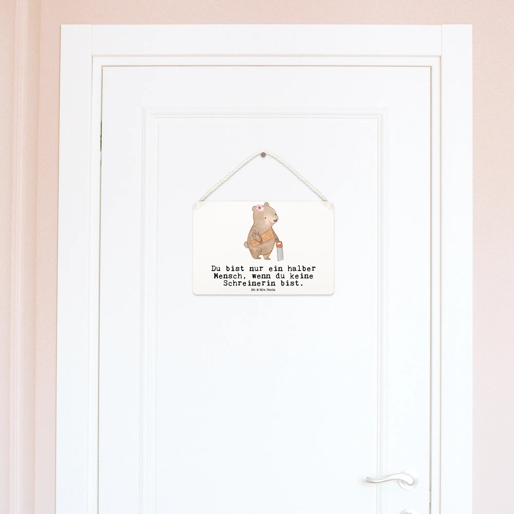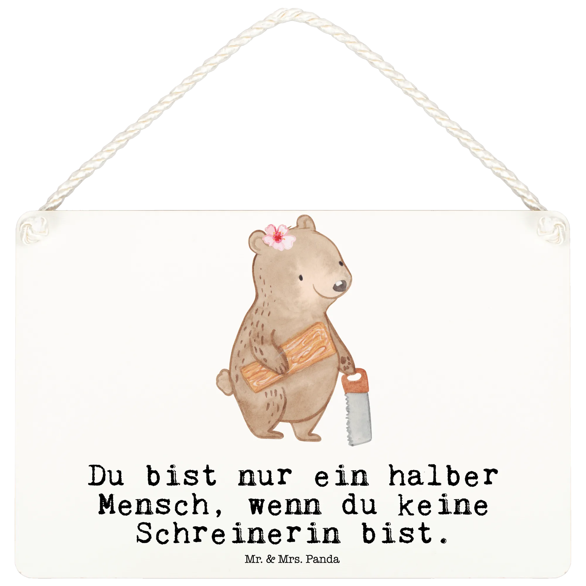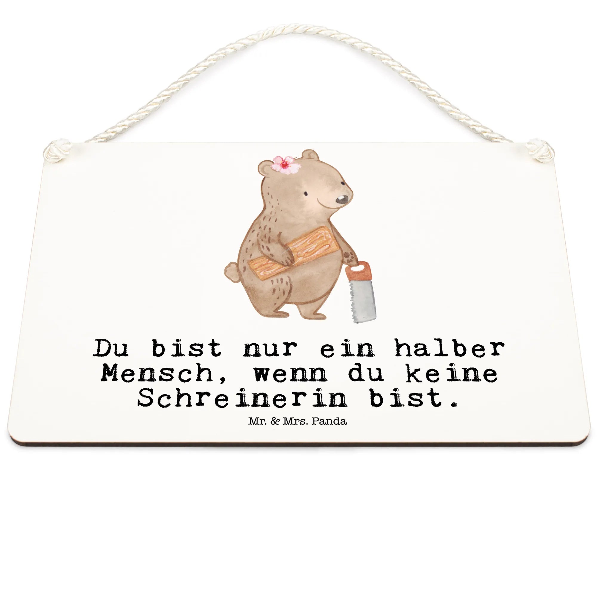 Das Deko Schild "Schreinerin mit Herz" aus der kreativen Berufe Kollektion von Mr. & Mrs. Panda ist ein wahrhaft einzigartiges Geschenk für alle, die sich dem Schreinerberuf mit Leidenschaft widmen. Egal, ob Du auf der Suche nach einem besonderen Präsent zum Jobbeginn, zur Beförderung oder zum Jubiläum bist – dieses liebevoll gestaltete Holzschild bringt Freude und Wertschätzung in jede Werkstatt oder jedes Zuhause. Das Schild wird in liebevoller Handarbeit entworfen und zeigt einen süßen Bären, der eine Säge in der einen Hand und ein Holzbrett in der anderen hält. Mit dem Spruch "Du bist nur ein halber Mensch, wenn du keine Schreinerin bist" zaubert es jedem Schreiner ein Lächeln ins Gesicht.