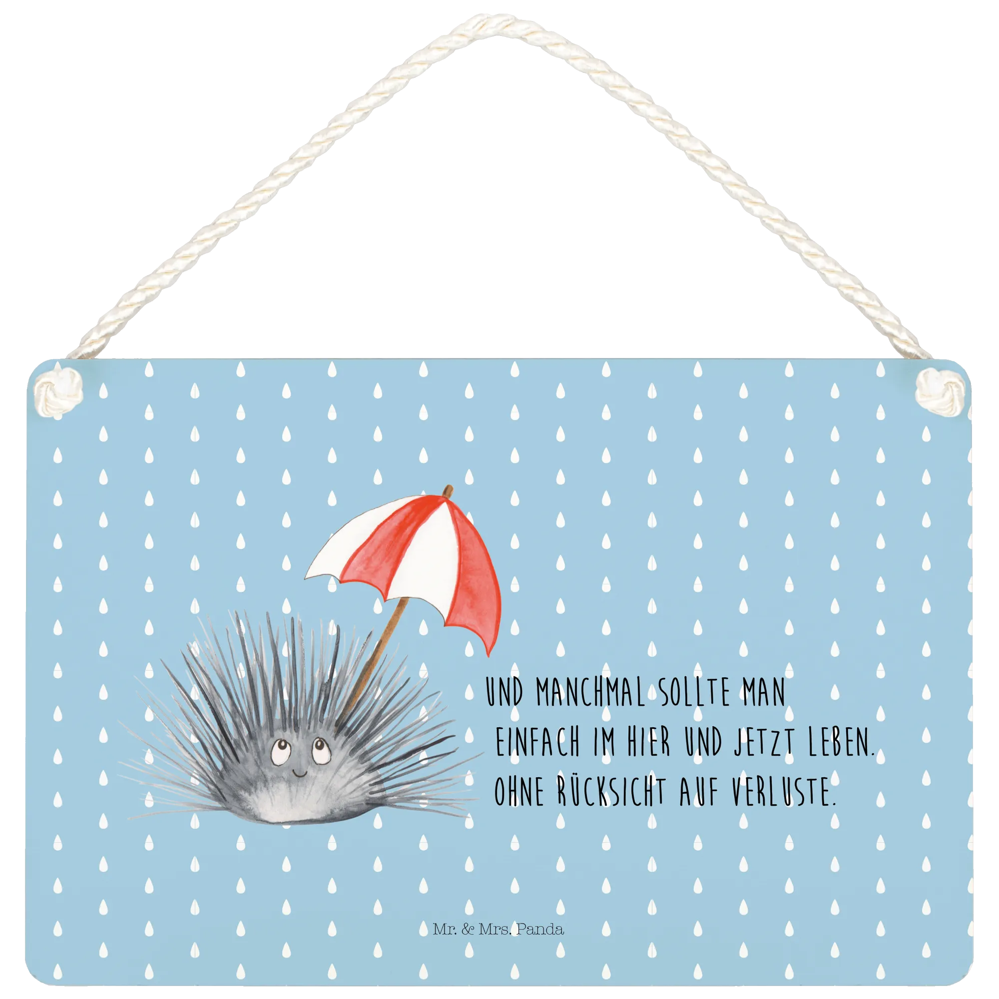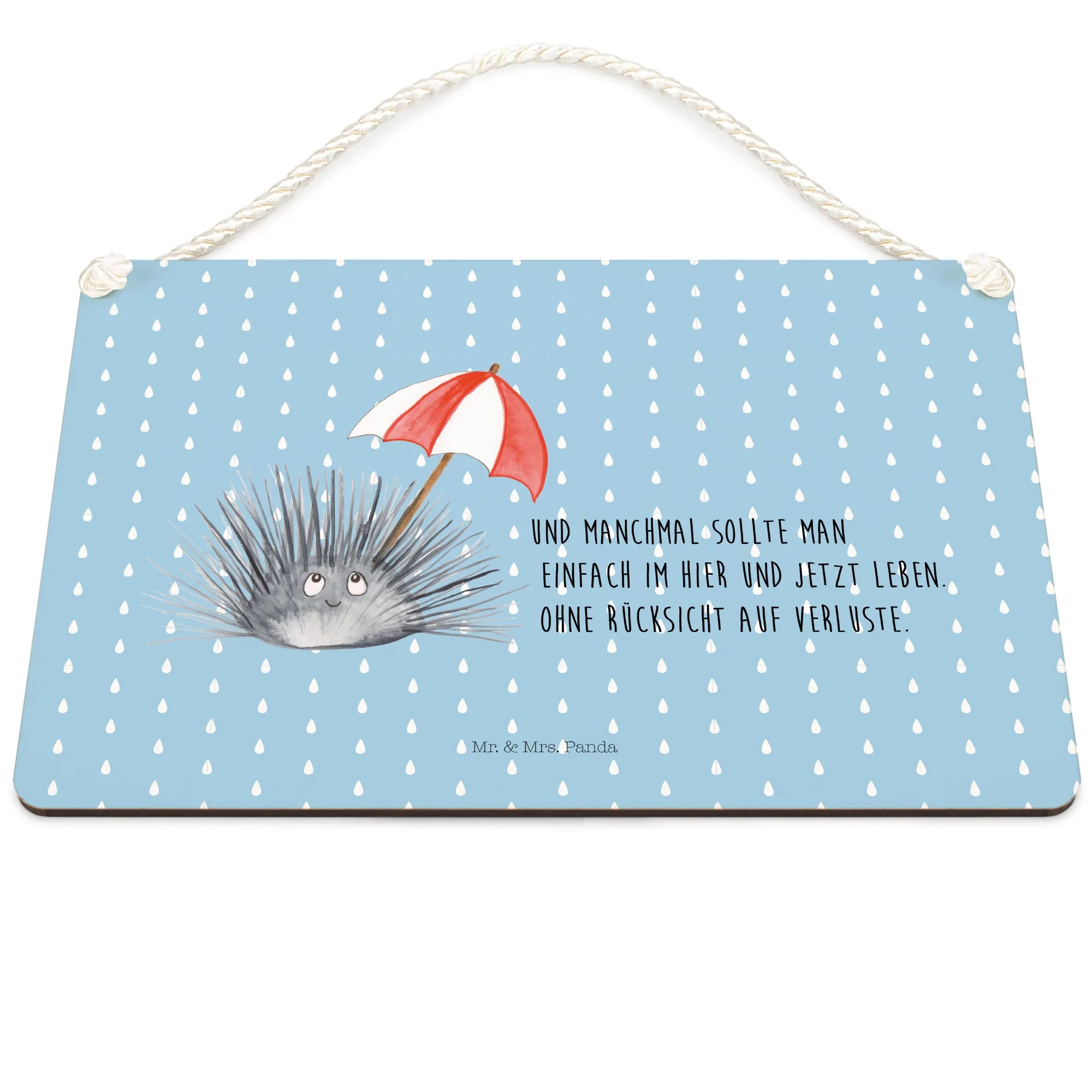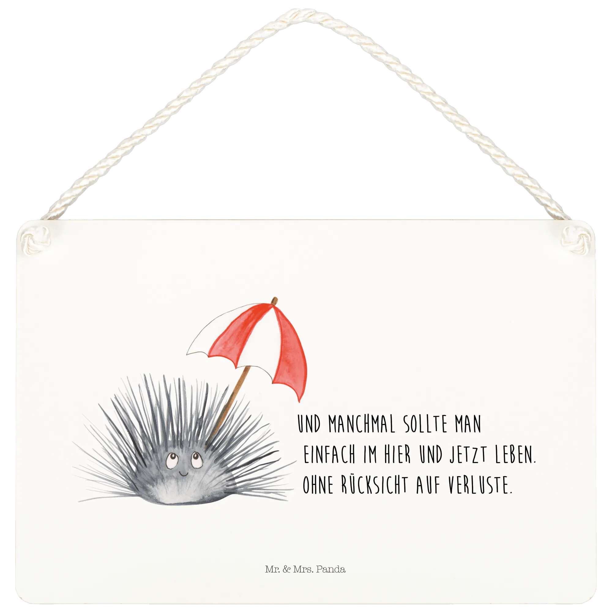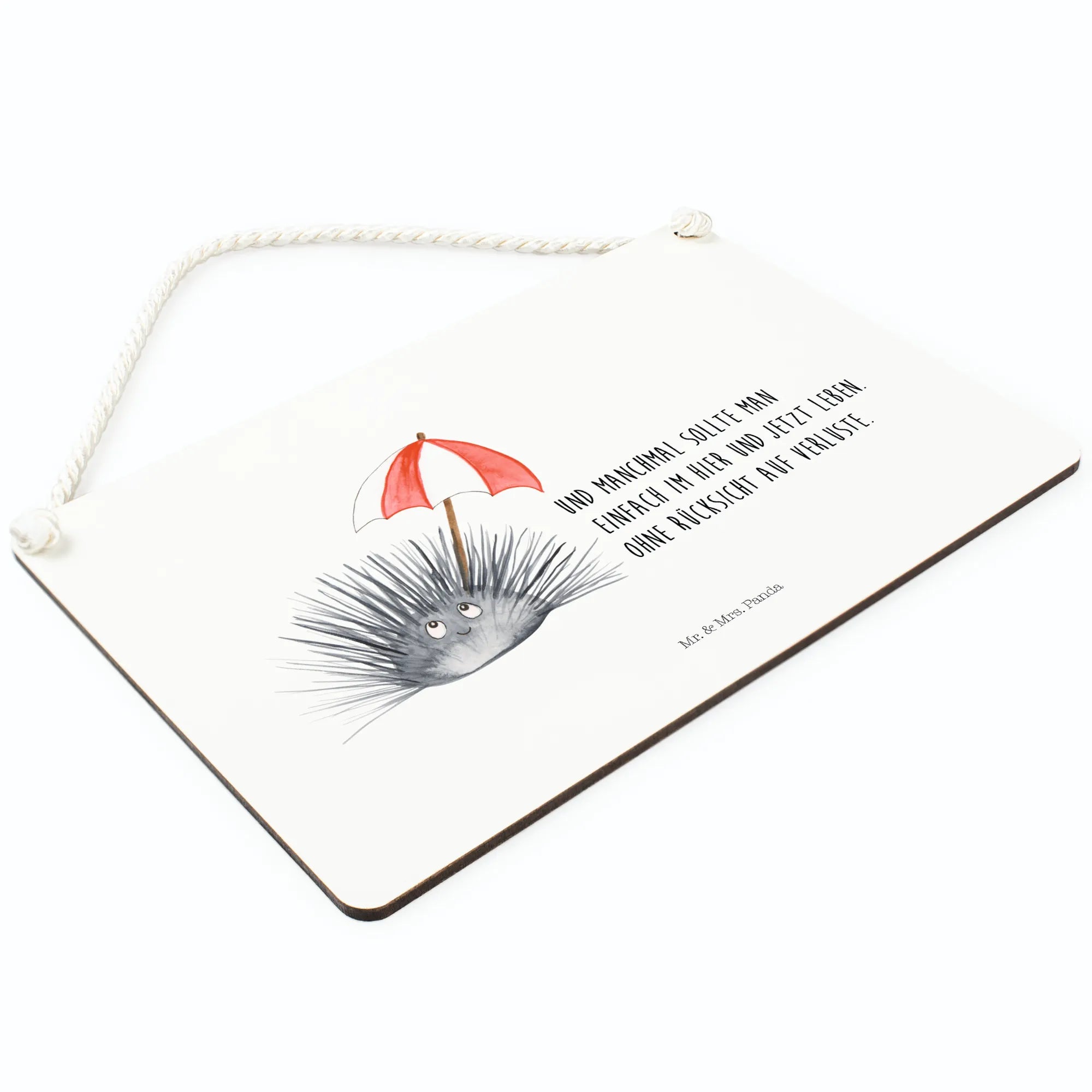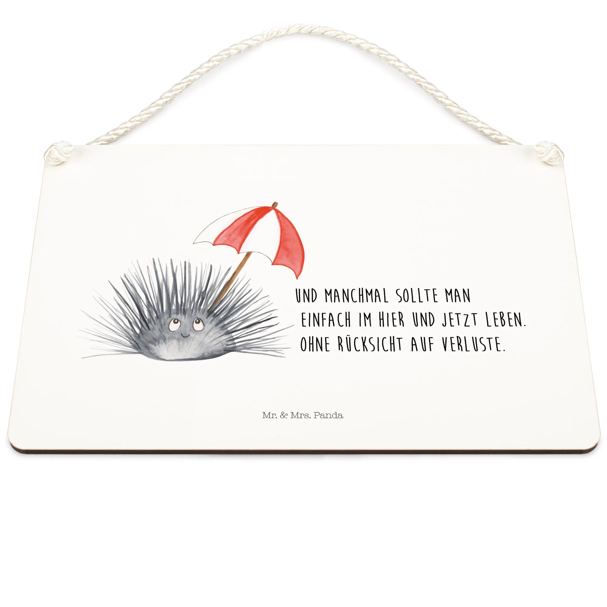 Das Deko Schild mit dem süßen Seeigel-Motiv aus der Meerestiere-Kollektion von Mr. & Mrs. Panda ist der perfekte Begleiter für alle, die das Leben in vollen Zügen genießen und sich an den kleinen Dingen des Lebens erfreuen möchten. Mit dem Spruch „Und manchmal sollte man einfach im Hier und Jetzt leben. Ohne Rücksicht auf Verluste.“ regt es zum Nachdenken an und erinnert uns, wie wichtig es ist, im Moment zu leben. Dieses liebevoll gestaltete Holzschild zeigt einen freundlichen Seeigel mit großen, leuchtenden Augen und einem sanften Lächeln, der einen roten, gestreiften Schirm hält. Die verspielte Verbindung von Motiv und Text macht das Schild zu einer charmanten Dekoration für dein Zuhause.