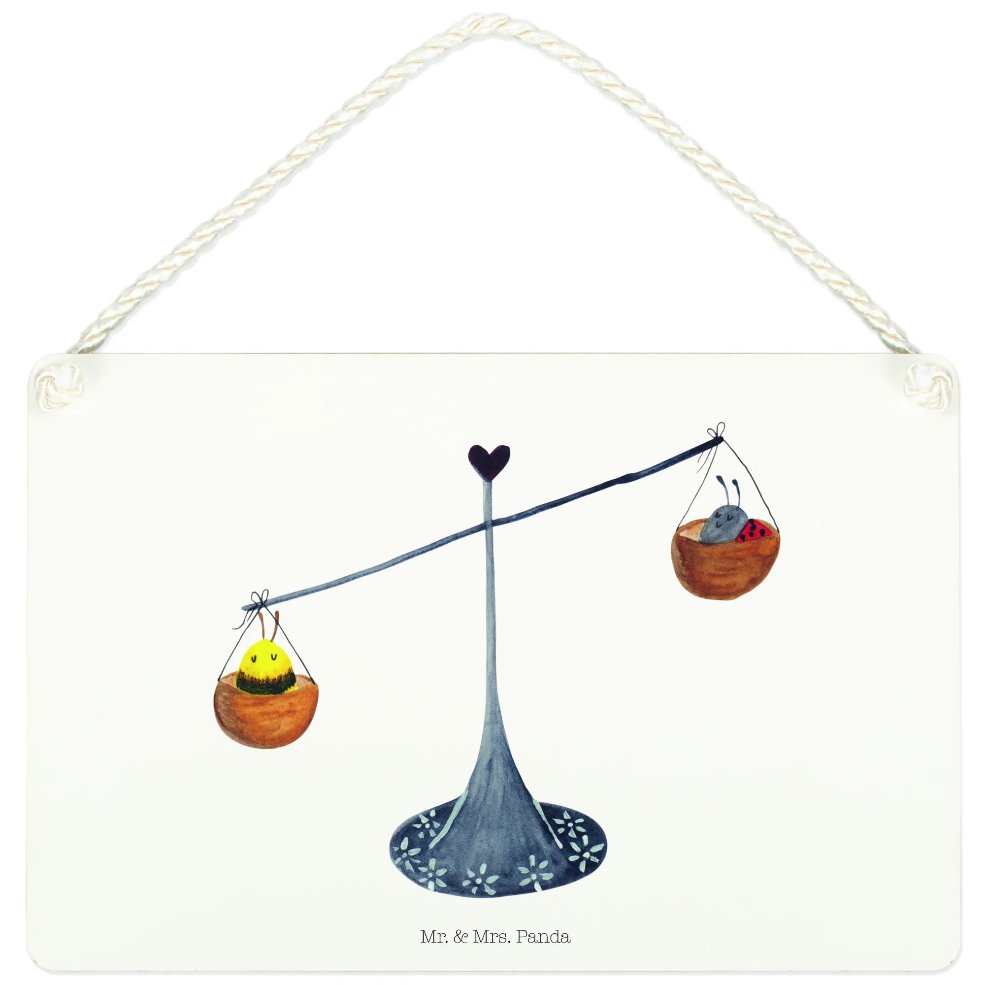 Das Deko Schild 'Sternzeichen Waage' von Mr. & Mrs. Panda ist die perfekte Geschenkidee für alle Waagen-Geborenen. Mit ihrem charmanten und warmherzigen Design verkörpert das Schild die Balance und Harmonie, die das Sternzeichen Waage ausmacht. Das Bild zeigt eine süße Waage, auf der links ein Marienkäfer und rechts eine Hummel sitzen. Beide Tiere wiegen gleich viel – sie symbolisieren das Gleichgewicht, das Waagen so sehr schätzen.