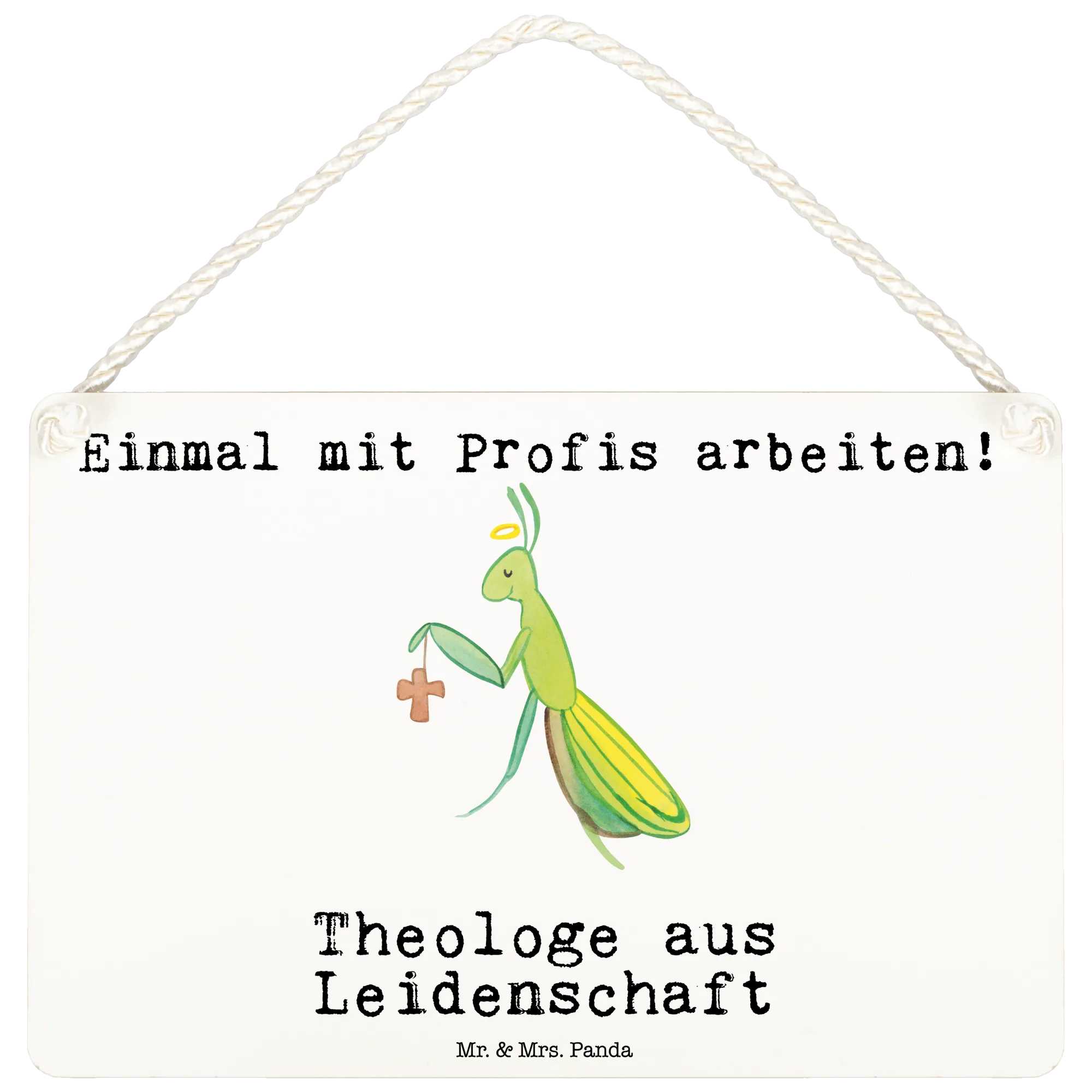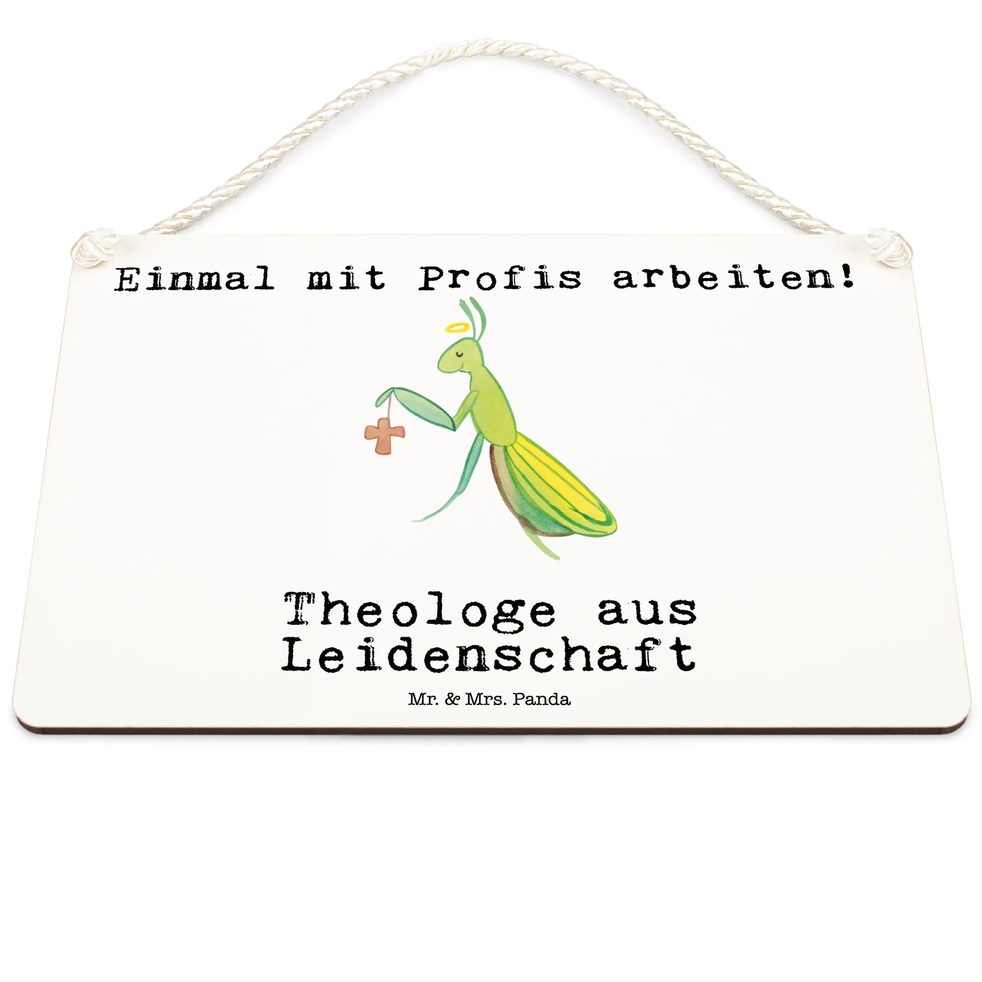 Das Deko Schild "Theologe aus Leidenschaft" von Mr. & Mrs. Panda ist das perfekte Geschenk für all jene, die die Theologie lieben und in diesem Beruf arbeiten. Mit einer süßen Gottesanbeterin, die einen Heiligenschein über dem Kopf trägt und ein Kreuz in der Hand hält, bringt dieses dekorative Schild Charm und Persönlichkeit in jedes Zuhause oder Büro.
