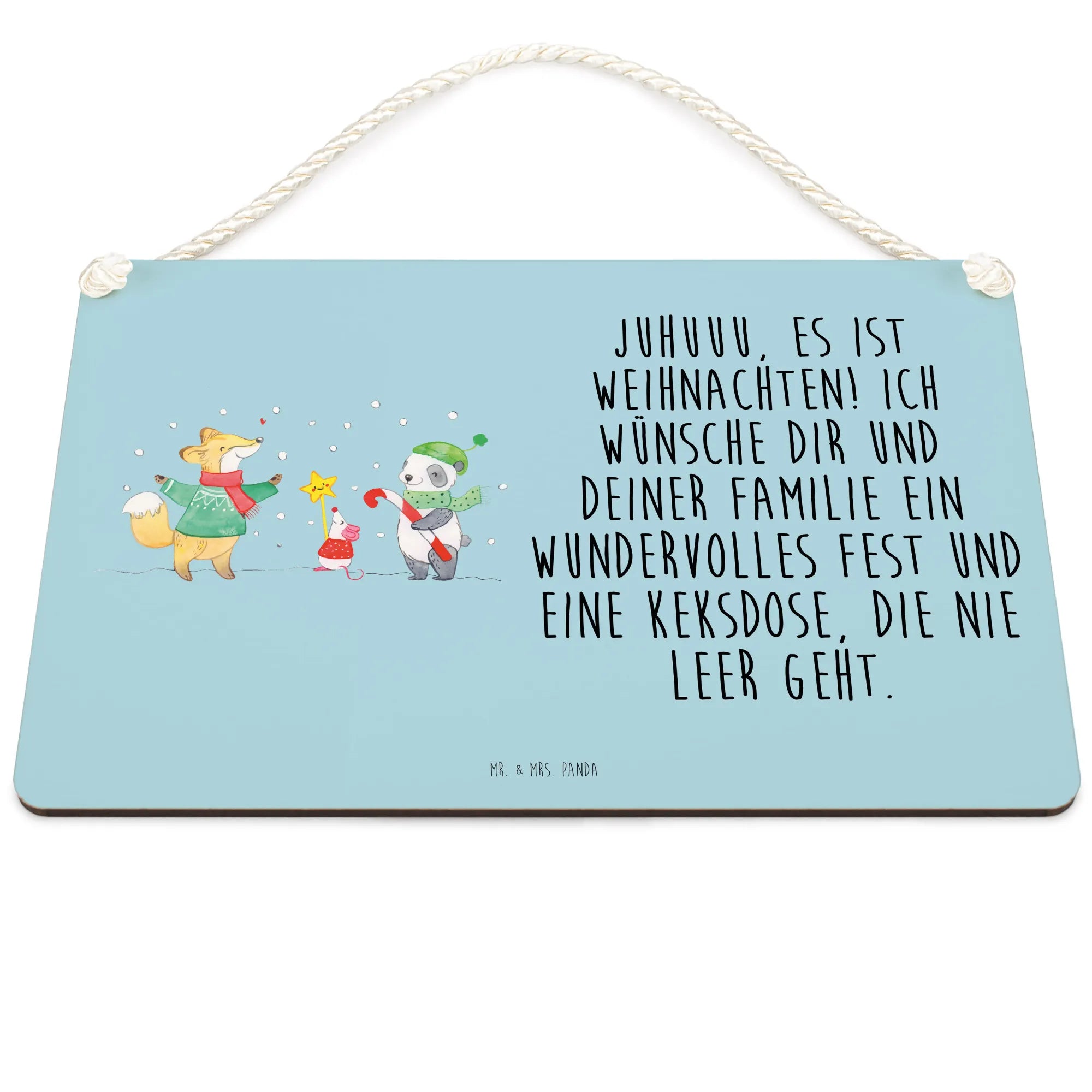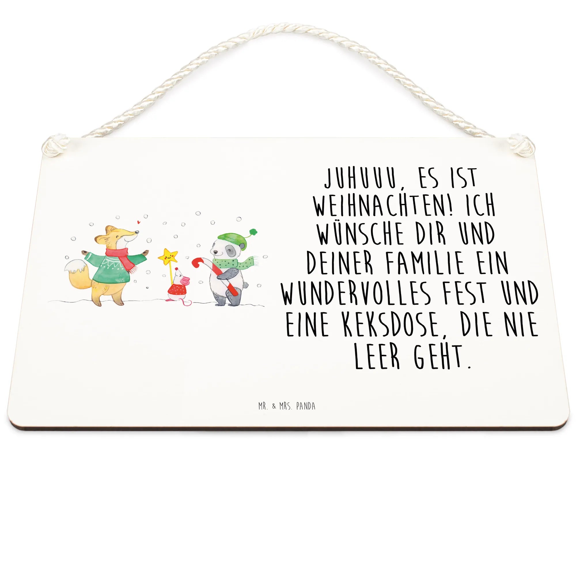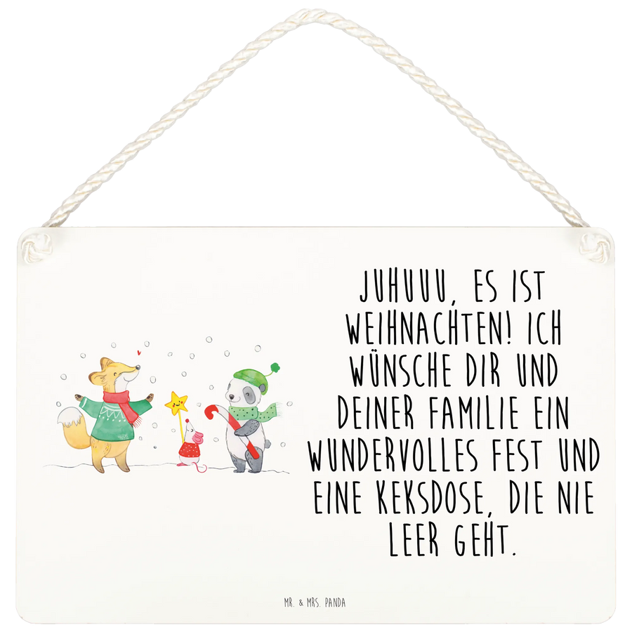 Das Deko Schild "Winter Weihnachtsfreude" von Mr. & Mrs. Panda ist das perfekte Geschenk für die besinnliche Zeit des Jahres. Mit seinem liebevollen Motiv eines Fuchses, einer Maus und einem Panda, die erwartungsvoll im Schnee stehen, bringt dieses Schild Weihnachtsfreude in jedes Zuhause. Das fröhliche Design wird von dem zauberhaften Slogan "Juhuuu, es ist Weihnachten! Ich wünsche dir und deiner Familie ein wundervolles Fest und eine Keksdose, die nie leer geht." begleitet.