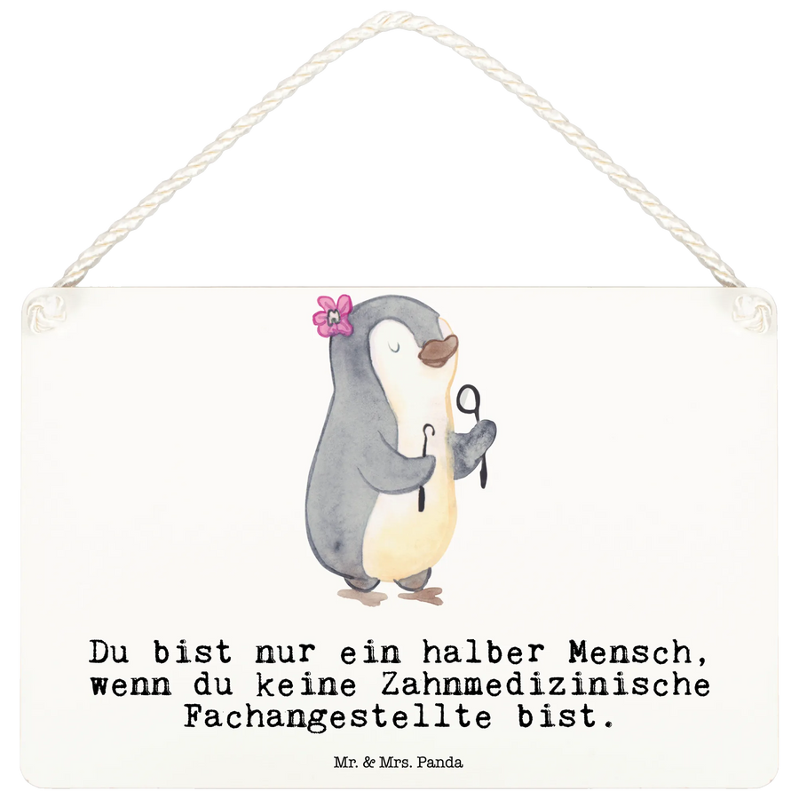 Das Design zeigt einen süßen Pinguin mit den nötigen Werkzeugen, um die Zähne zu überprüfen, und wird von dem kreativen Slogan 'Du bist nur ein halber Mensch, wenn du keine Zahnmedizinische Fachangestellte bist.' ergänzt. Dieses Schild ist das ideale Geschenk zum Berufsabschied, Jubiläum oder einfach als kleine Aufmerksamkeit zwischendurch.