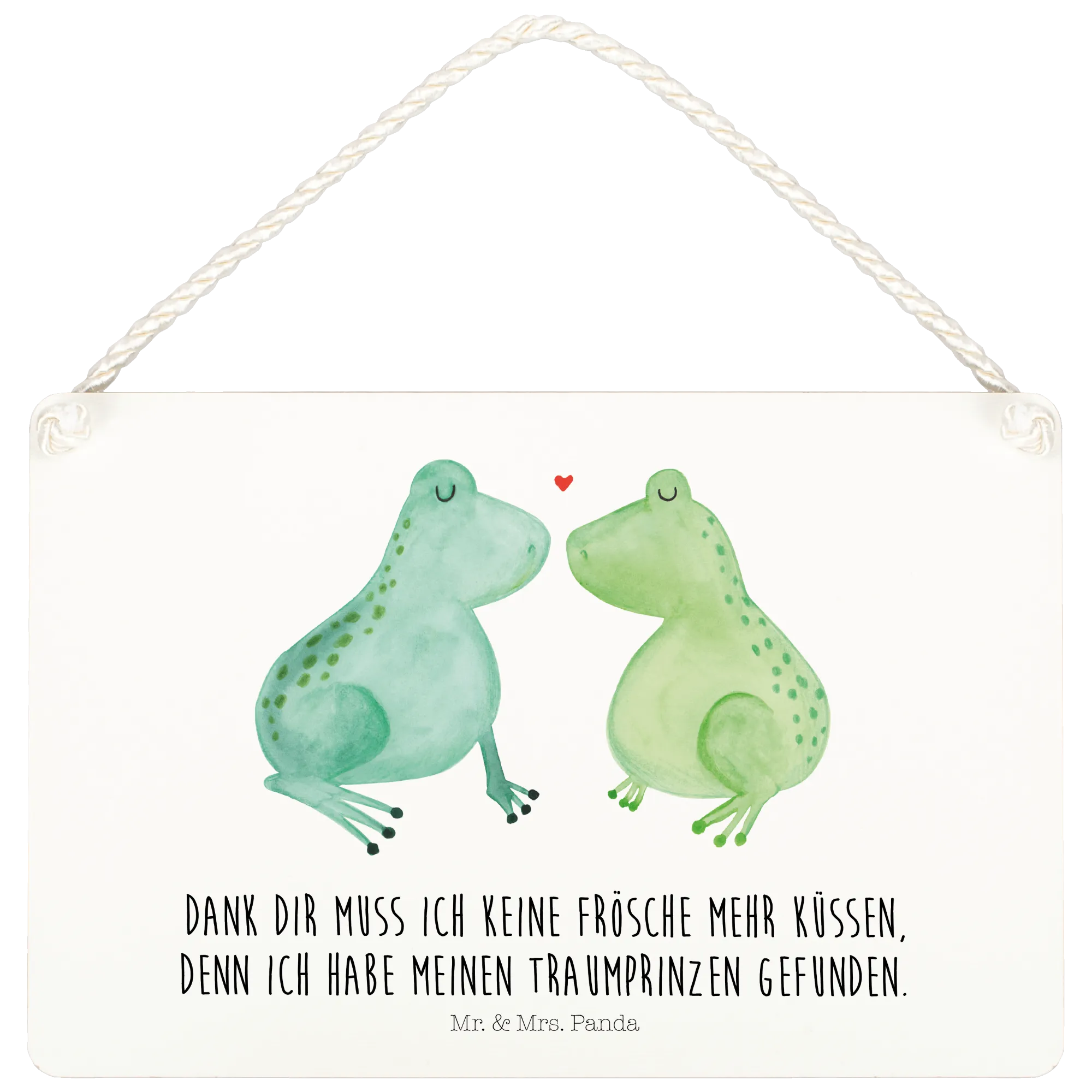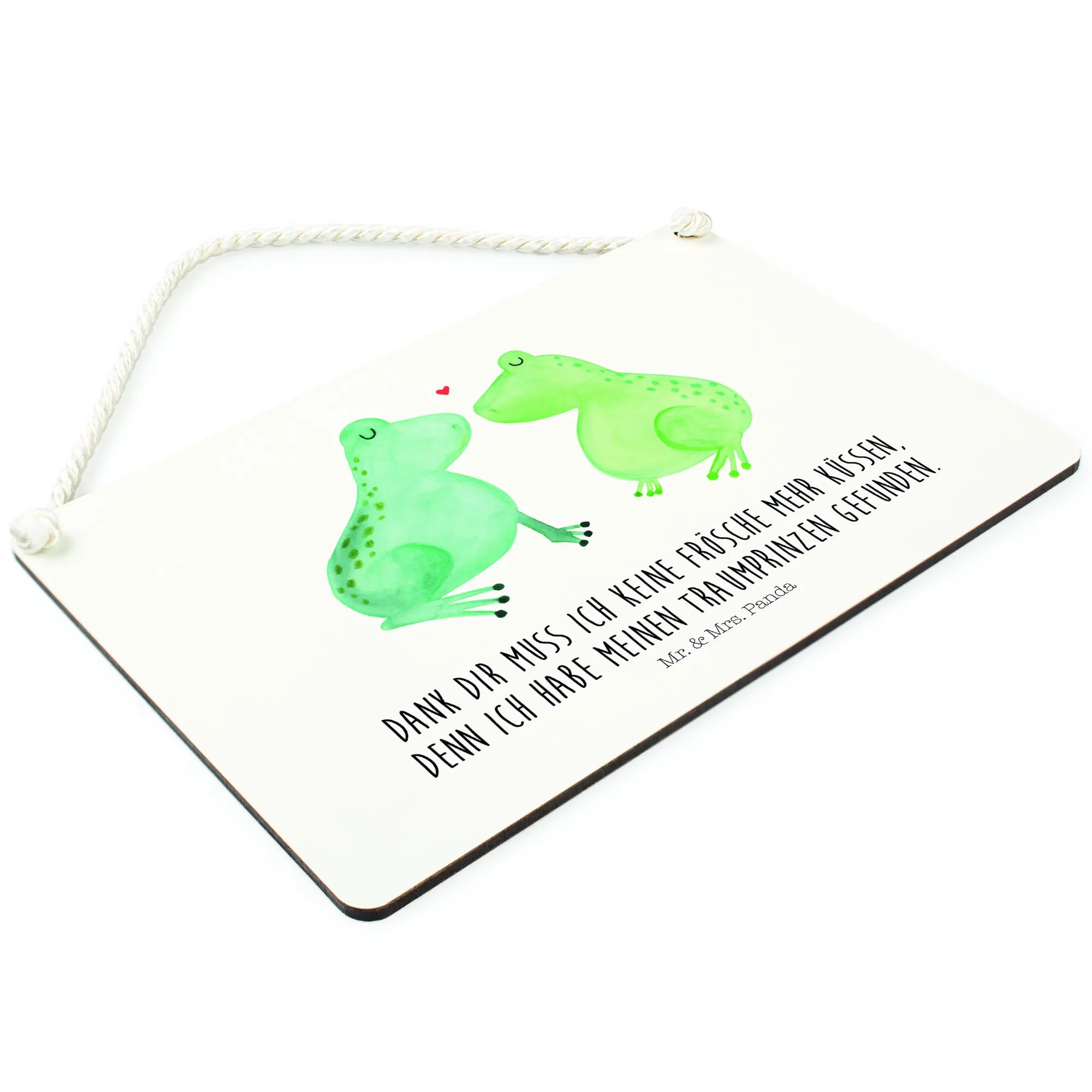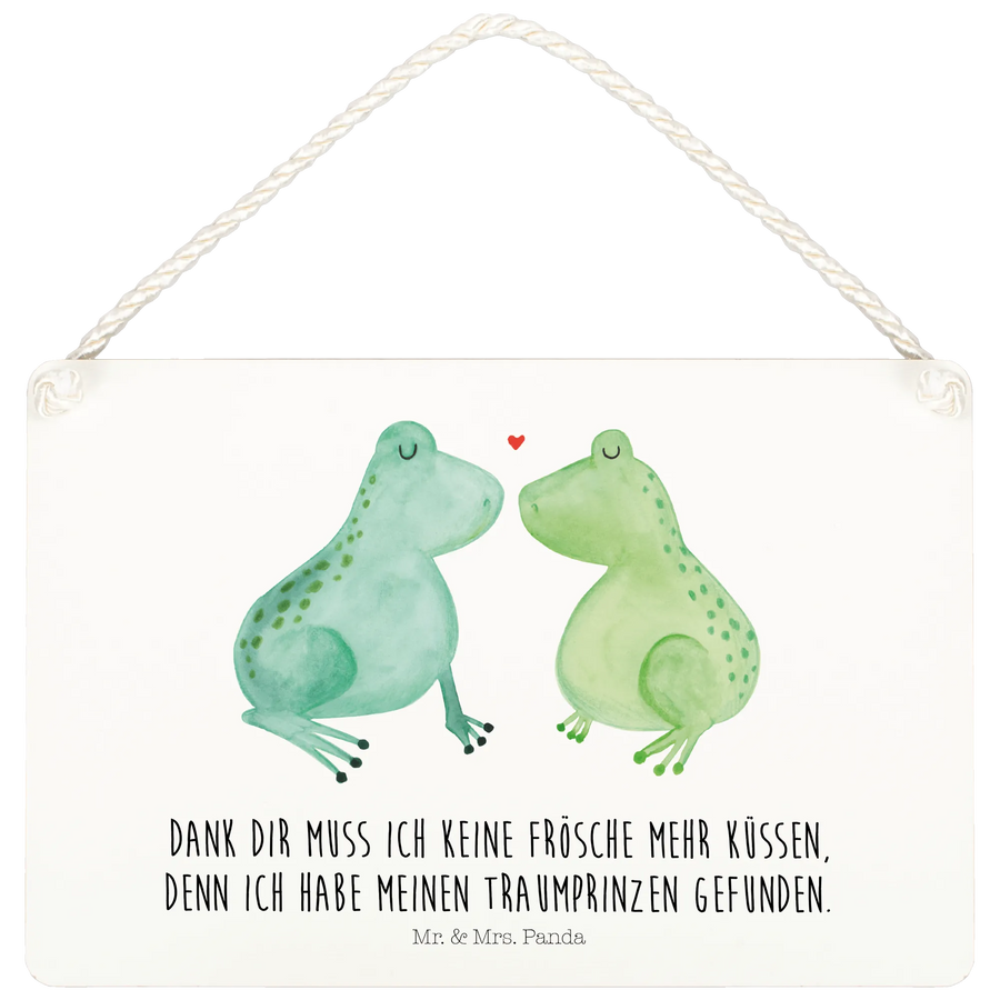 Das Deko Schild "Frosch Liebe" von Mr. & Mrs. Panda ist das perfekte Geschenk für alle Verliebten! Ob für den Freund, die Freundin, den Ehemann oder die Ehefrau – dieses Schild bringt das Herz zum Schmelzen. Mit dem süßen Slogan "Dank dir muss ich keine Frösche mehr Küssen, denn ich habe meinen Traumprinzen gefunden", wird jeder Liebesbeweis zu etwas ganz Besonderem.