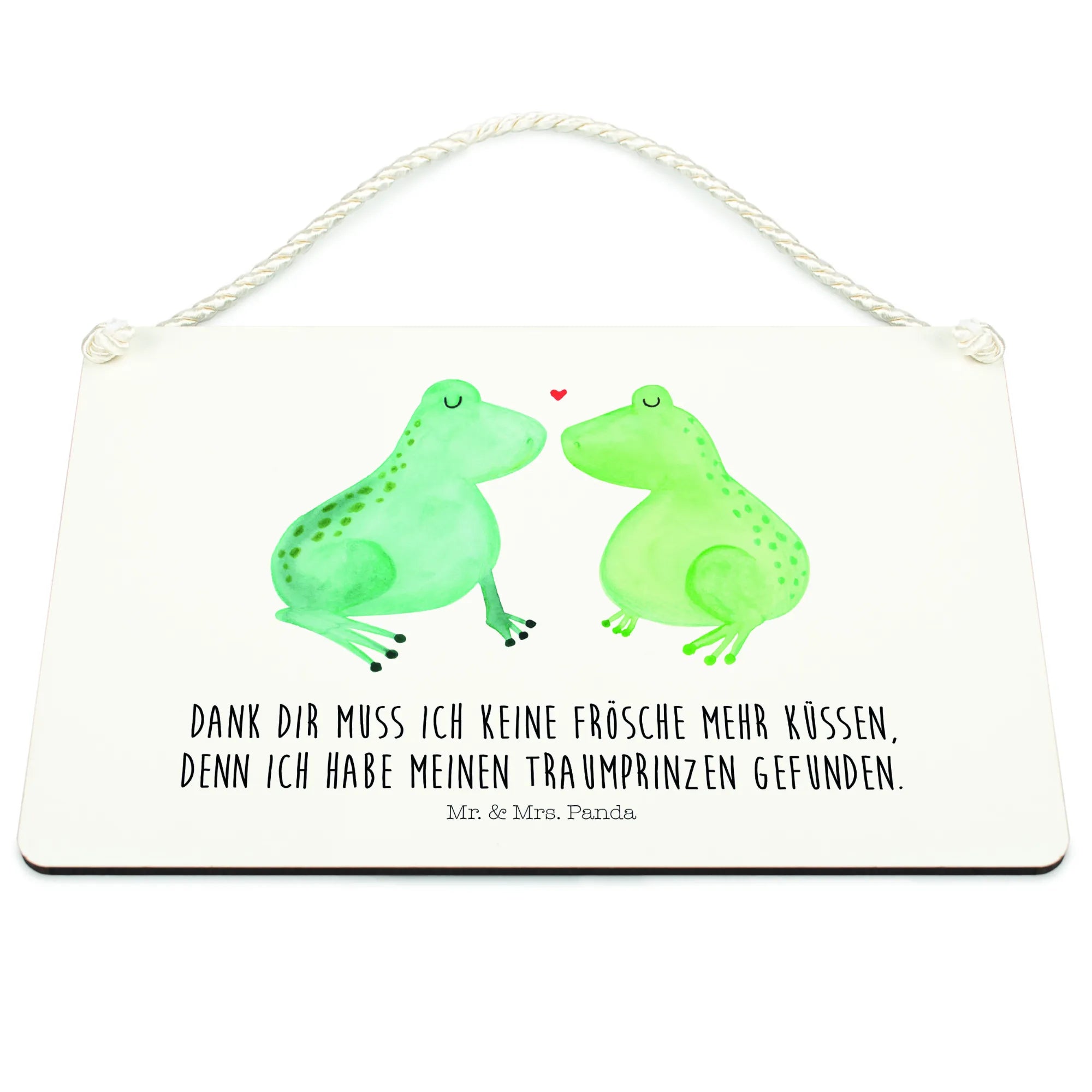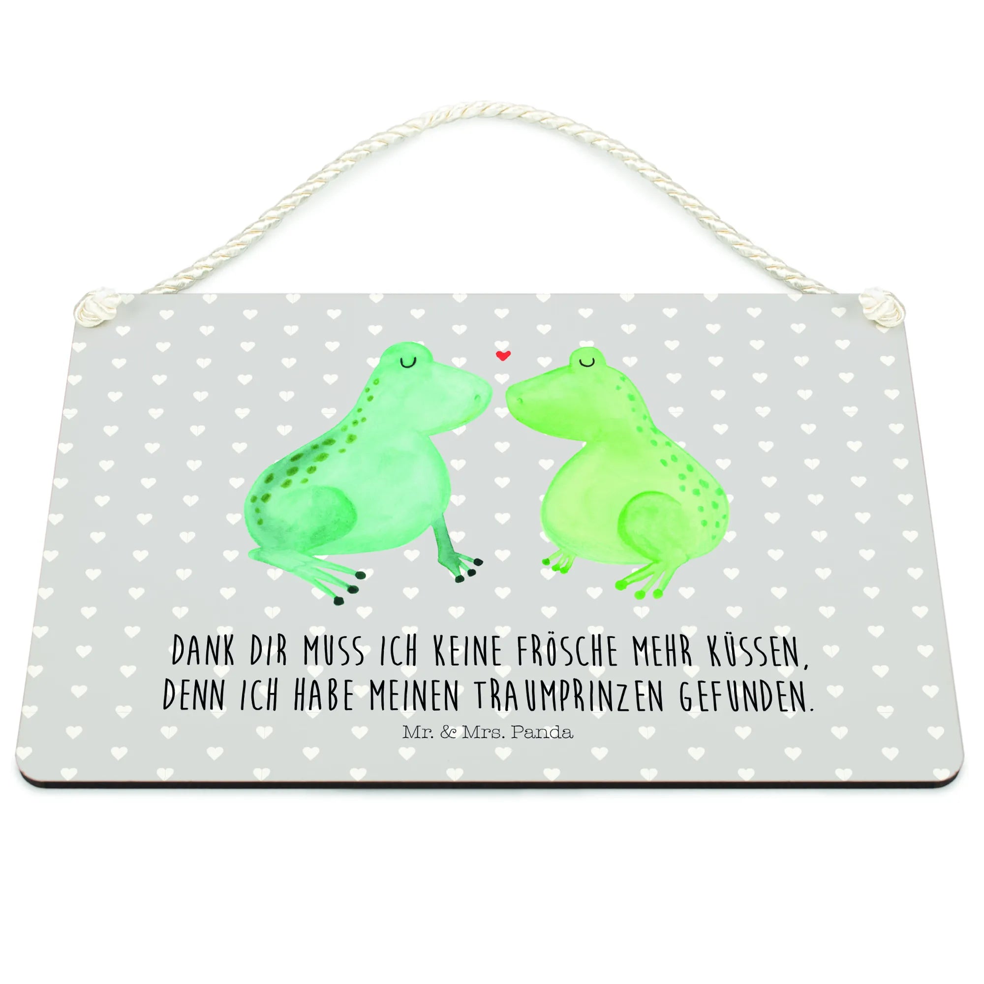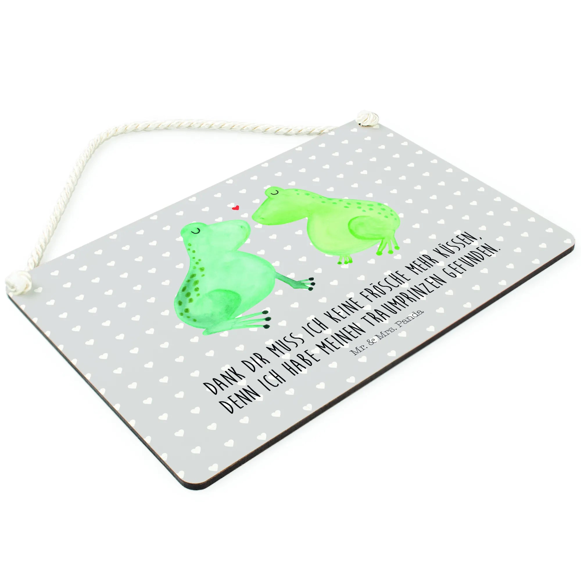 Das Deko Schild "Frosch Liebe" von Mr. & Mrs. Panda ist das perfekte Geschenk für alle Verliebten! Ob für den Freund, die Freundin, den Ehemann oder die Ehefrau – dieses Schild bringt das Herz zum Schmelzen. Mit dem süßen Slogan "Dank dir muss ich keine Frösche mehr Küssen, denn ich habe meinen Traumprinzen gefunden", wird jeder Liebesbeweis zu etwas ganz Besonderem.