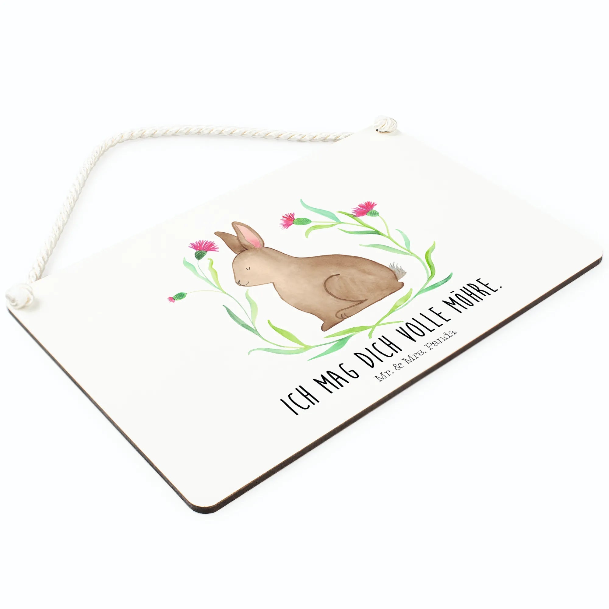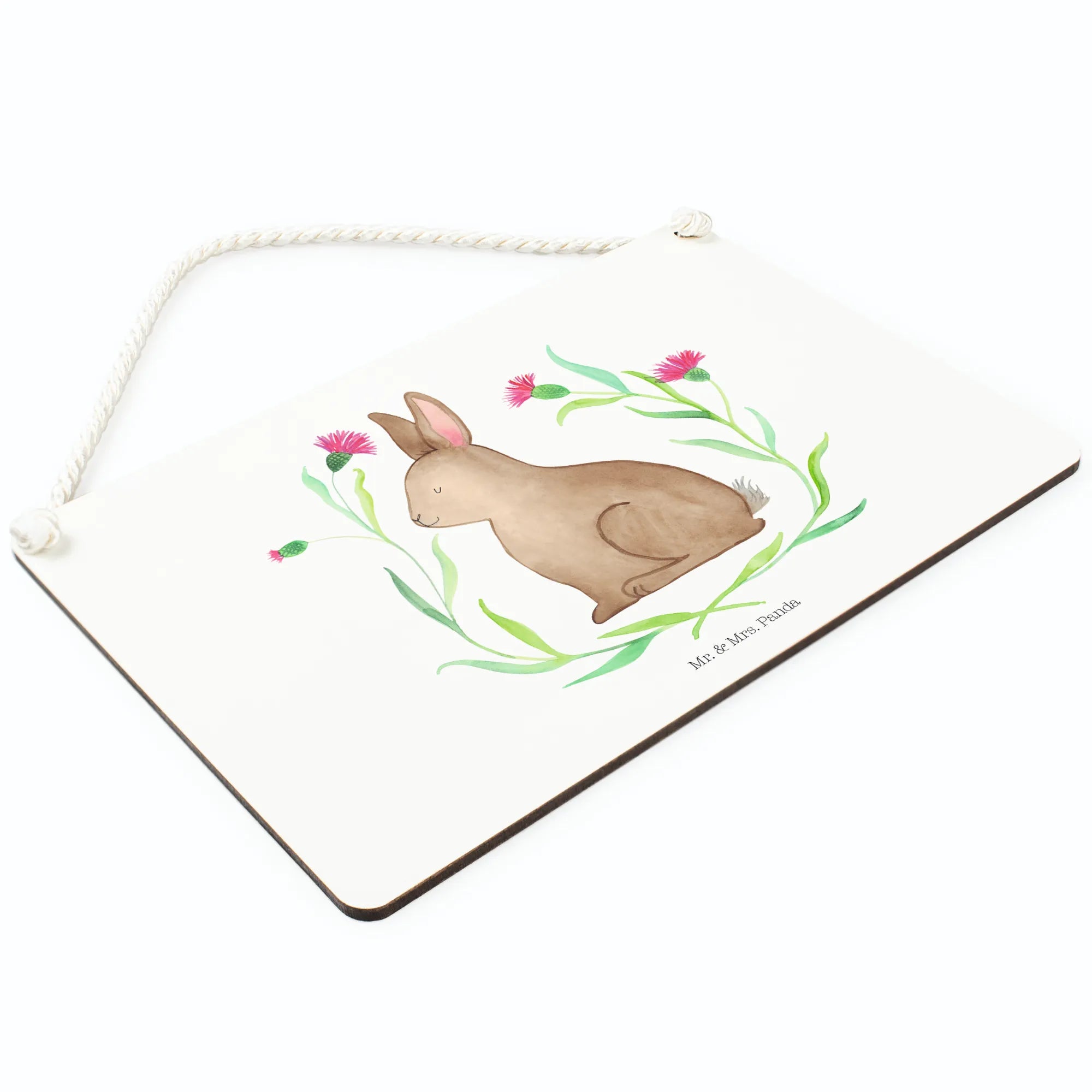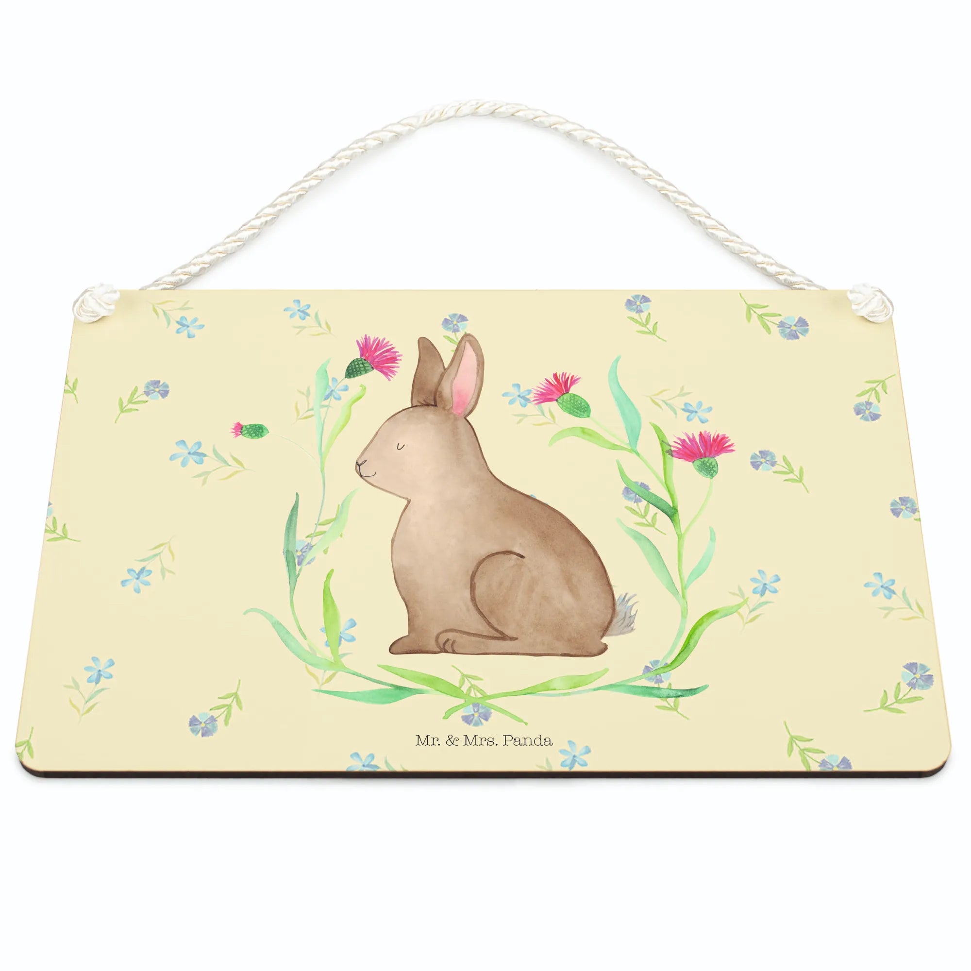 Vielseitig & langlebig: Das Schild kommt mit einer gedrehten Kordel zum Aufhängen und einer beschichteten Oberfläche, die den edlen Druck schützt. So bleibt dein Hase sitzend lange schön und macht in Küche, Flur, Wohnzimmer oder im Gartenbereich eine gute Figur.