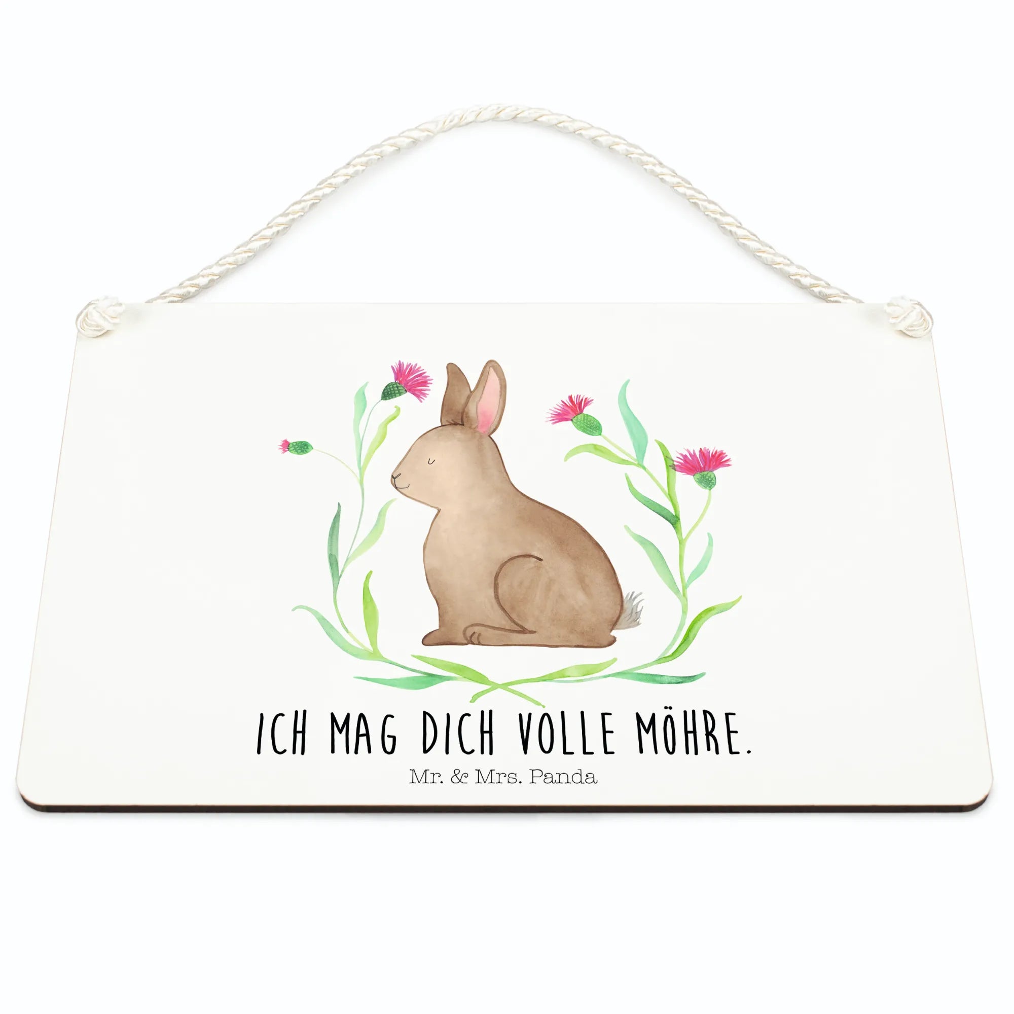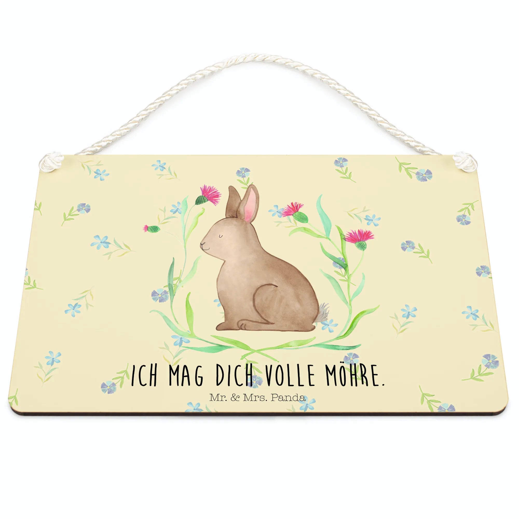 Mr. & Mrs. Panda Deko Schild „Hase sitzend“ – ein zauberhaftes Stück Osterdeko für dein Zuhause. Unser kleines Hasenmotiv sitzt glücklich zwischen bunten Blumen und bringt das warme Gefühl von Frühling direkt an deine Wand. Der liebevolle Spruch „Ich mag dich volle Möhre.“ macht das Schild zu einem charmanten, persönlichen Geschenk.