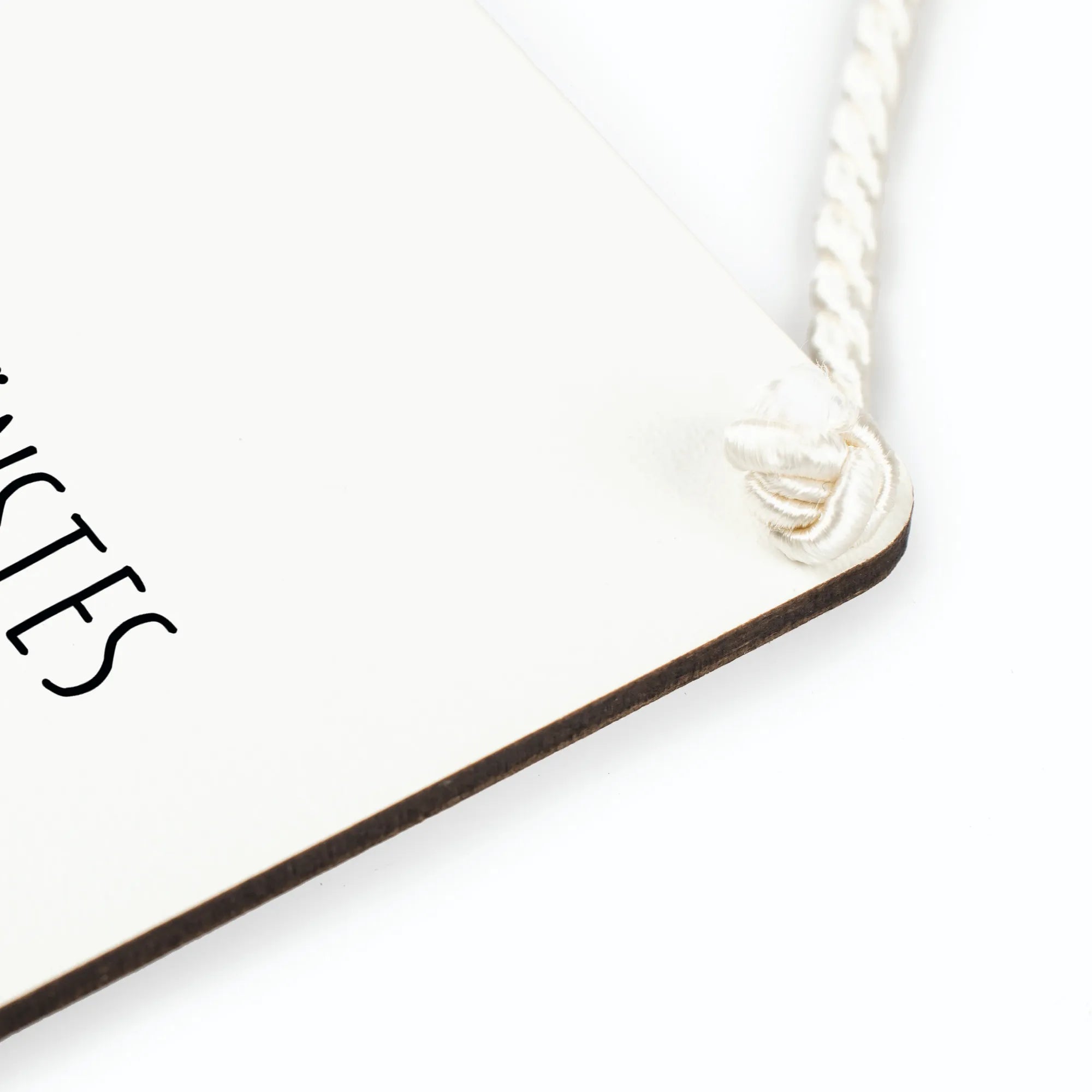 Das Schild misst DIN A4 und hat eine edle, beschichtete Holzfaser-Oberfläche, die nicht nur langlebig ist, sondern auch jedem Raum ein stilvolles Flair verleiht. Zudem wird das Schild mit einer wunderschön gedrehten Kordel zur Aufhängung geliefert, sodass du direkt mit der Dekoration beginnen kannst.