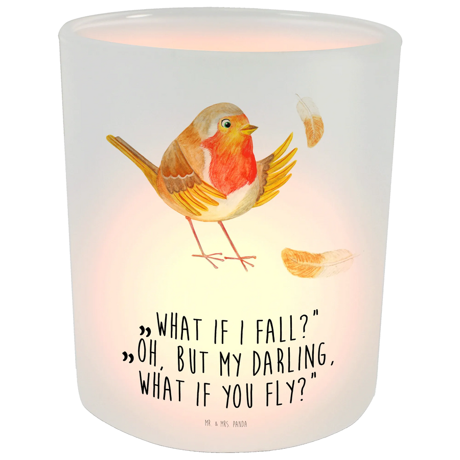 Das satiniertes Glas schützt nicht nur vor Wind, sondern lässt auch das Kerzenlicht zauberhaft hindurchscheinen. Das Design zeigt ein süßes Rotkehlchen, das liebevoll von Mr. & Mrs. Panda handgezeichnet wurde. Umgeben von bunten Feder strahlt der kleine Vogel eine friedliche Ruhe aus, die dich beim Anblick zum Verweilen und Träumen einlädt.