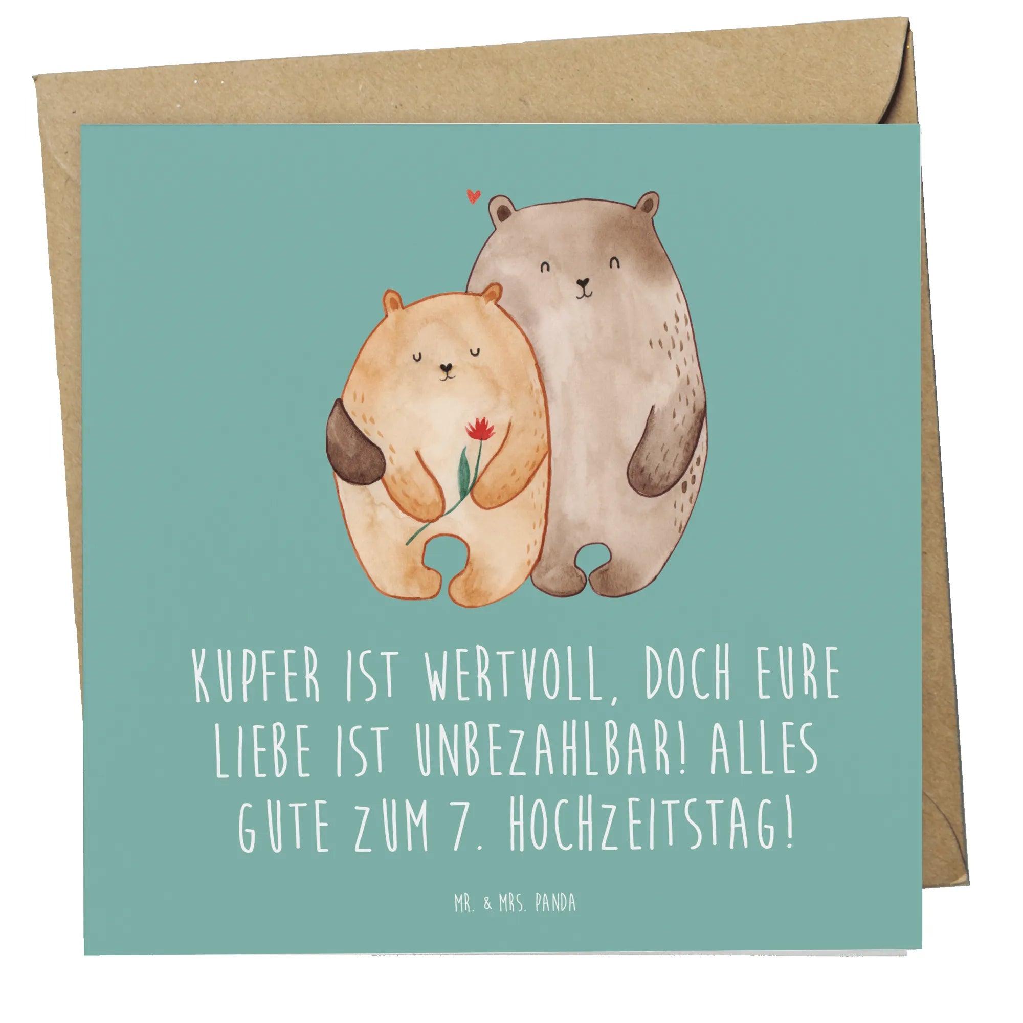 Die Deluxe Karte zum 7. Hochzeitstag Kupferhochzeit von Mr. & Mrs. Panda ist das perfekte Geschenk für all jene, die einen besonderen, romantischen Moment zelebrieren möchten. Diese hochwertige Klappkarte ist nicht nur ein einfacher Gruß, sondern ein liebevoll gestaltetes Kunstwerk, das deine Glückwünsche zum Ausdruck bringt. Mit dem Slogan 'Kupfer ist wertvoll, doch eure Liebe ist unbezahlbar! Alles Gute zum 7. Hochzeitstag!' kannst du das Herz deines Partners oder das der frisch Vermählten im Handumdrehen erwärmen.