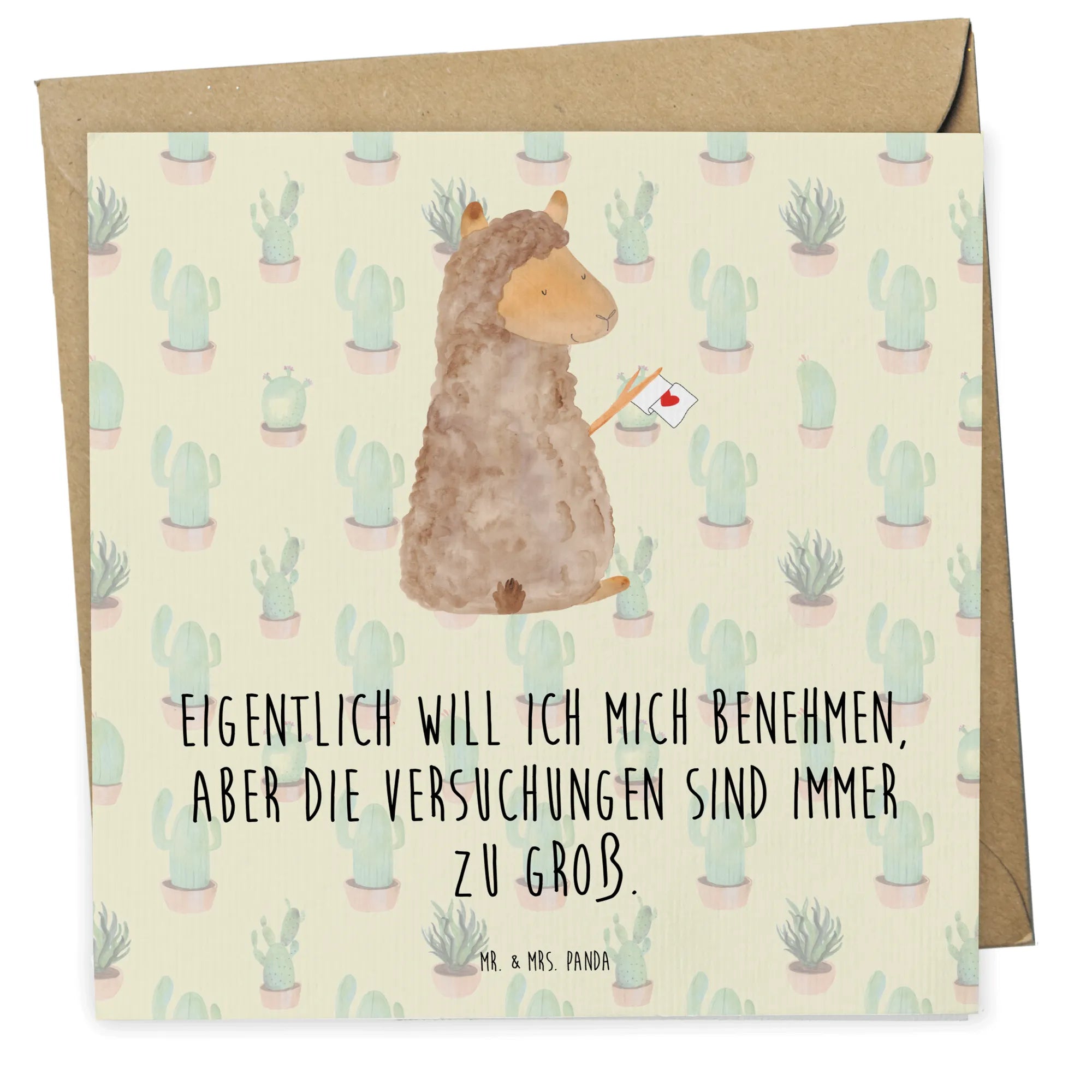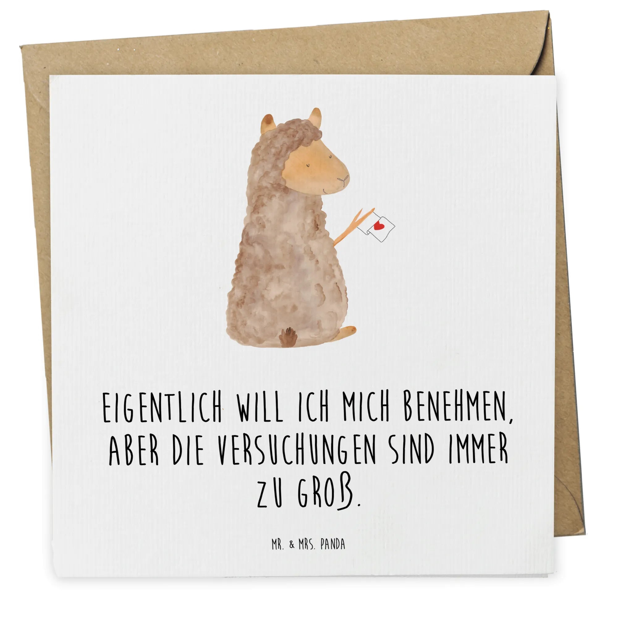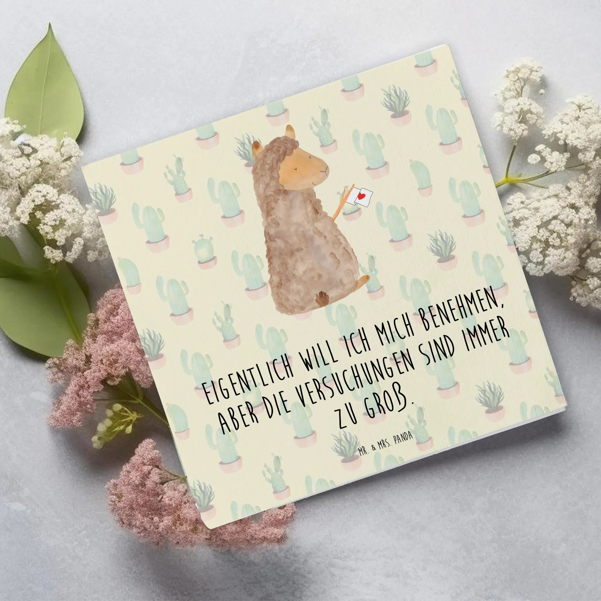 Schmücke ein Zuhause mit dieser herzlichen Karte oder nutze sie für eine Einladung zu Deiner nächsten Feier. Die süße Botschaft „Eigentlich will ich mich benehmen, aber die Versuchungen sind immer zu groß“ unterstreicht das charmante Design und gibt der Karte eine persönliche Note! Verschenke Freude und eine positive Botschaft – mit der Deluxe Karte Alpaka Fahne von Mr. & Mrs. Panda liegst Du immer richtig und bringst das Herz Deiner Liebsten zum Leuchten. Sei es für Dich selbst oder als Geschenk, die Alpaka Karte ist ein absoluter Geheimtipp für Alpakaliebhaber und lässt jedes Herz höher schlagen.