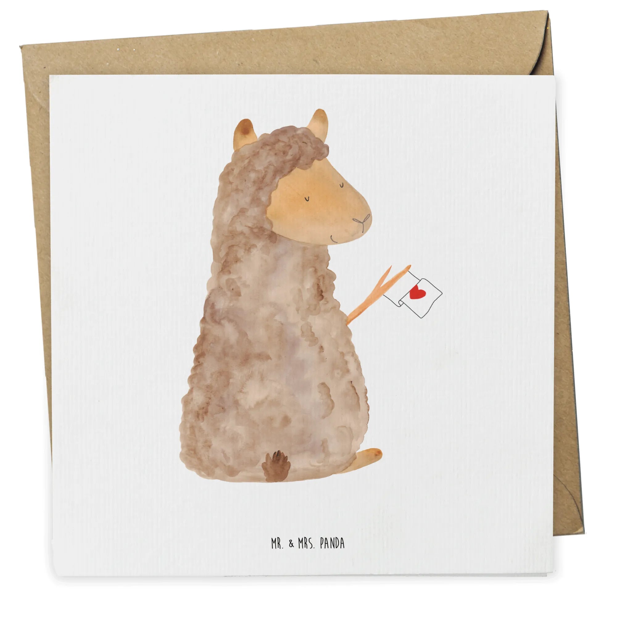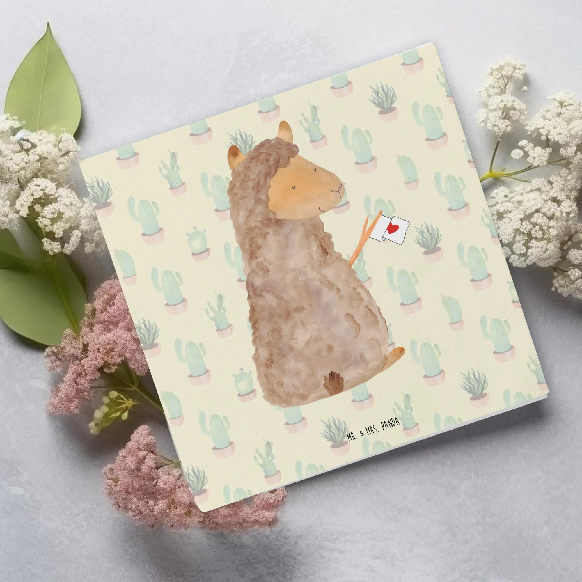 Die Deluxe Karte Alpaka Fahne von Mr. & Mrs. Panda ist das perfekte Geschenk für alle, die das Besondere lieben! Egal, ob zum Geburtstag, zur Hochzeit, zu Jubiläen oder einfach nur um einem lieben Menschen eine Freude zu machen – diese hochwertige Klappkarte sorgt garantiert für Lächeln! Die tolle, handgezeichnete Illustration eines fröhlichen Alpakas mit einer Fahne, die ein Herz ziert, strahlt pure Lebensfreude aus und versprüht gute Laune.