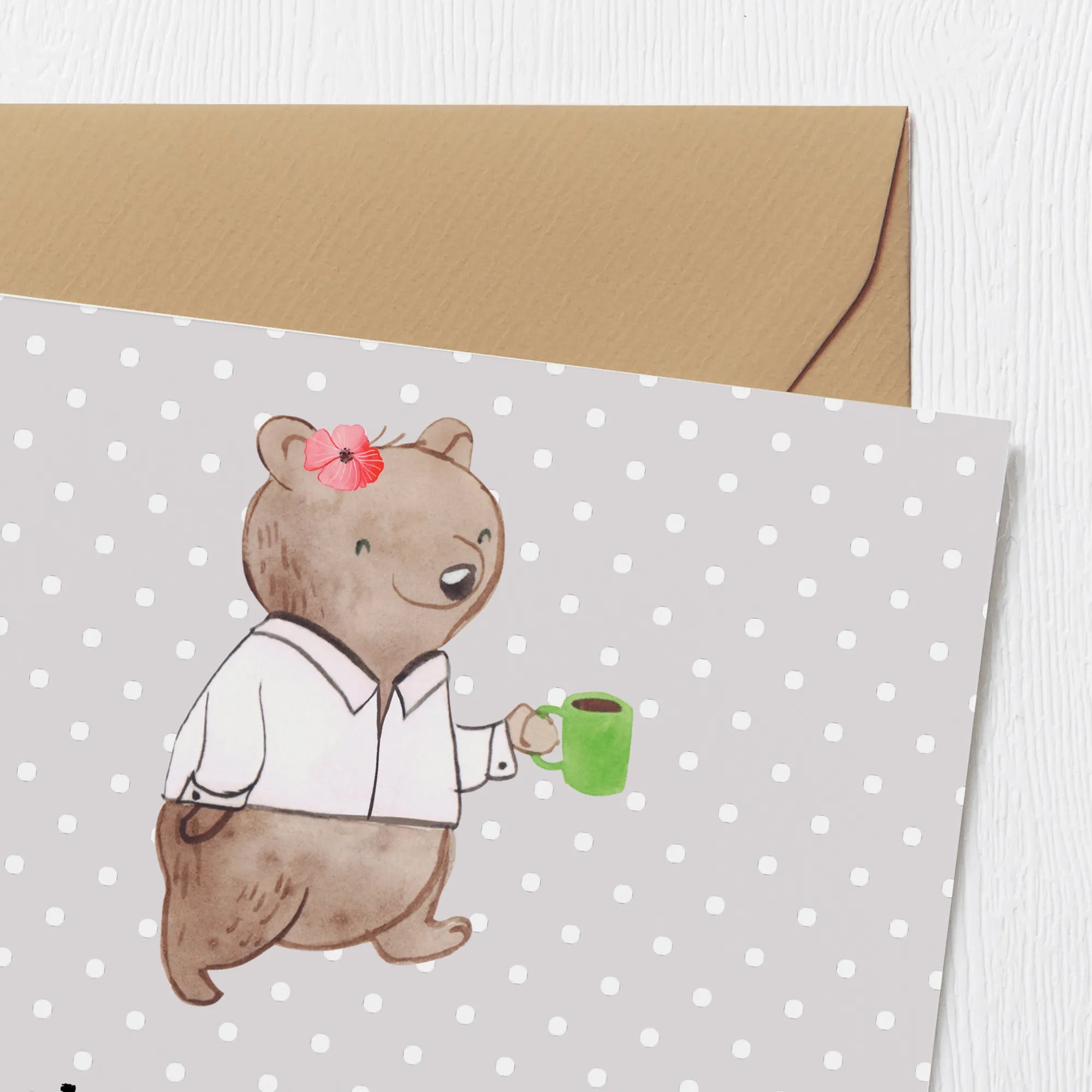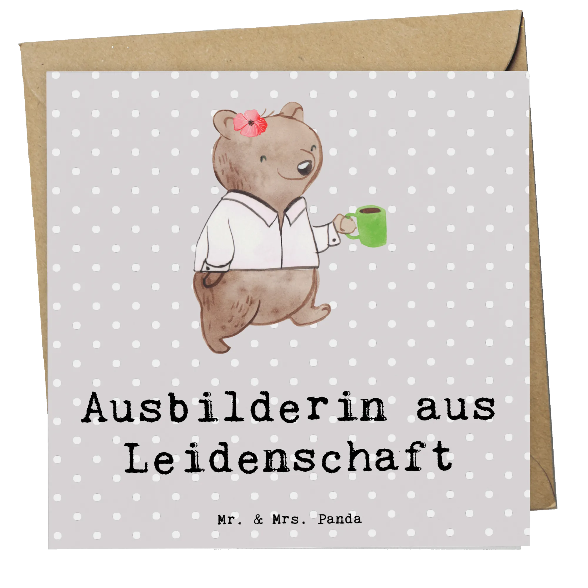 Die Vorderseite der Karte ist mit einem süßen Motiv einer Ausbilderin, dargestellt durch unsere beliebte Bärendame mit einer Kaffeetasse, und dem liebevollen Schriftzug "Ausbilderin aus Leidenschaft" verziert. Der Kontrast zwischen der hochglänzenden Vorderseite und der matten Innenseite ist perfekt, um deine persönlichen Grüße oder Glückwünsche zu vermerken.