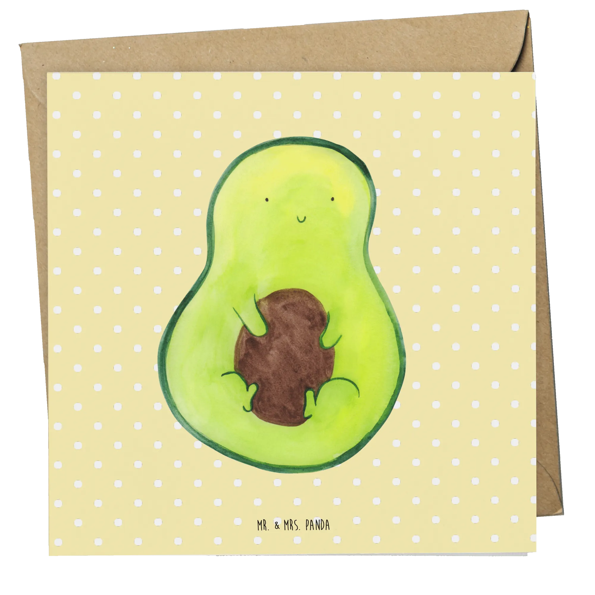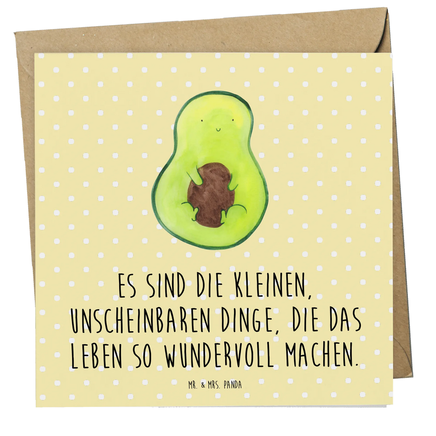 Die Deluxe Karte mit dem zauberhaften Motiv "Avocado mit Kern" aus der besonderen Avocado-Kollektion von Mr. & Mrs. Panda ist das perfekte Geschenk für all diejenigen, die das Leben mit einem Hauch von Humor und Geselligkeit würzen möchten.