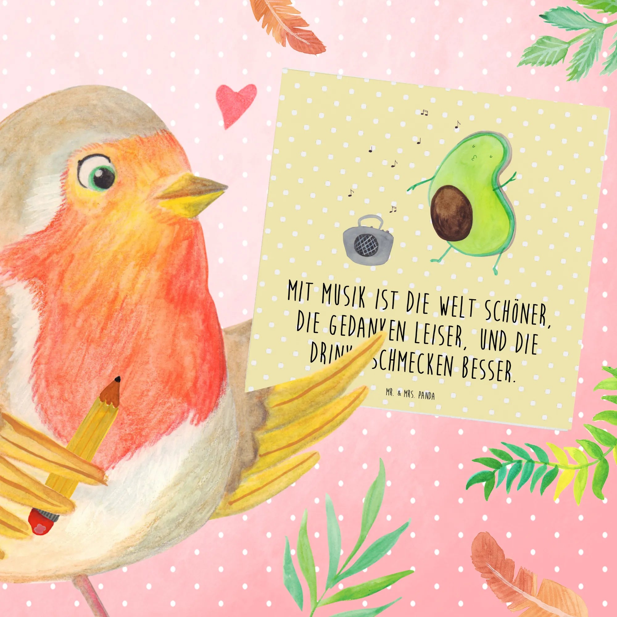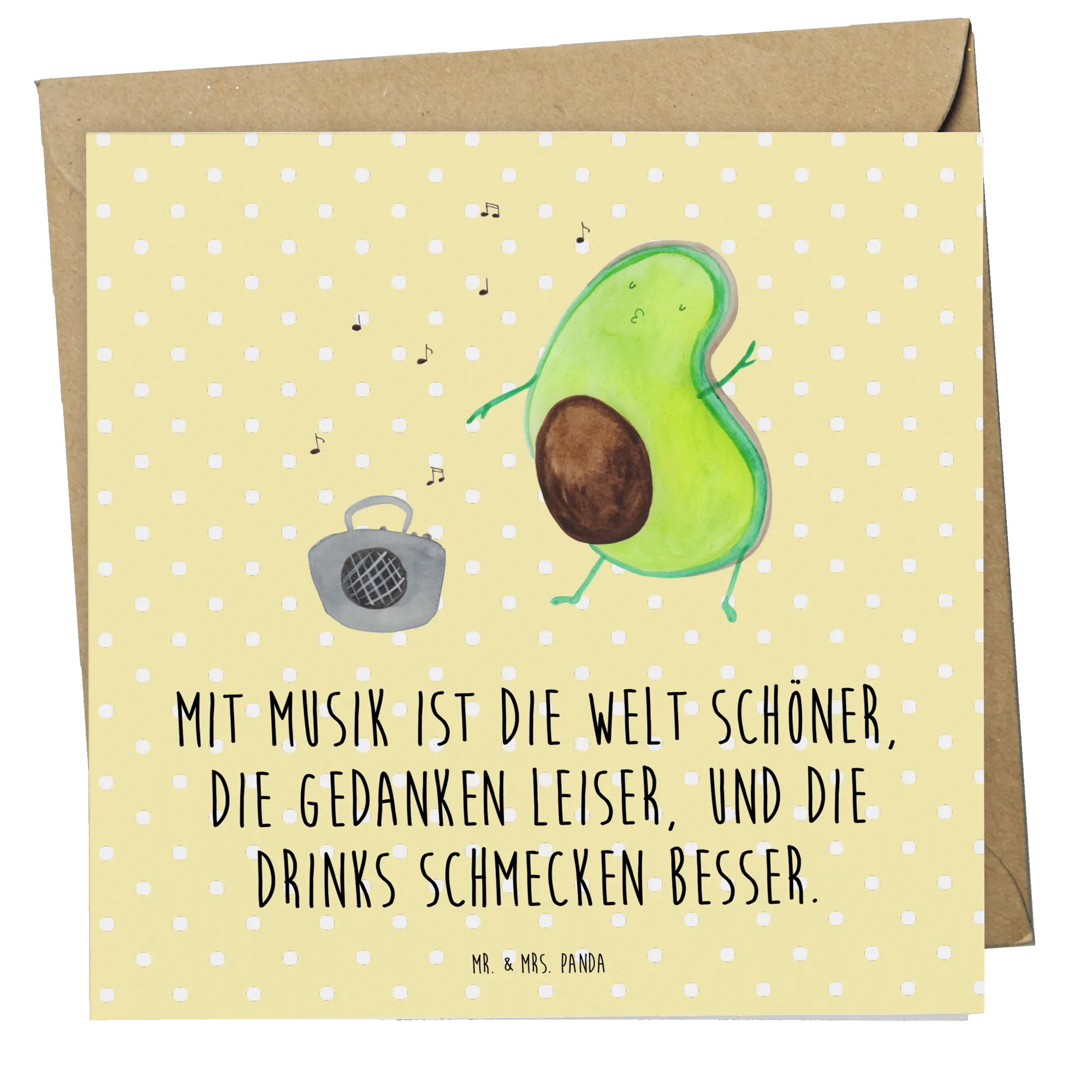Die Deluxe Karte "Avocado tanzt" aus der Avocado-Kollektion von Mr. & Mrs. Panda ist das perfekte Geschenk für all jene, die das Leben mit einer Prise Humor und einer Portion Glück feiern möchten! Diese wunderschöne und hochwertige quadratische Karte verleiht jedem besonderen Moment eine persönliche Note. Mit ihrem fröhlichen Motiv einer tanzenden Avocado, die voller Lebensfreude vor einem Ghettoblaster zur Musik tanzt, bringt sie sofort ein Lächeln ins Gesicht. Der Spruch "Mit Musik ist die Welt schöner, die Gedanken leiser, und die Drinks schmecken besser." unterstreicht die heitere Botschaft und macht die Karte zu einem echten Hingucker.