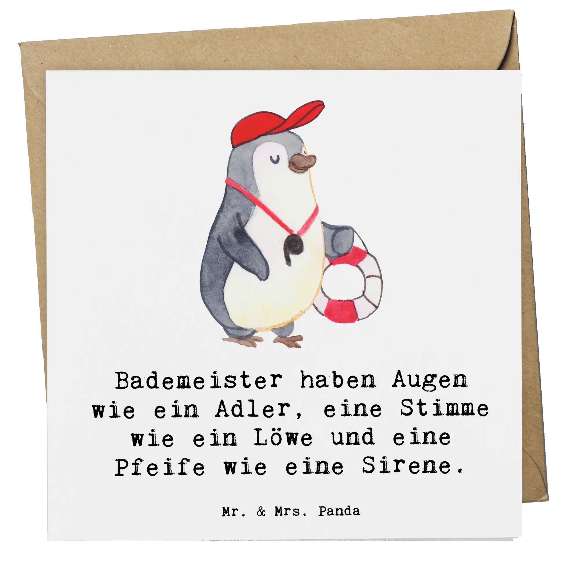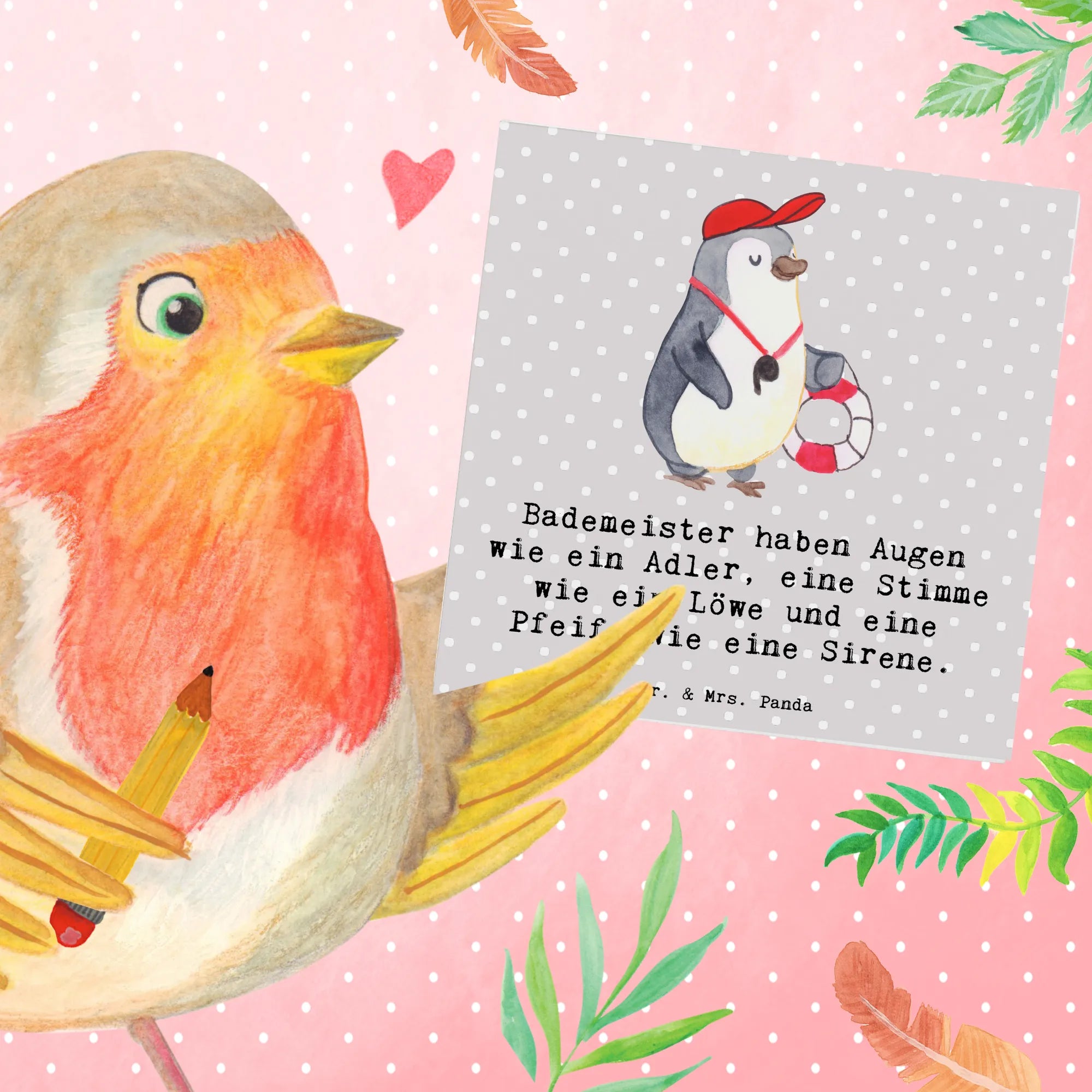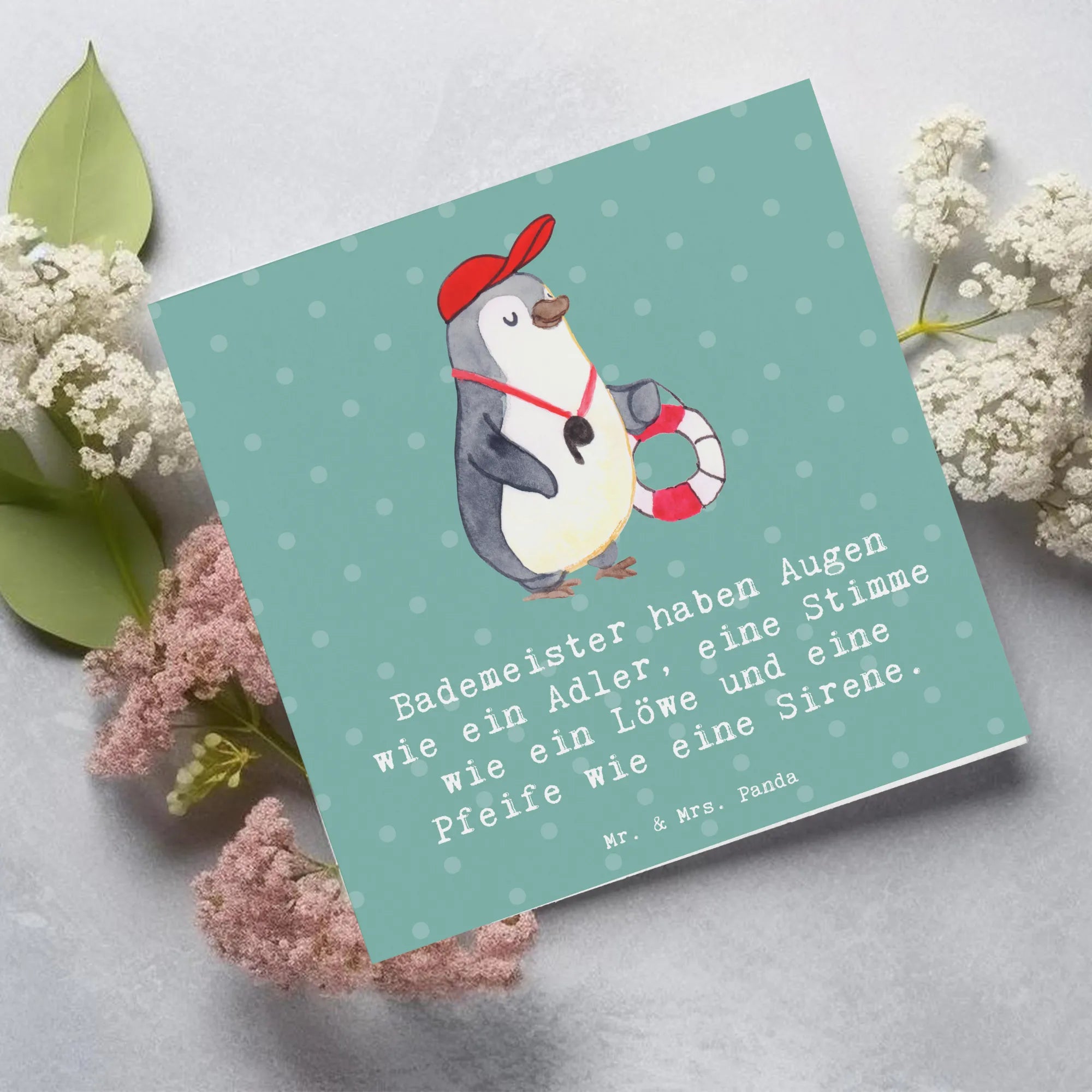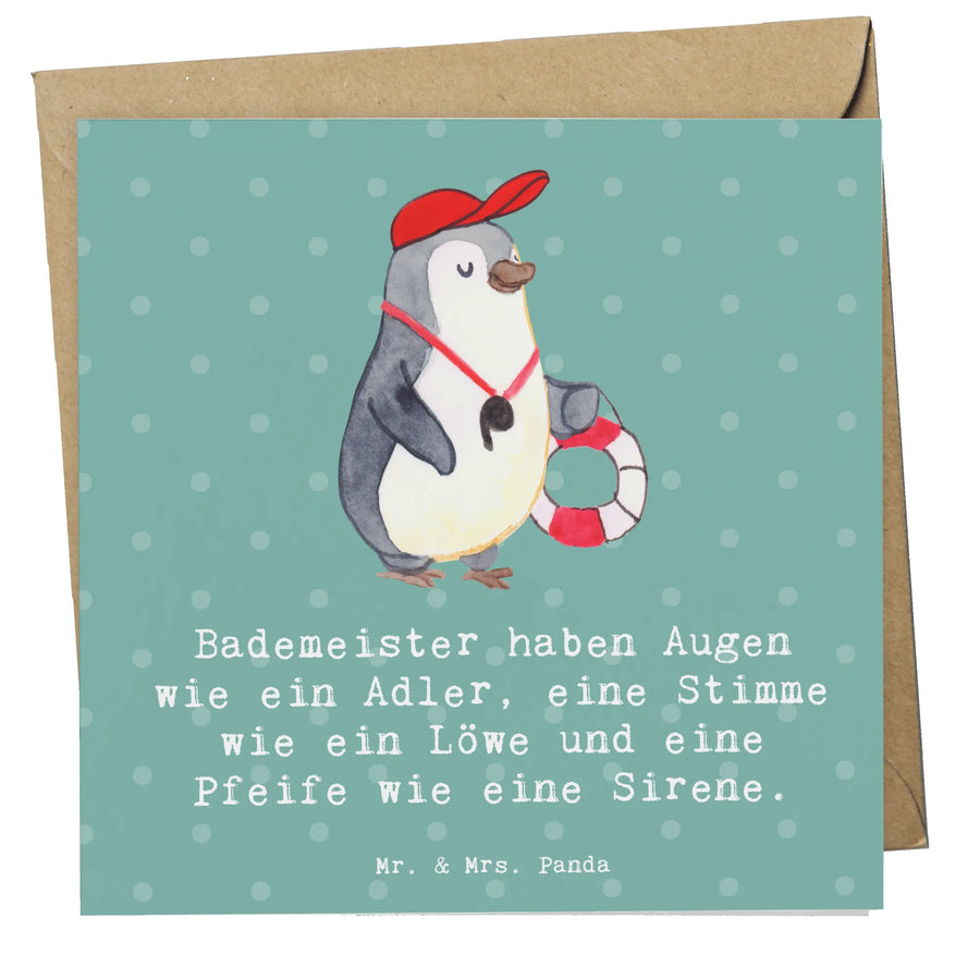Die Deluxe Karte Bademeister aus der einzigartigen Berufe-Kollektion von Mr. & Mrs. Panda ist der perfekte Gruß für alle, die im Schwimmbad, in Freizeitparks oder als Rettungsschwimmer arbeiten. Diese wunderschöne und besonders hochwertige quadratische Karte misst 140 mm x 140 mm und besteht aus edlem 300 Gramm Karton.