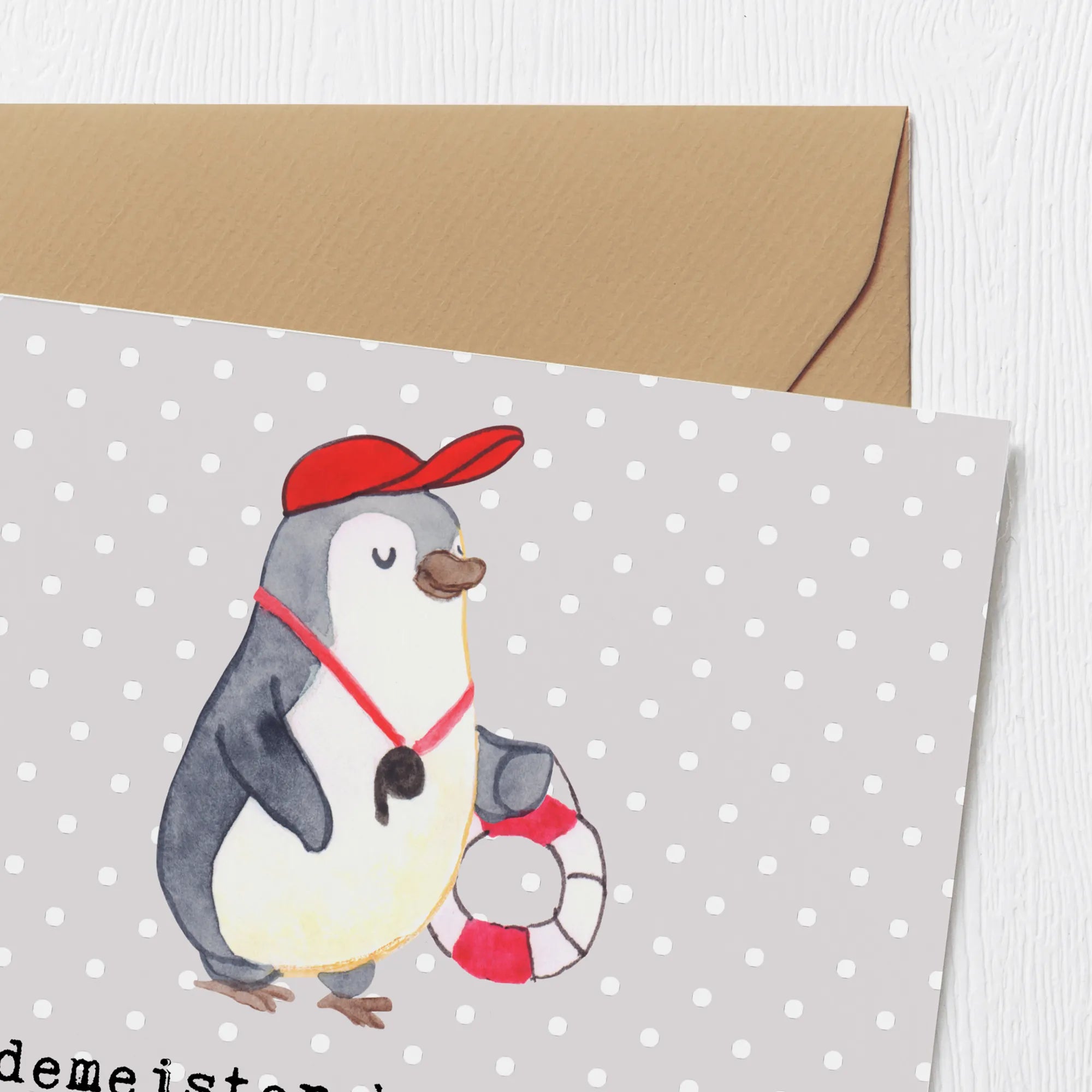 Auf der Vorderseite prankt der kreative Spruch: "Bademeister haben Augen wie ein Adler, eine Stimme wie ein Löwe und eine Pfeife wie eine Sirene." Damit kannst du ganz besondere Grüße versenden und deine Wertschätzung für den unermüdlichen Einsatz von Bademeistern ausdrücken.