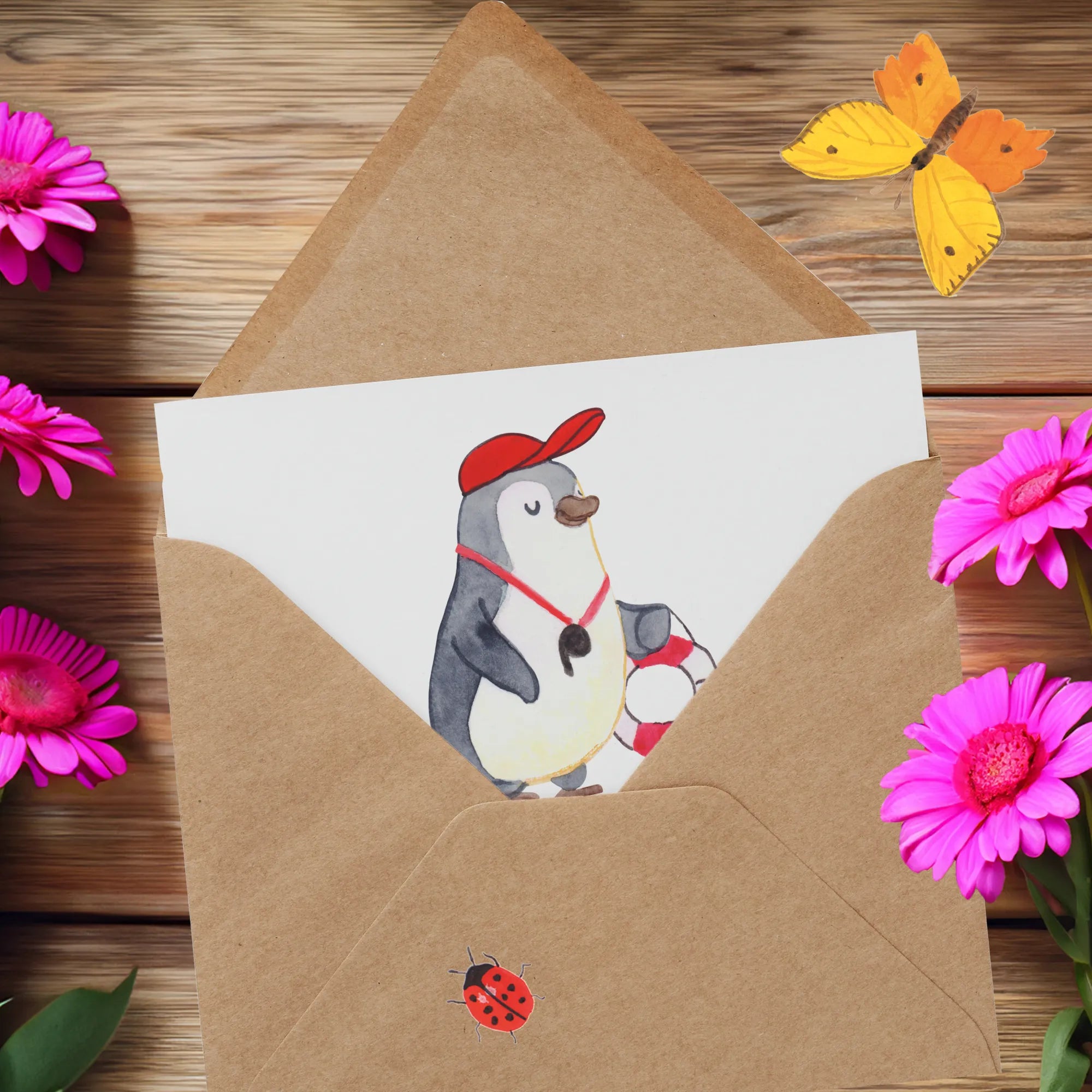 Feiere besondere Anlässe wie Geburtstage, Hochzeiten oder Berufsjubiläen mit dieser besonderen Grußkarte. Die künstlerischen Motive wurden von Mrs. Panda liebevoll per Hand mit Aquarell gestaltet und fangen die Leidenschaft für den Beruf des Bademeisters perfekt ein. Gib der Karte einen ganz besonderen Platz in Deinem Herzen oder verschenke sie als liebevolles Dankeschön.