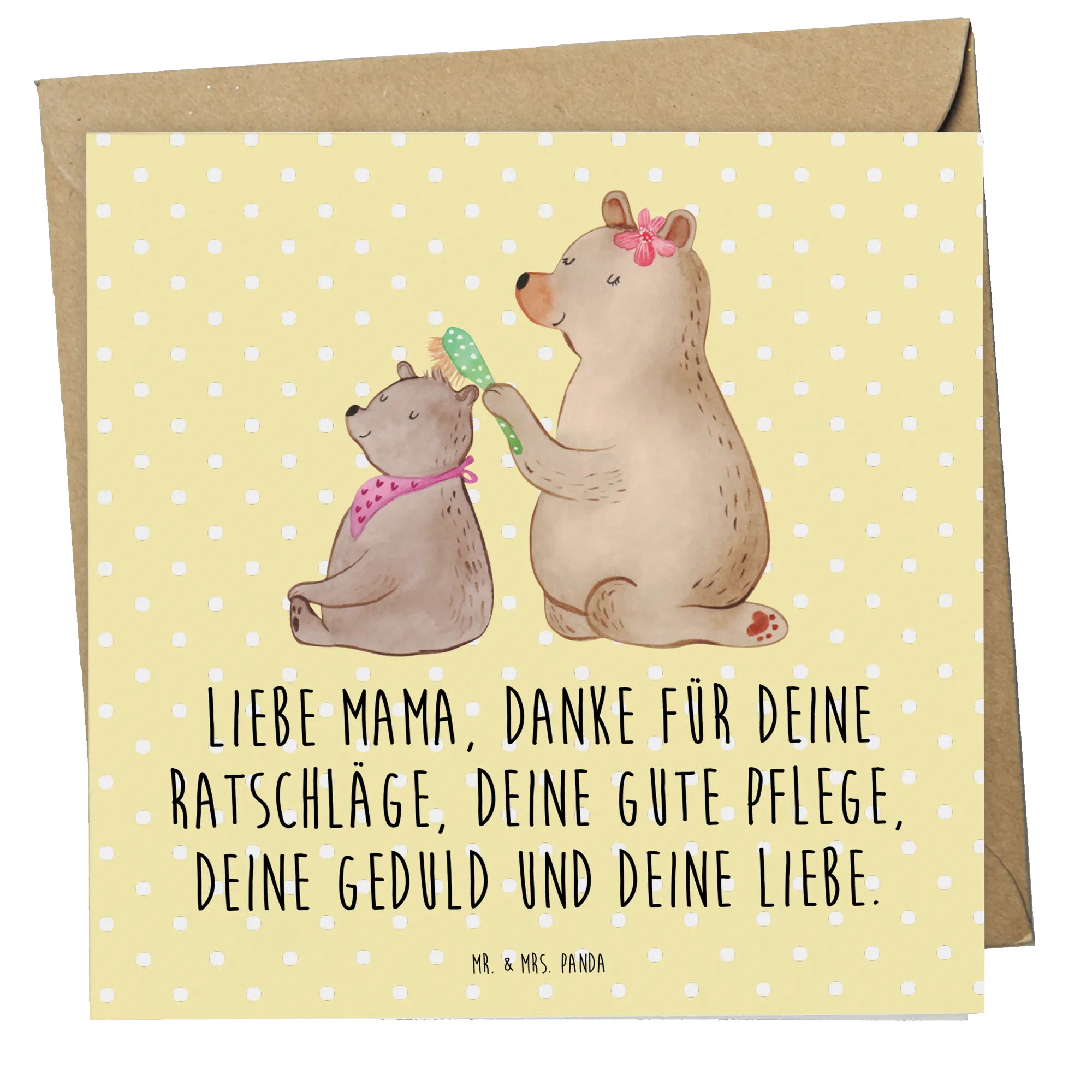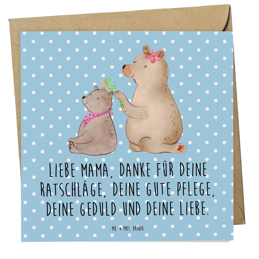 Das Motiv zeigt einen großen Bären, der mit liebevollem Gesichtsausdruck die Haare eines kleineren Bären mit einer gepunkteten Bürste bürstet. Der kleinere Bär trägt ein Tuch um den Hals und schließt entspannt die Augen. Diese Szene strahlt Wärme, Fürsorge und eine wundervolle familiäre Atmosphäreres aus. Die Karte ist ideal, um deiner Mutter zum Muttertag zu danken oder sie einfach nur zu erfreuen!