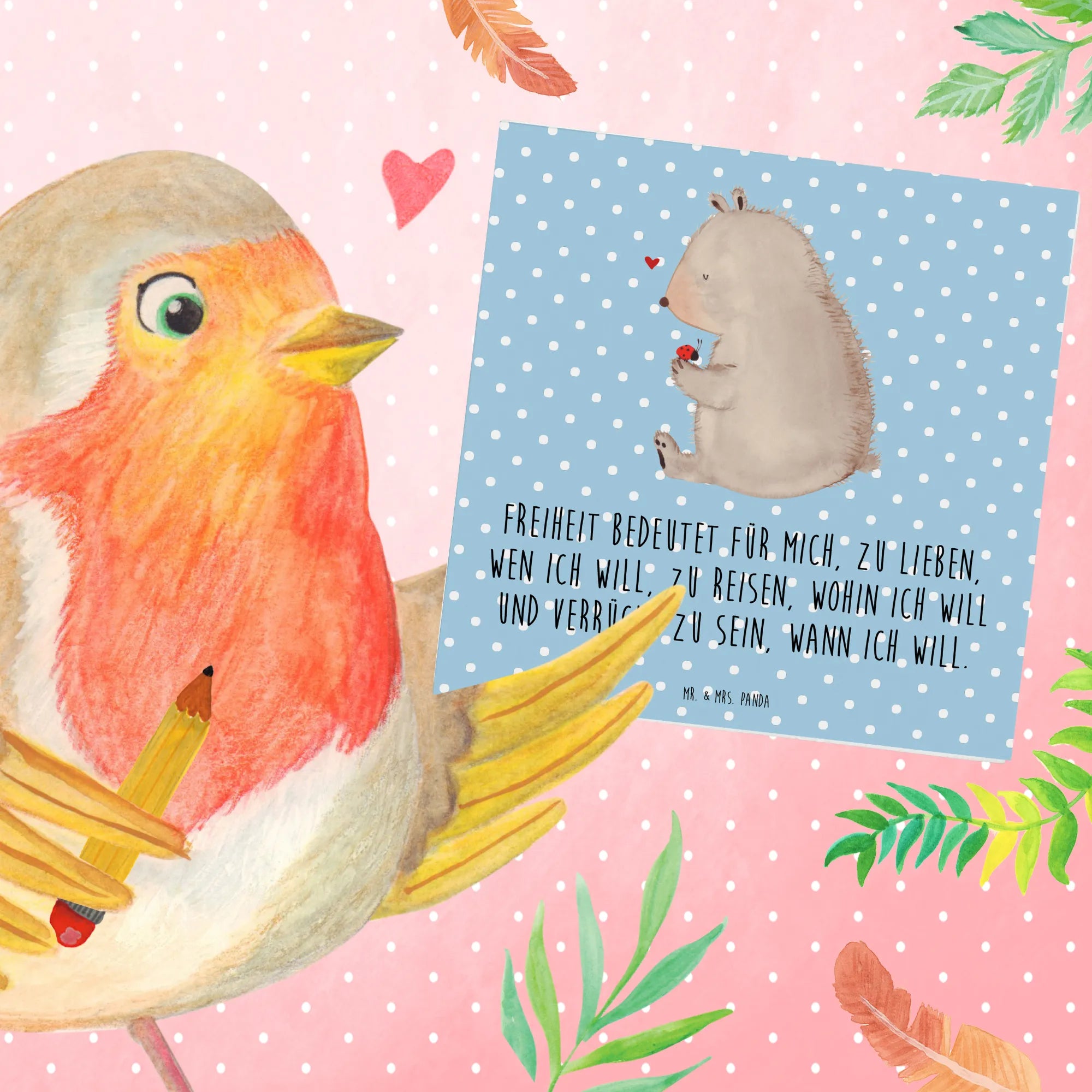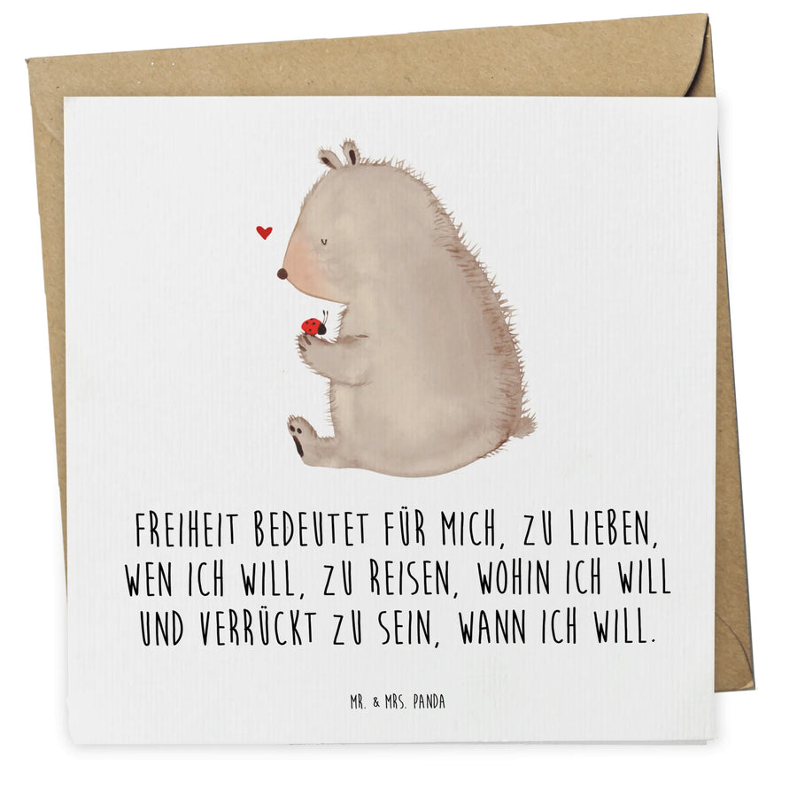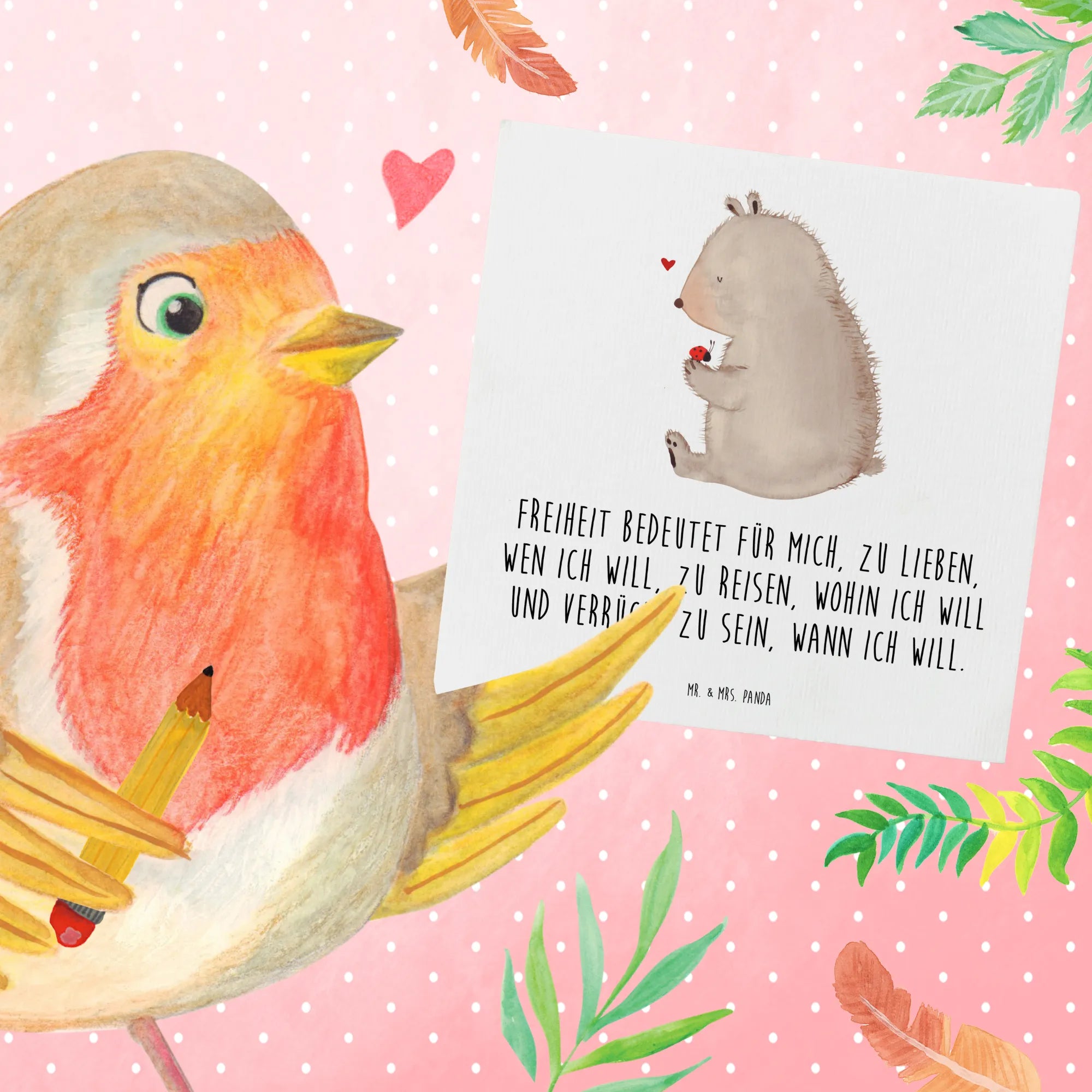 Perfekt geeignet für zahlreiche Anlässe wie Geburtstage, Hochzeiten, Verabschiedungen oder Jubiläen, macht sie sich hervorragend als individuelle Grußkarte, Einladungskarte oder Glückwunschkarte. Das süße Motiv zeigt einen niedlichen Bären, der mit einem Marienkäfer am Lagerfeuer Marshmallows grillt – ein ganz besonderes Bild, das Freude und Freiheit ausstrahlt. Du kannst dir kaum etwas Schöneres vorstellen, denn: "Freiheit bedeutet für mich, zu lieben, wen ich will, zu reisen, wohin ich will und verrückt zu sein, wann ich will."