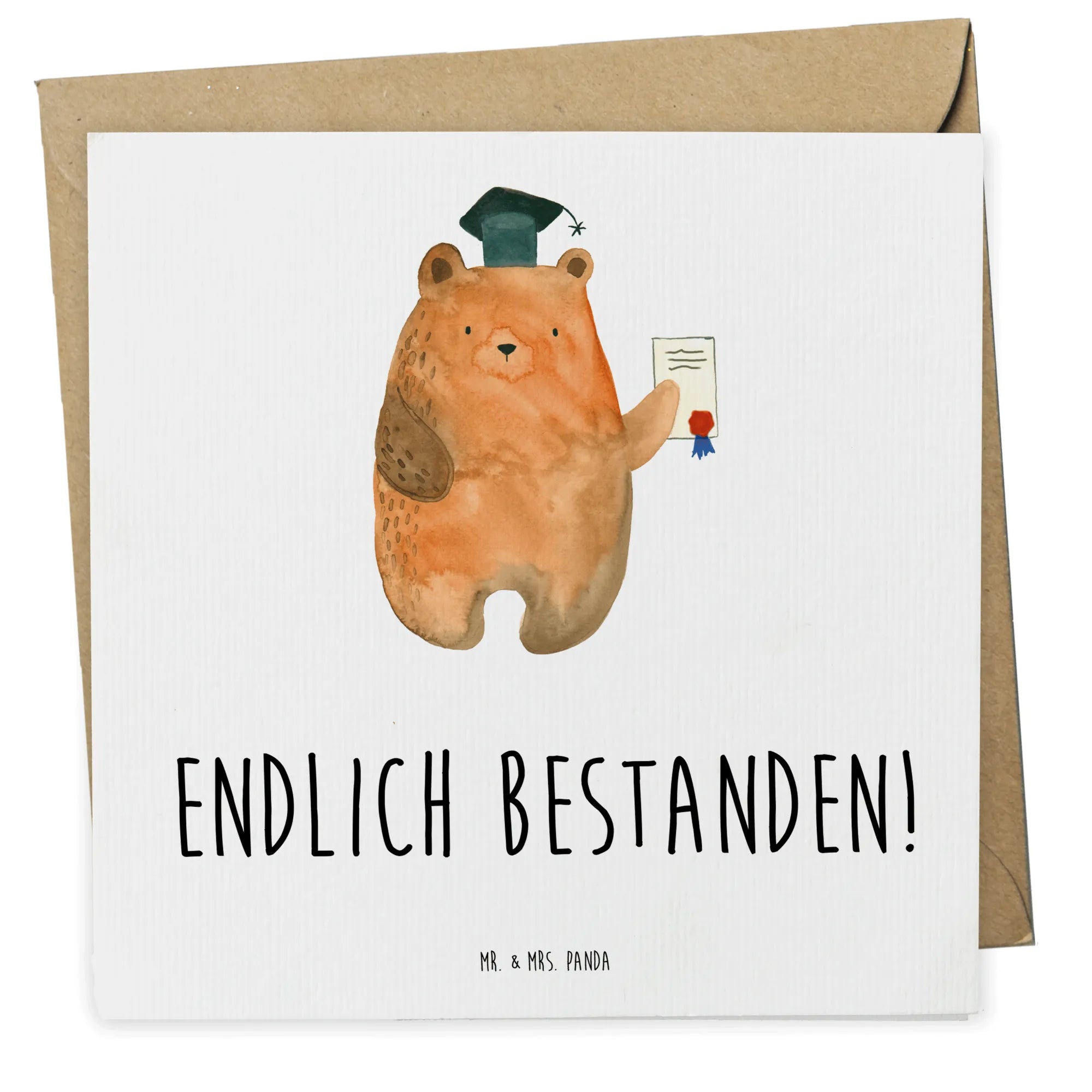 Suchst du eine hochwertige Grußkarte, die Gefühle ausdrückt und lange in Erinnerung bleibt? Unsere quadratische Deluxe Karte aus der Bär-Kollektion von Mr. & Mrs. Panda zeigt einen niedlichen Prüfungsbären, handgezeichnet von Mrs. Panda, kombiniert mit dem herzlichen Slogan „Endlich bestanden!“ – ideal für Abitur, Zeugnisübergaben und Abschlussfeiern.