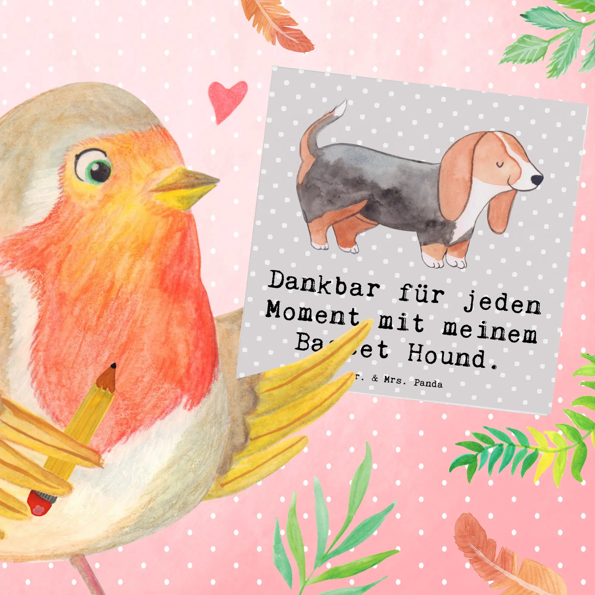 Das Design zeigt den charmanten Basset Hound in seiner typischen, gemütlichen Haltung, die jeden Basset Hound Fan sofort anspricht. Der liebevolle Spruch "Dankbar für jeden Moment mit meinem Basset Hound" unterstreicht die besondere Verbindung zwischen Hund und Mensch. Diese Grußkarte symbolisiert die tiefen und unvergesslichen Momente, die wir mit unseren geliebten Vierbeinern teilen, und eignet sich daher perfekt für Hundebesitzer, die ihre Gefühle zum Ausdruck bringen möchten.