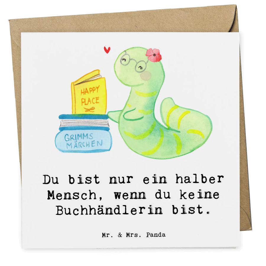 Die Vorderseite der Karte ist mit einem liebevoll gestalteten Motiv einer Bücherwurm-Dame dekoriert, die den Spruch 'Du bist nur ein halber Mensch, wenn du keine Buchhändlerin bist.' trägt. Egal, ob du die Karte zum Geburtstag, zur Hochzeit, zum Jubiläum oder einfach nur als kleine Auffmerksamkeit für einen lieben Kollegen oder eine Kollegin verschenken möchtest, sie ist äußerst vielseitig einsetzbar.