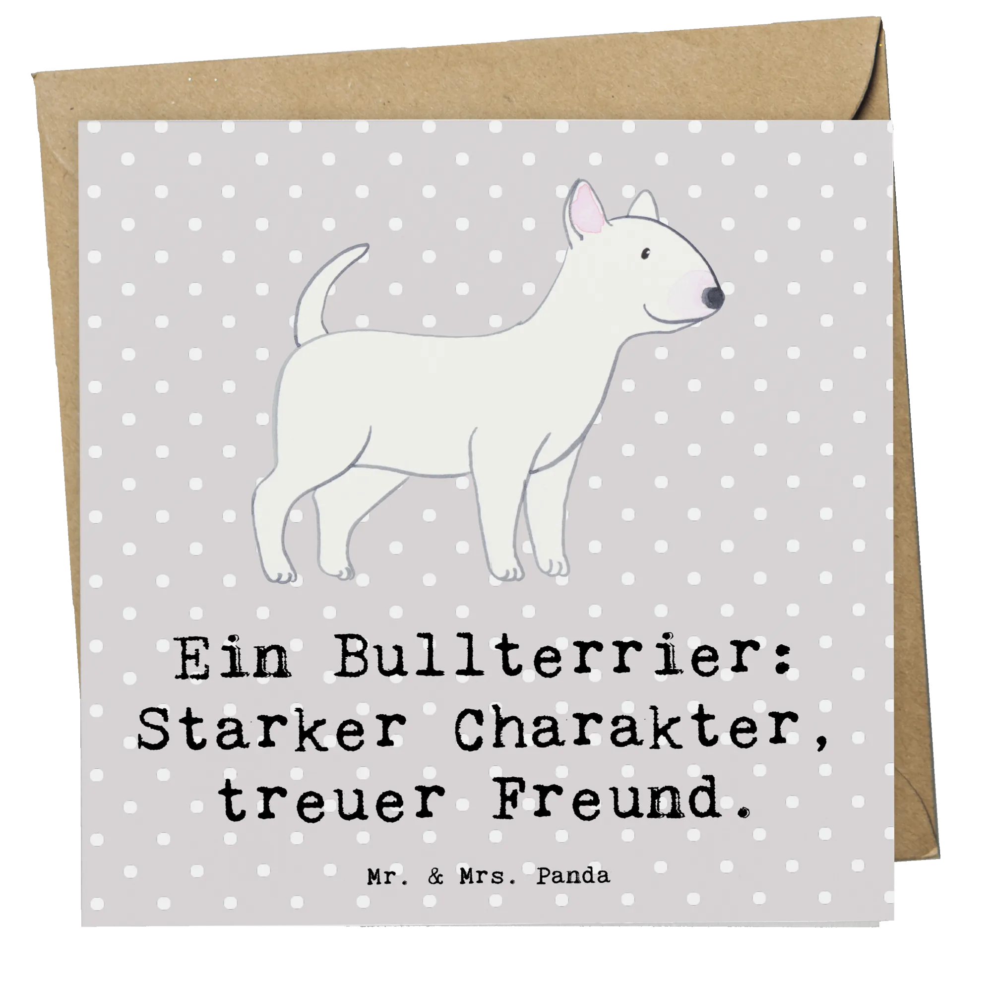Mit einem eindrucksvollen Spruch auf der Vorderseite, "Ein Bullterrier: Starker Charakter, treuer Freund", ist diese Karte ideal, um Glückwünsche aller Art zu übermitteln. Ob zum Geburtstag, zur Hochzeit, bei einem Jubiläum oder einfach als kleine Freude zwischendurch: Diese Karte wird mit Sicherheit ein Lächeln zaubern.