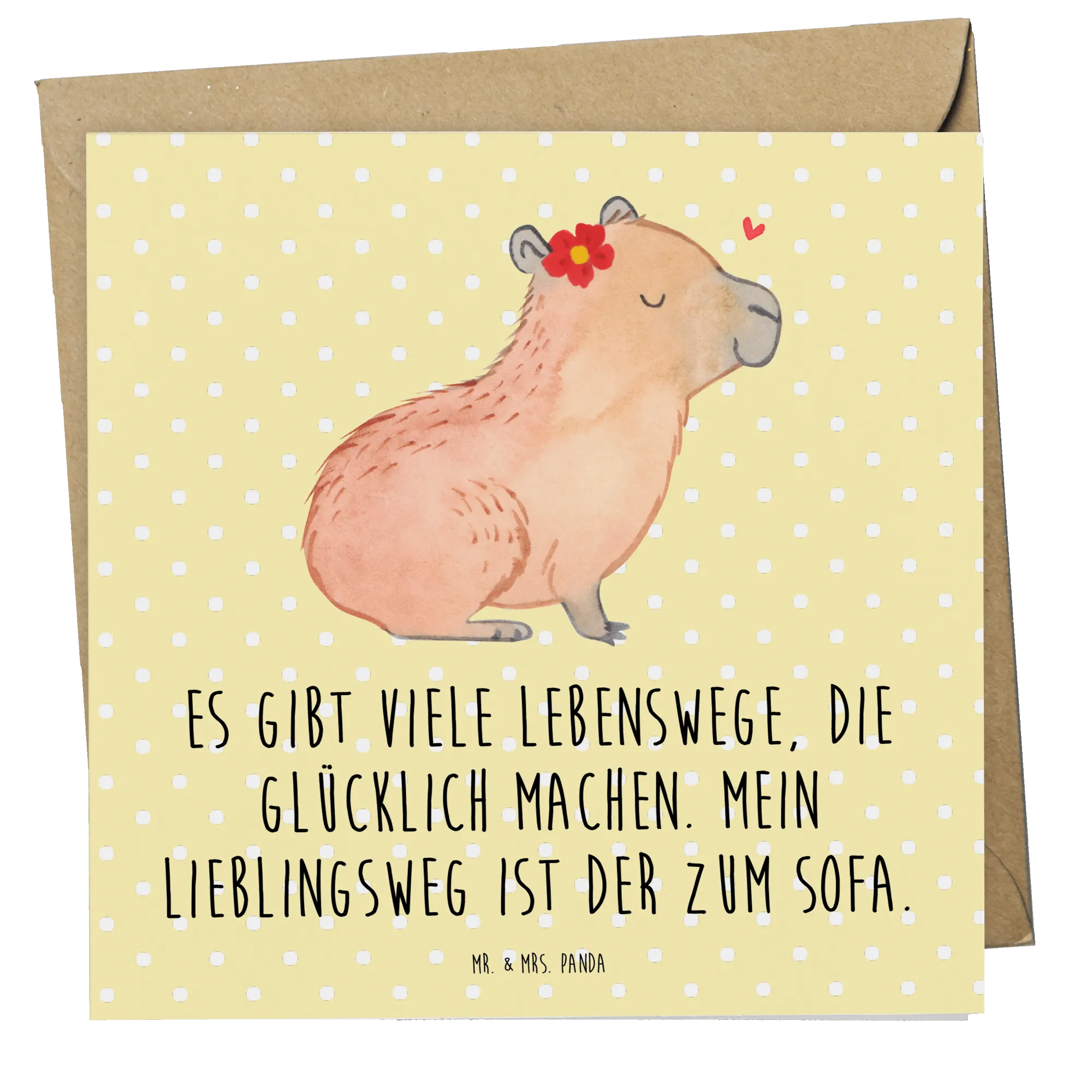Willkommen in der zauberhaften Welt von Mr. & Mrs. Panda, wo ein kleines Capybara mit geschlossenen Augen und einem liebevollen Lächeln auf dich wartet. Auf diesem entzückenden Motiv trägt das Capybara eine rote Blume mit gelber Mitte auf dem Kopf, die ihm einen besonders verspielten Ausdruck verleiht. Ein schwebendes Herz über dem Capybara unterstreicht die herzliche Atmosphäre und lässt das Ganze noch zauberhafter wirken. Die warmen und sanften Farben der Illustration schenken ein Gefühl von Ruhe und Zufriedenheit. Der Spruch 'Es gibt viele Lebenswege, die glücklich machen. Mein Lieblingsweg ist der zum Sofa.' bringt die Gelassenheit und Freude, die dieses Motiv ausstrahlt, auf den Punkt, und lädt dich ein, dich dem Capybara anzuschließen und die einfachen, glücklichen Momente zu genießen.