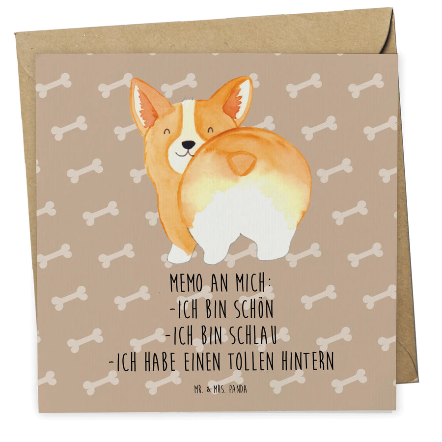 Der süße Corgie, der begeistert seinen Po in die Kamera hält, sorgt für gute Laune und ist ein echter Hingucker. Die Vorderseite der Karte ist hochglänzend veredelt und trägt den charmanten Slogan: "Memo an mich: ich bin schön, ich bin schlau, ich habe einen tollen Hintern". Das edle Design wird durch die matte Innenseite ergänzt, die sich ideal für eine persönliche Nachricht eignet.