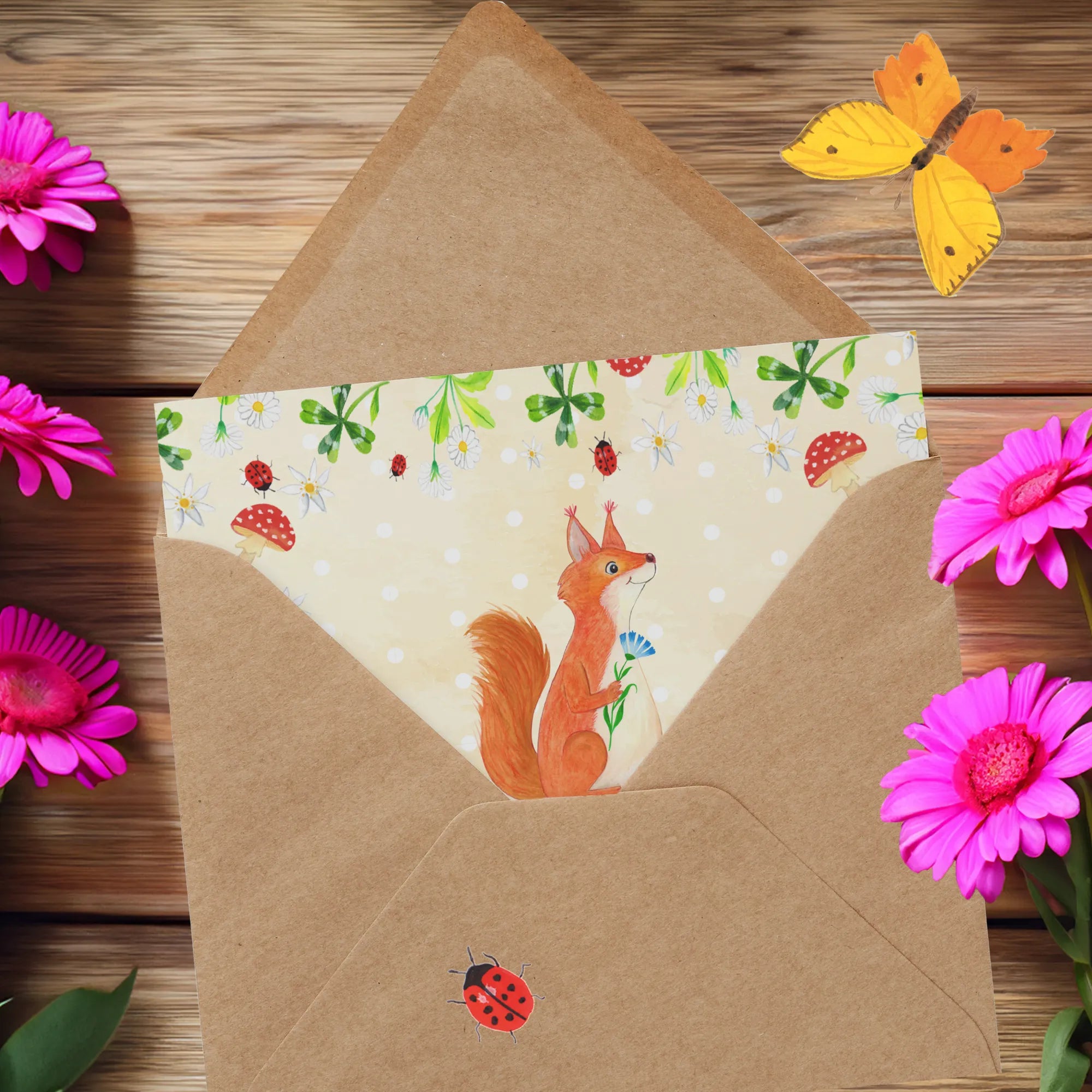 Hergestellt aus hochwertigem 300 Gramm Karton, fällt die edle Matt-Optik sofort ins Auge. Die Vorderseite der Karte ist hochglänzend veredelt, wodurch das niedliche Eichhörnchen und die bunten Blumen besonders strahlend zur Geltung kommen. Die matte Innenseite ist ideal für deine persönlichen Worte, die du auf dieser besonderen Karte hinterlassen kannst. Es bleibt genügend Platz für persönliche Glückwünsche, liebevolle Botschaften oder motivierende Sprüche!