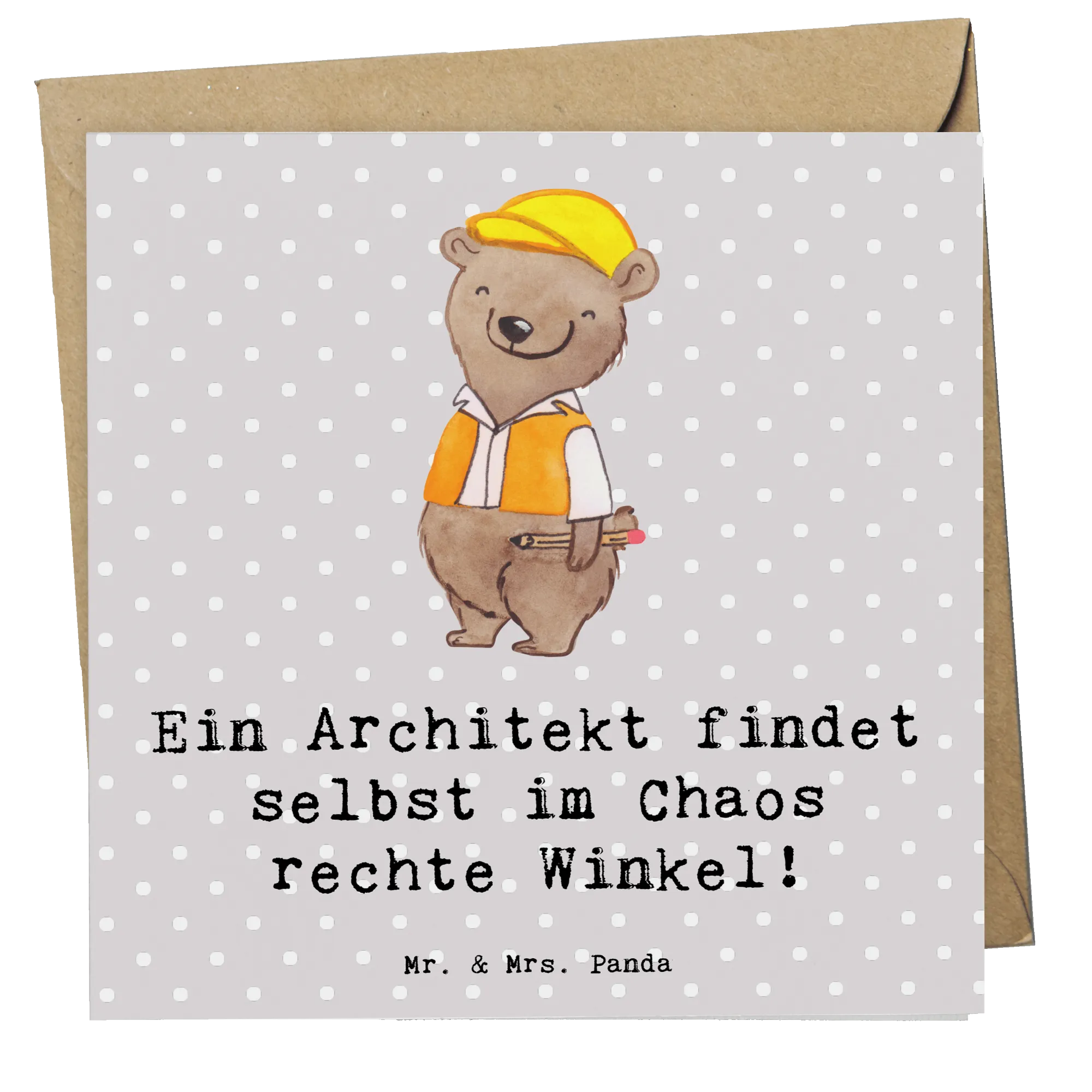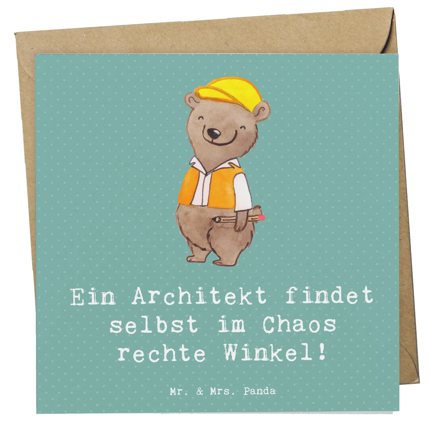 Die Vorderseite der Karte zeigt ein liebevoll gestaltetes Motiv, das einen Architekten darstellt, begleitet von dem inspirierenden Spruch: "Ein Architekt findet selbst im Chaos rechte Winkel!". Diese Worte sind nicht nur eine Hommage an die Kreativität und das Können von Architekten, sondern auch eine Ermutigung, die kleinen Dinge im Leben zu schätzen – selbst in herausfordernden Zeiten.