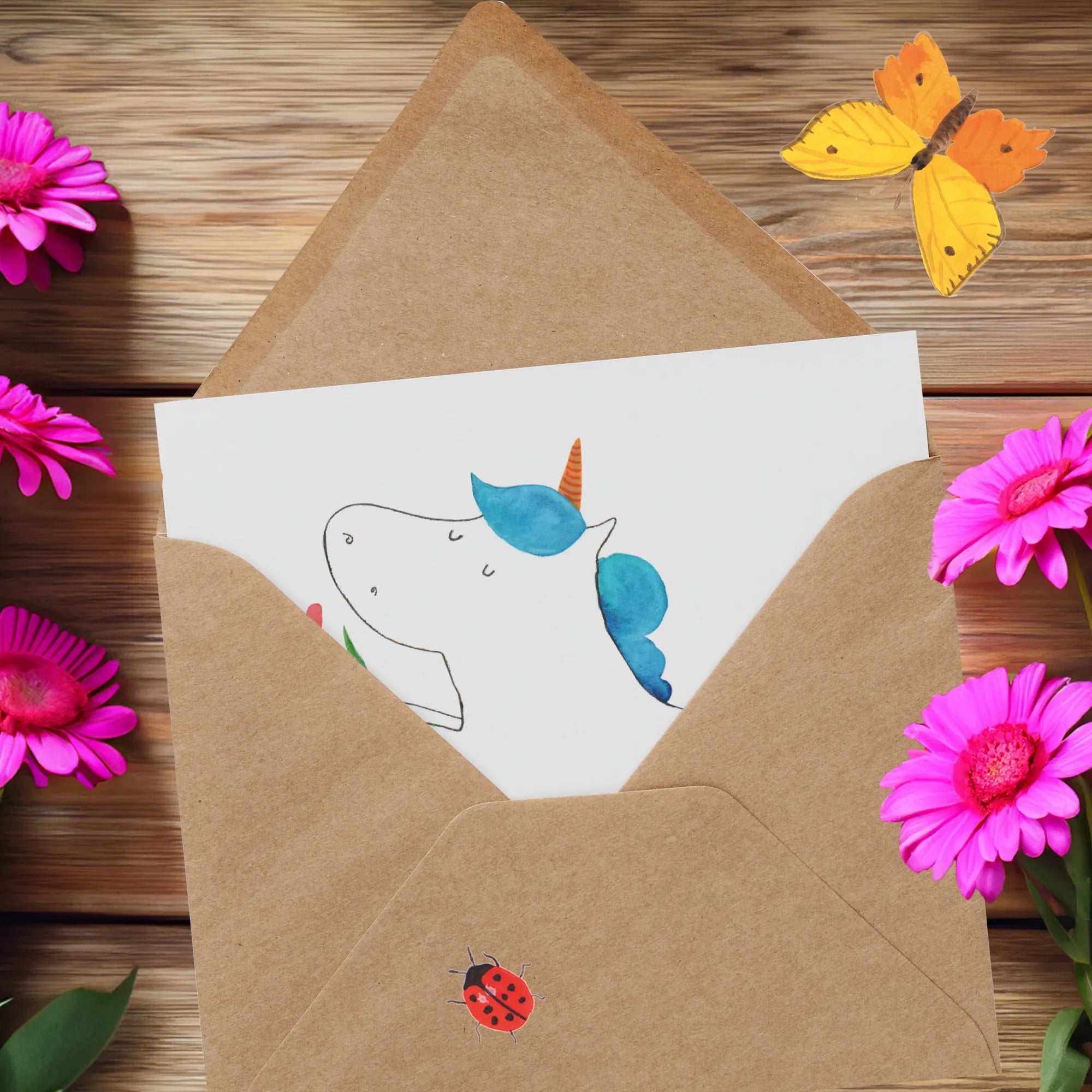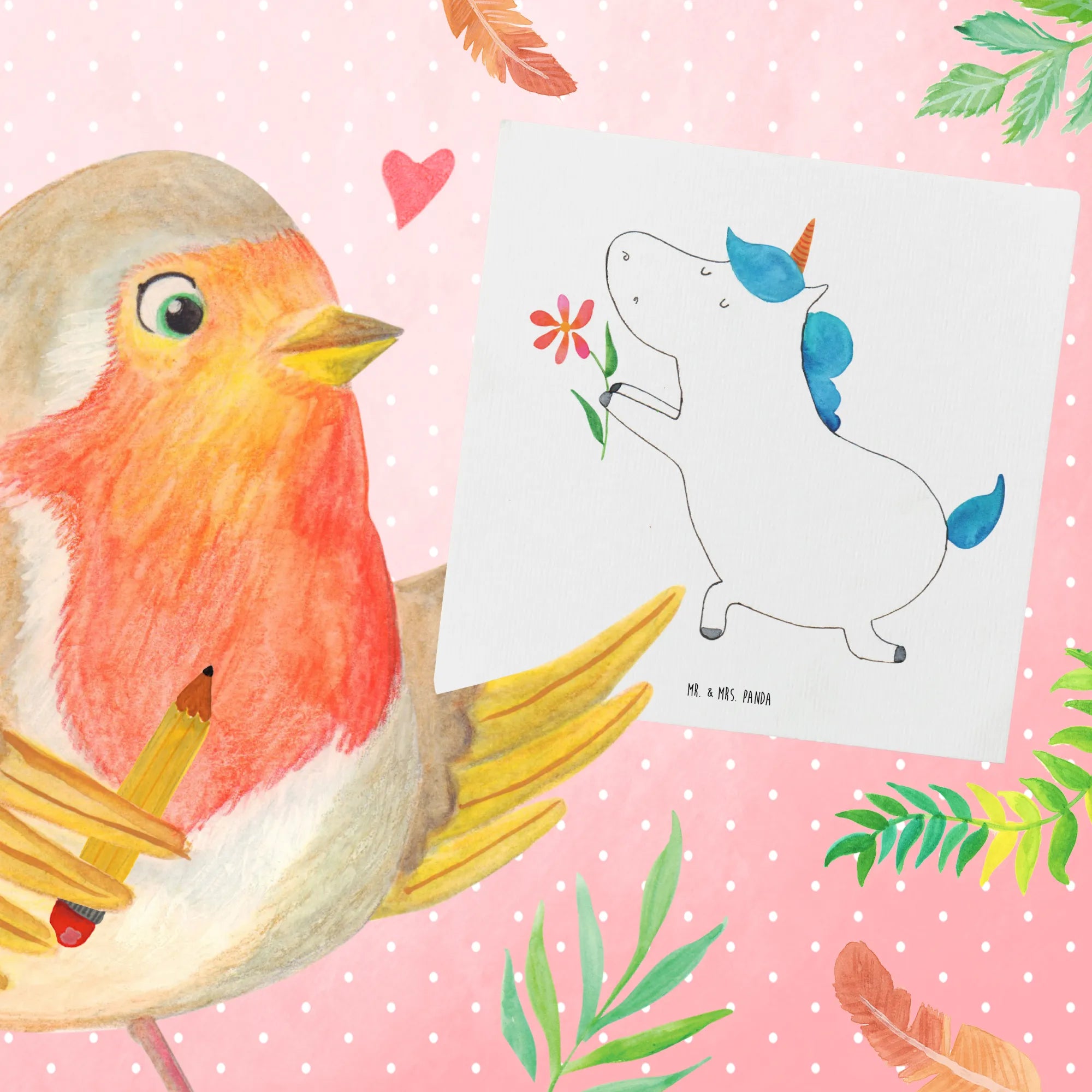 Die Deluxe Karte Einhorn Blume von Mr. & Mrs. Panda ist das perfekte Geschenk für jeden, der die zauberhafte Welt der Einhörner liebt. Diese wunderschöne, hochwertige und quadratische Karte ist auf hochwertigem 300 Gramm Karton gedruckt und hat eine hochglänzend veredelte Vorderseite sowie eine matte Innenseite, die dir die Möglichkeit gibt, deine persönlichen Glückwünsche oder Grüße einzutragen.