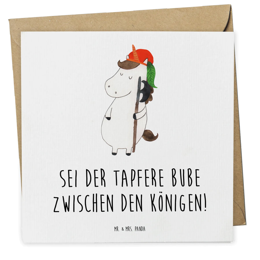 Die Karte hat eine Größe von 140 mm x 140 mm und besteht aus edlem, 300 Gramm schwerem Karton, der sowohl eine hochglänzende Vorderseite als auch eine matte Innenseite zur einfachen Beschriftung bietet. Das freundliche Einhorn im mittelalterlichen Stil ist in verspielten Farben gestaltet und trägt einen Helm, was ihm einen charmanten, kindlichen Charakter verleiht. Der Spruch „Sei der tapfere Bube zwischen den Königen!“ inspiriert und motiviert, egal wo sie versendet wird.