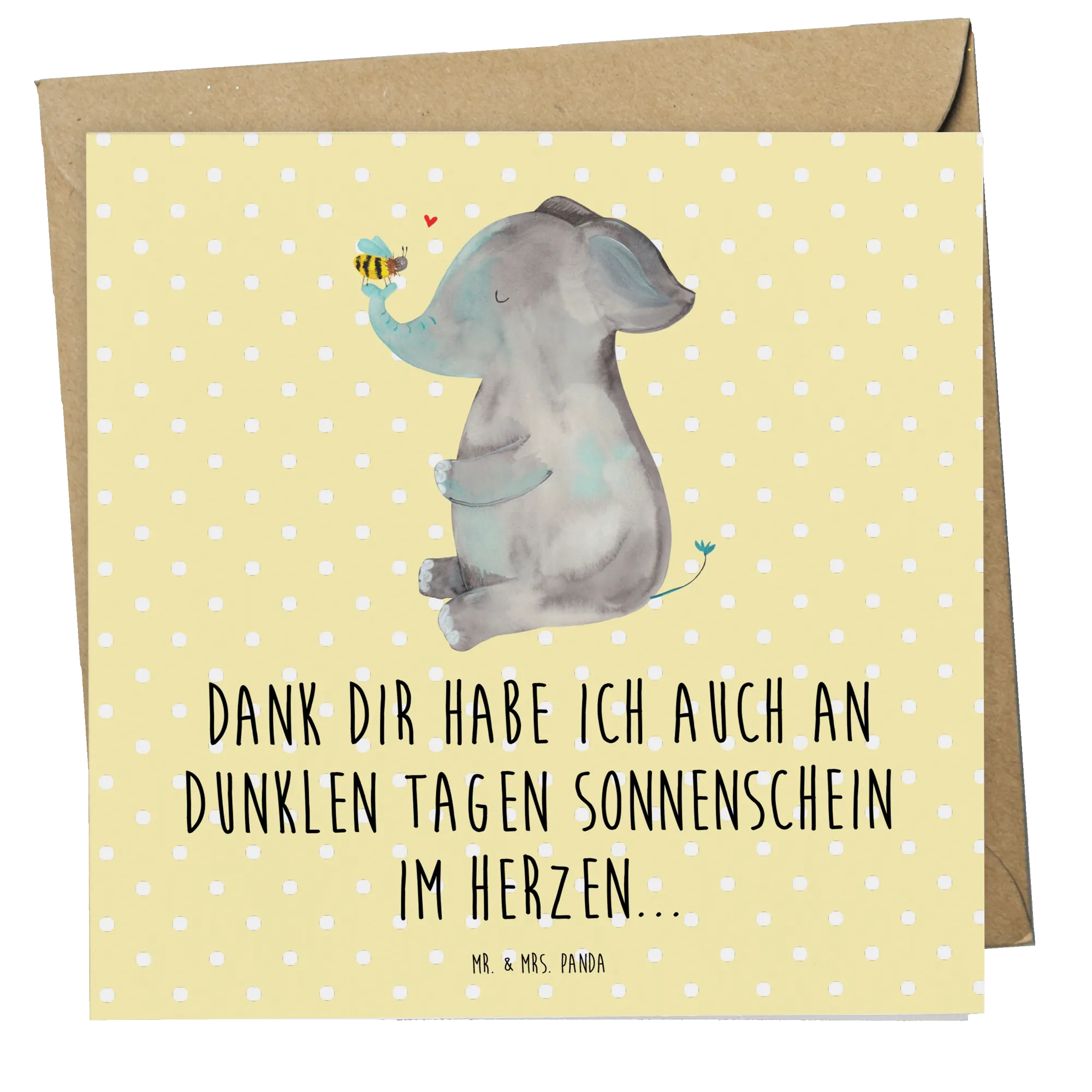 Mit einem Spruch wie "Dank dir habe ich auch an dunklen Tagen Sonnenschein im Herzen..." wird diese Karte zum idealen Liebesbeweis für deinen Herzensmenschen. Die Small World Kollektion ist nicht nur bunt und vielfältig, sondern spiegelt auch die Lebensfreude wider, die Mr. und Mrs. Panda in jeden ihrer Designs stecken. Verschenke Freude, Glück und ein wenig „Gute Laune“ mit dieser einzigartigen Deluxe Karte und lass den Empfänger wissen, wie wichtig er oder sie dir ist. Wie auch immer du sie nennst – Glückwunschkarte, Hochzeitskarte, Einladungskarte oder einfach nur eine Karte, um jemanden zum Lächeln zu bringen – die Deluxe Karte mit dem Elefant und der Biene wird immer die richtige Wahl sein.