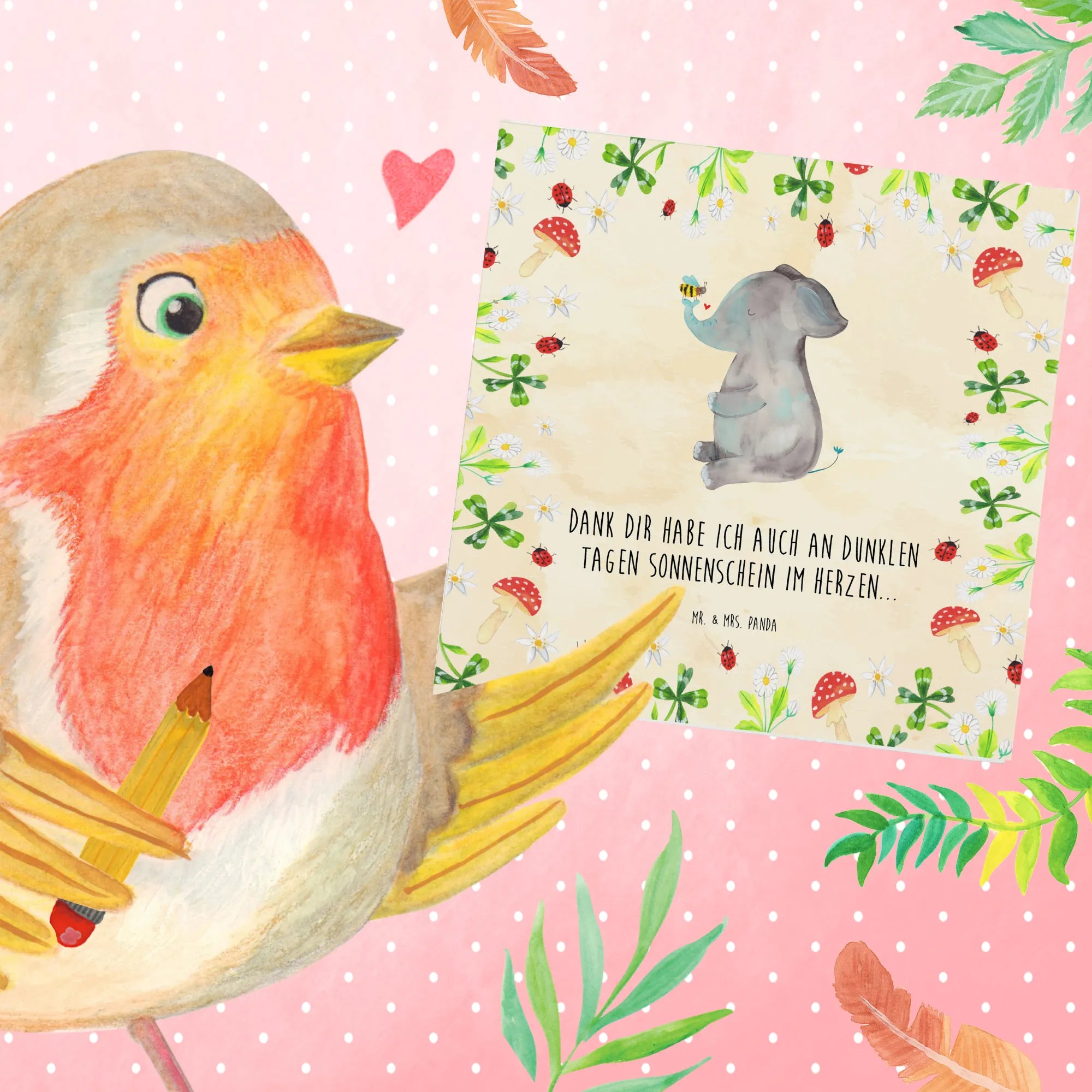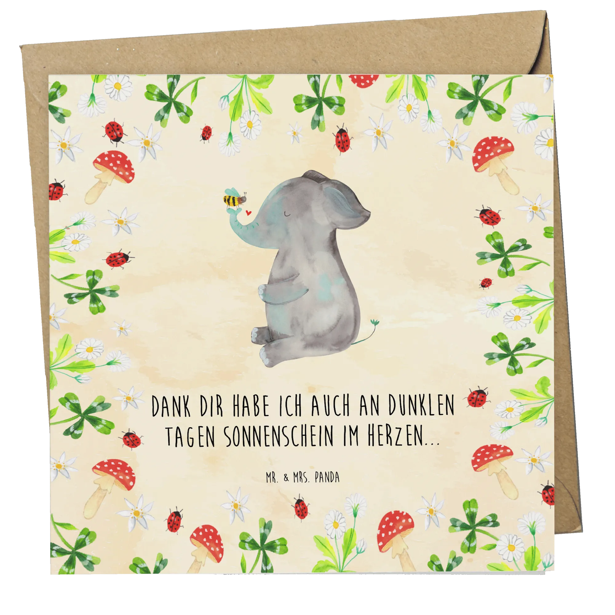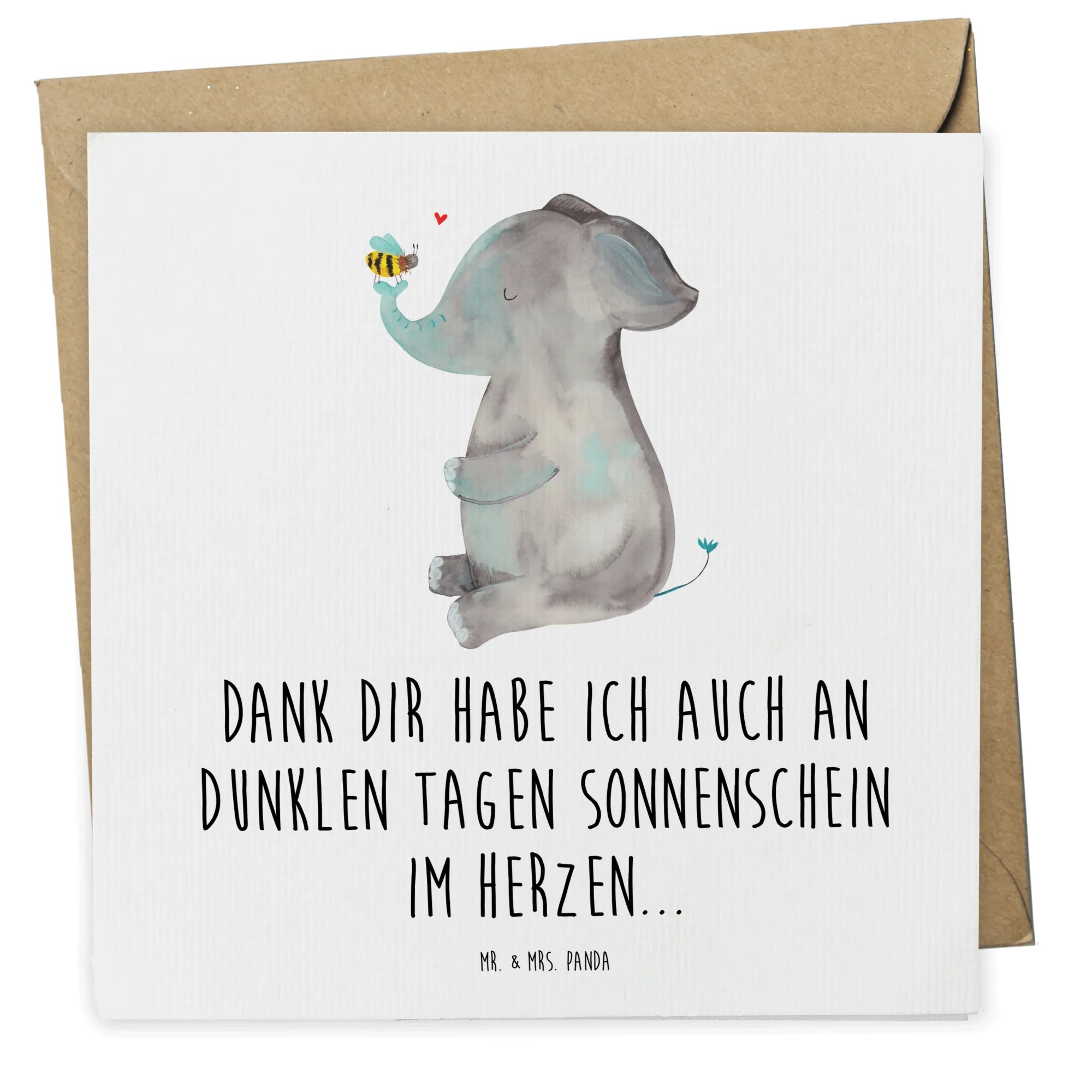 In diesem entzückenden Bild hält ein Elefant achtsam eine Biene auf seinem Rüssel, eine bezaubernde Darstellung der Schönheit in der Liebe zu den kleinsten Kreaturen. Diese Illustration von Mr. & Mrs. Panda ist ein zauberhaftes Liebesgeschenk, das zum Nachdenken anregt und Herzen wärmt. Der Spruch 'Dank dir habe ich auch an dunklen Tagen Sonnenschein im Herzen...' ist eine Liebeserklärung, die sowohl Einzigartigkeit ausstrahlt als auch die universelle Wahrheit vermittelt, dass Liebe die Dunkelheit vertreiben kann. Ideal als Liebesbeweis, Jahrestagsgeschenk oder einfach, um jeden Tag eine Dosis Liebe zu verteilen.
