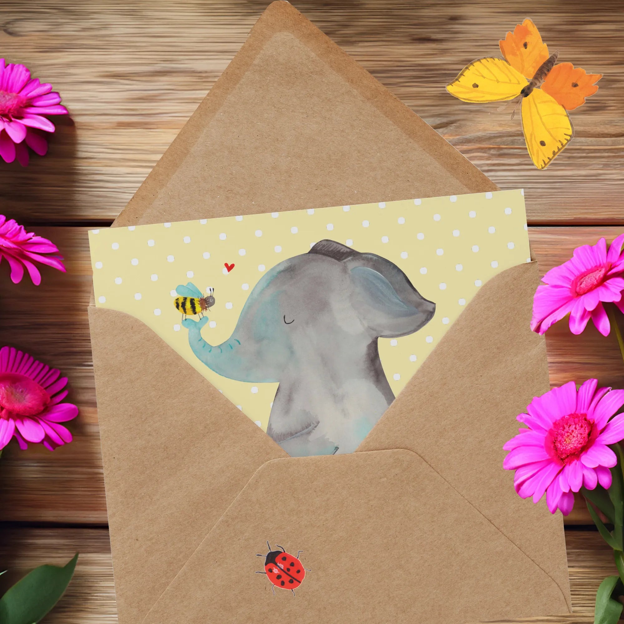Entdecke die Deluxe Karte mit dem süßen Motiv Elefant & Biene aus der besonderen Small World Kollektion von Mr. & Mrs. Panda. Diese wunderschöne und hochwertig bedruckte Klappkarte im quadratischen Format ist der perfekte Begleiter für all deine Grüße und Glückwünsche.