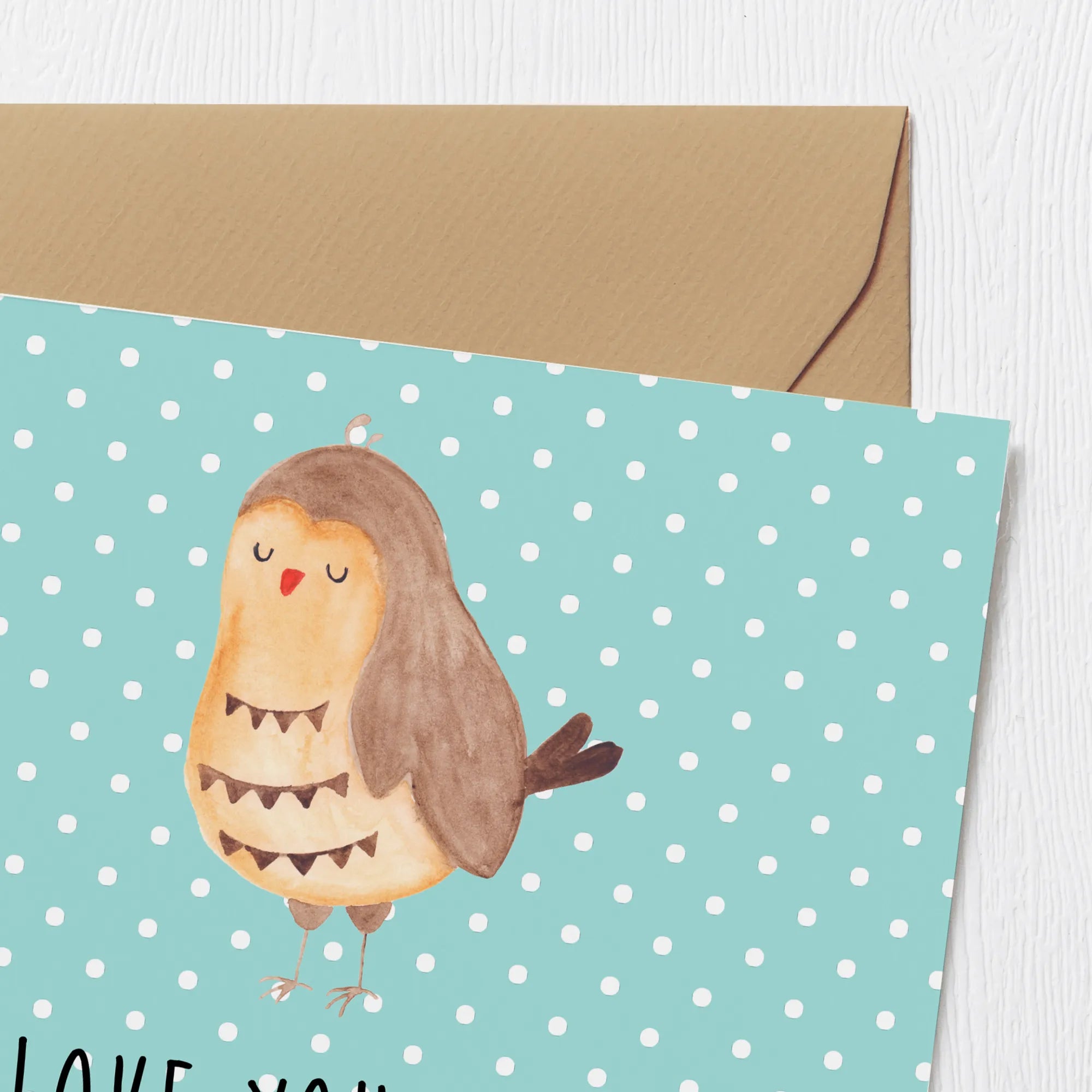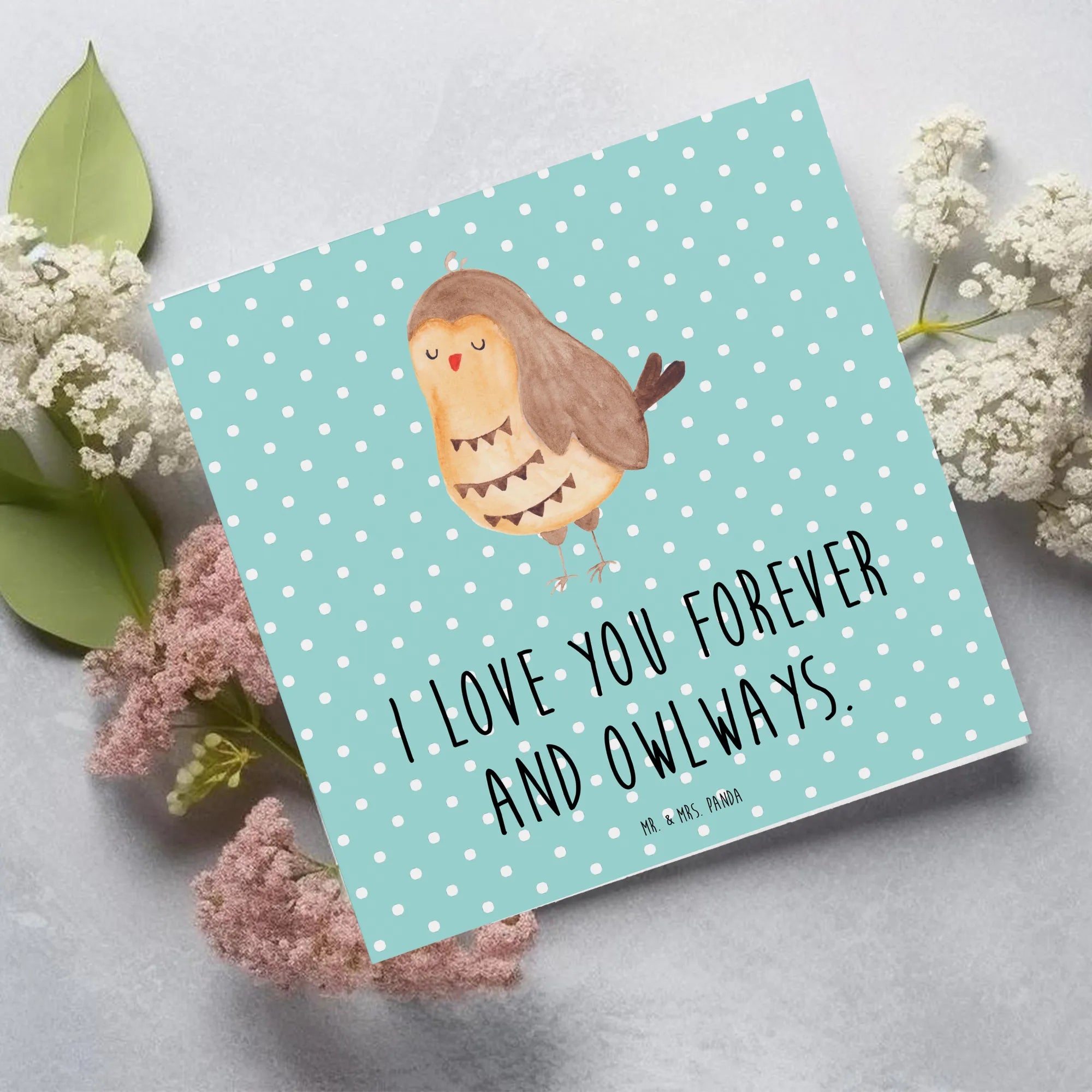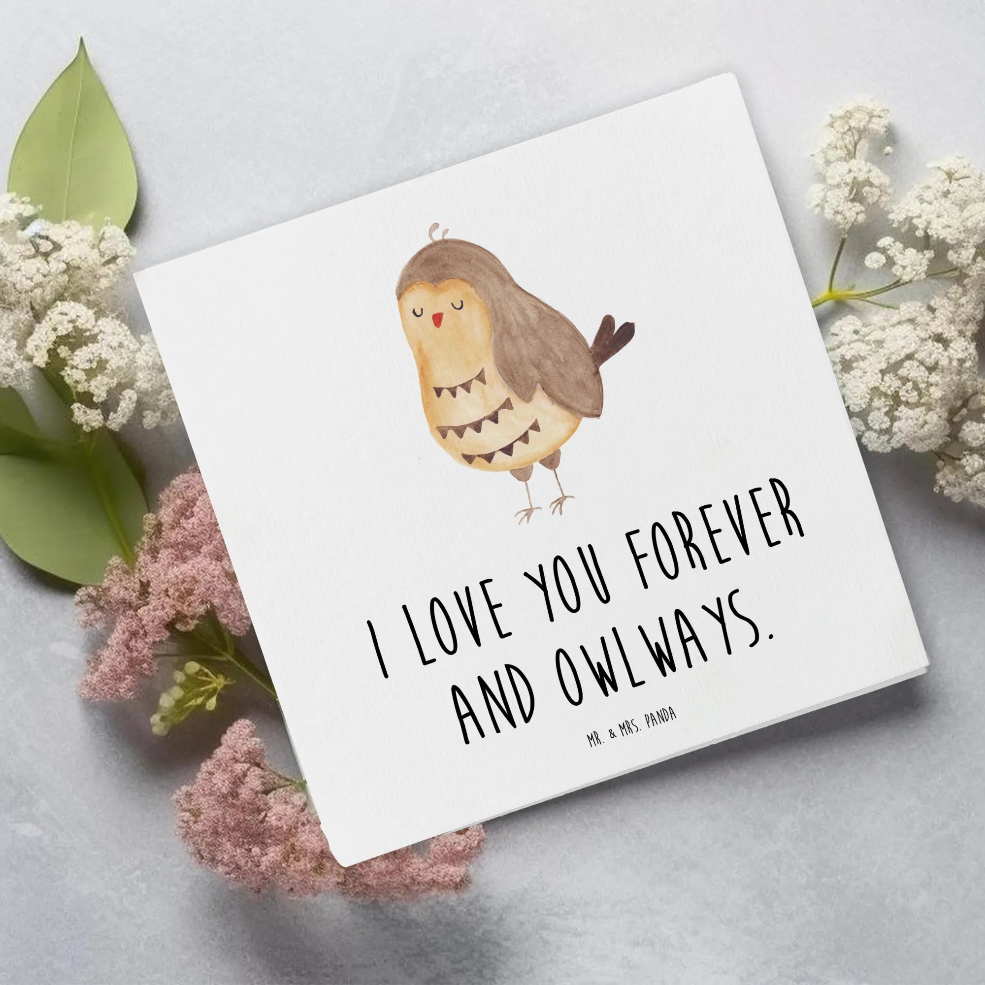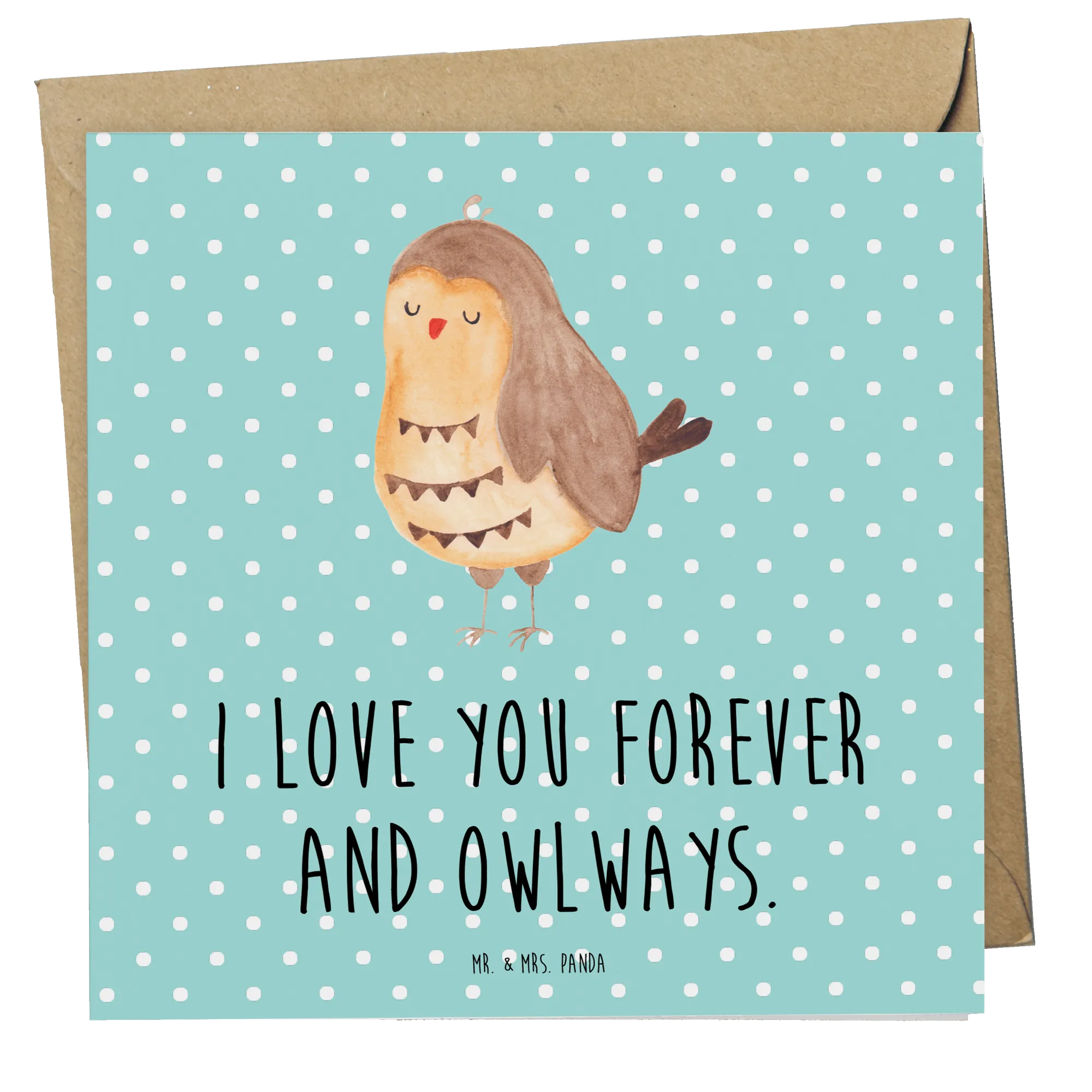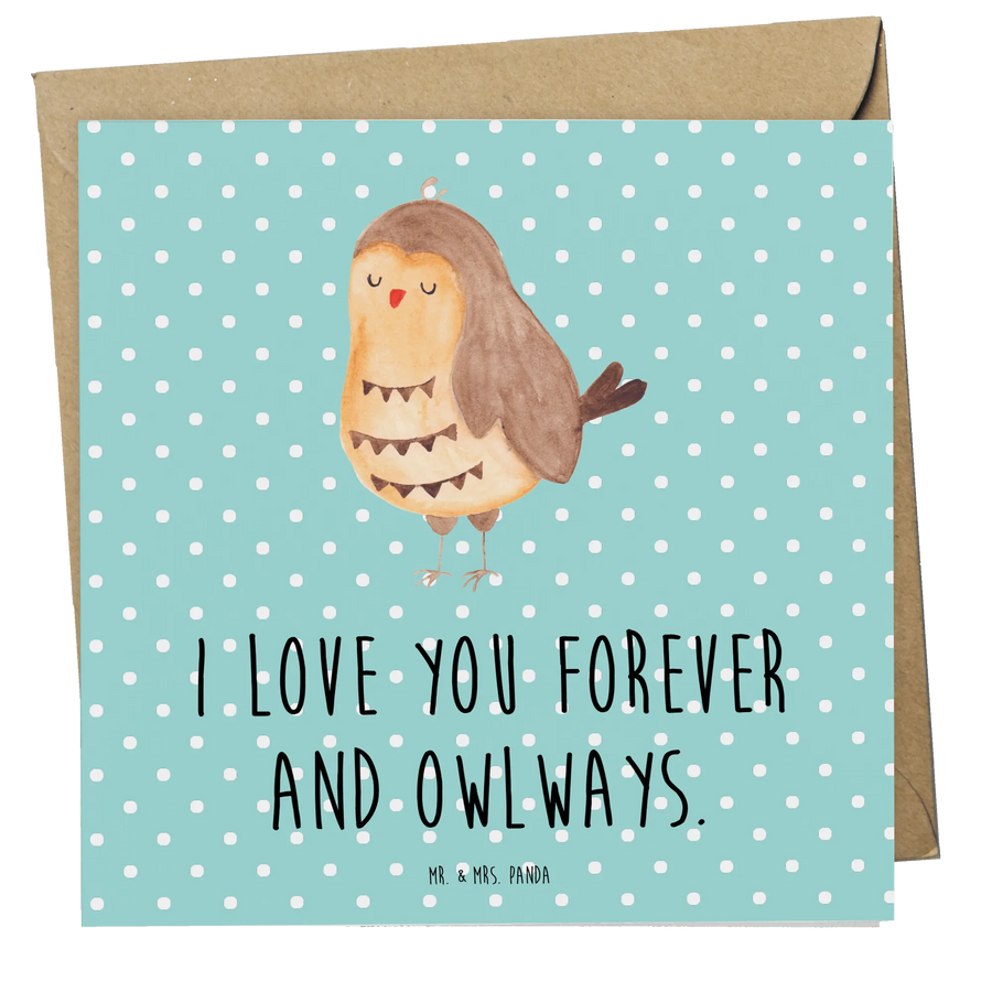 Die quadratische Karte hat eine Größe von 140 mm x 140 mm und besticht durch ihr edles, matt-glänzendes Design. Bedruckt mit dem bezaubernden Motiv der zufriedenen Eule sowie dem liebevollen Spruch "I love you forever and owlways", vermittelt die Karte auf charmante Weise, was dir am Herzen liegt.