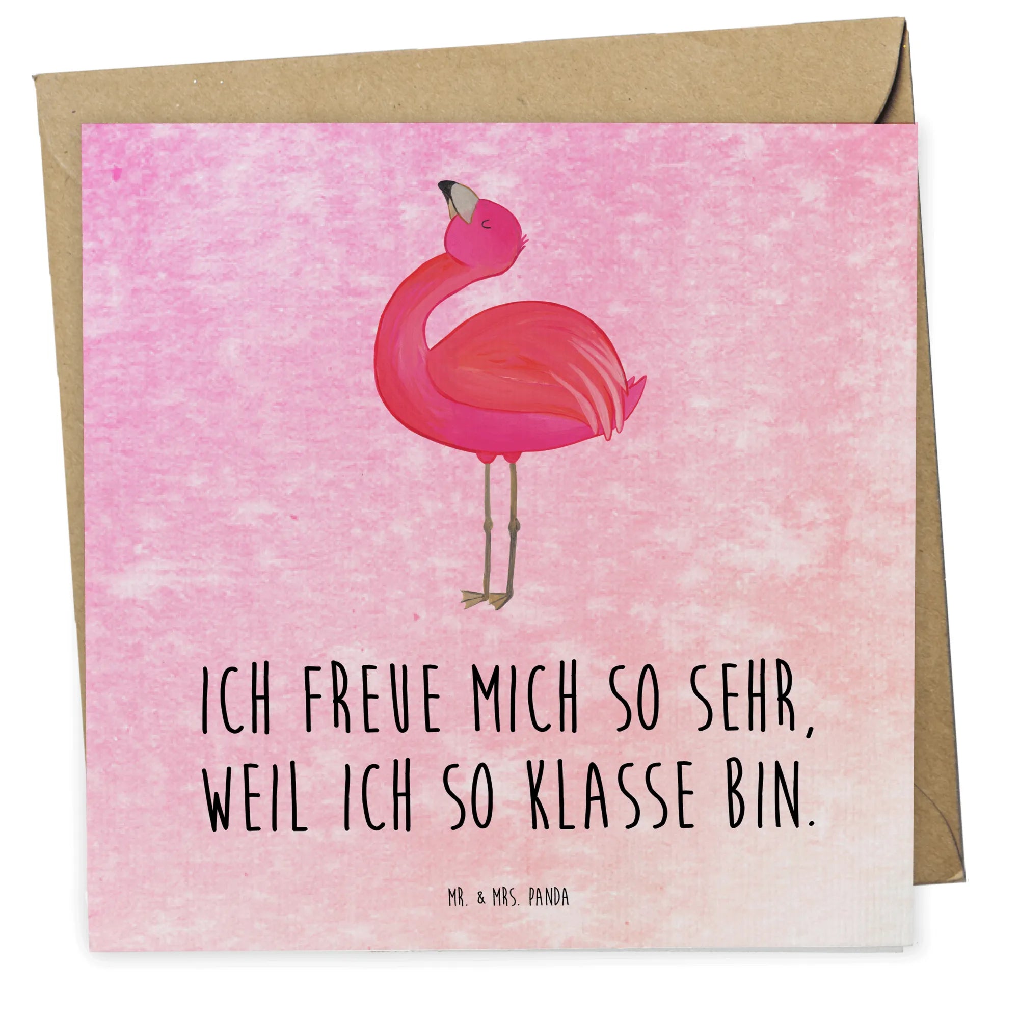 Das sorgfältig handgezeichnete Design von Mrs. Panda zeigt einen stolzen Flamingo in einer eleganten Pose. Seine verschiedenen Rosatöne und der kunstvolle Pinselstrich verleihen der Karte eine besondere Lebendigkeit. Mit dem Spruch 'Ich freue mich so sehr, weil ich so klasse bin.' auf der Vorderseite erinnert die Karte die Beschenkte daran, wie wertvoll sie ist und lädt zu einem Lächeln ein.