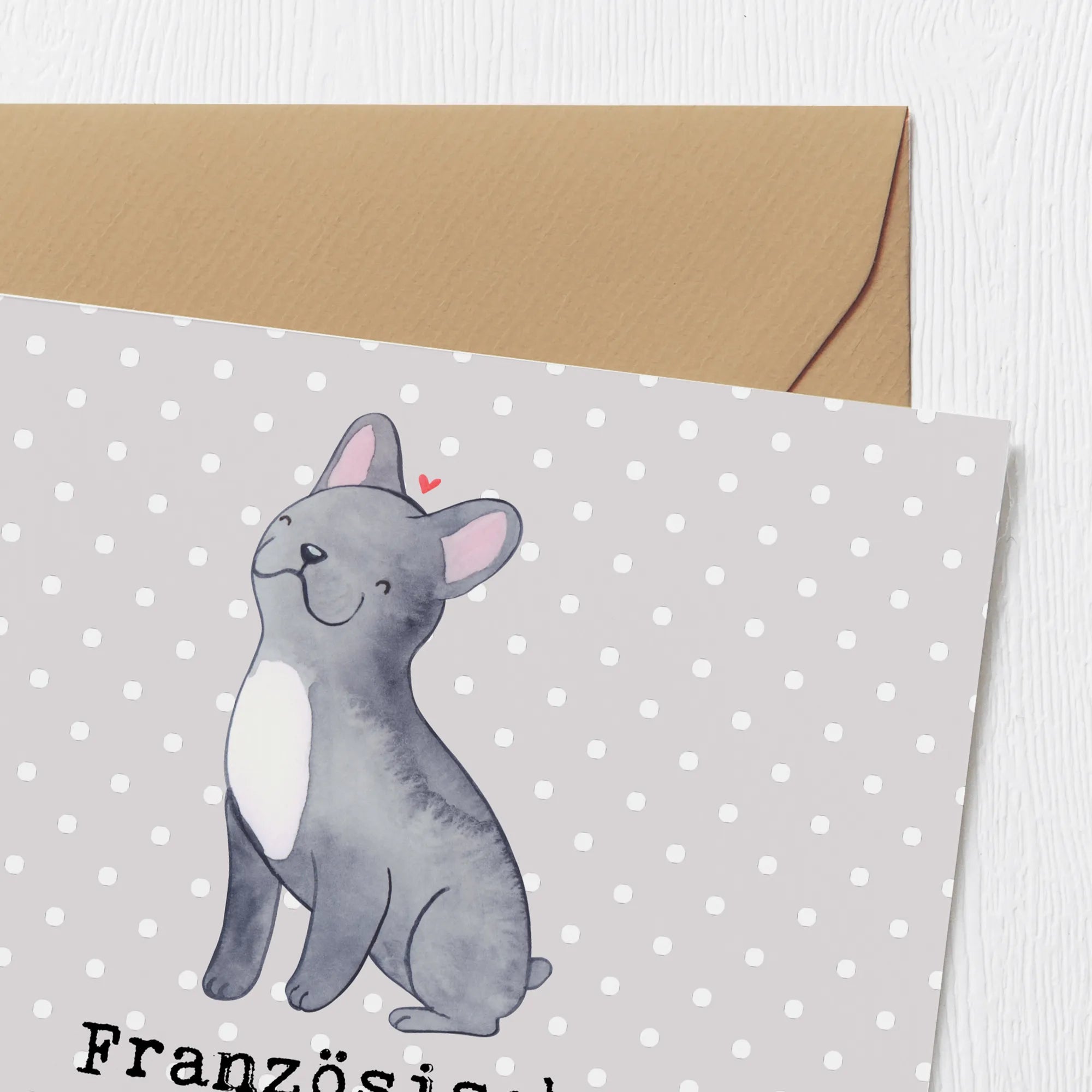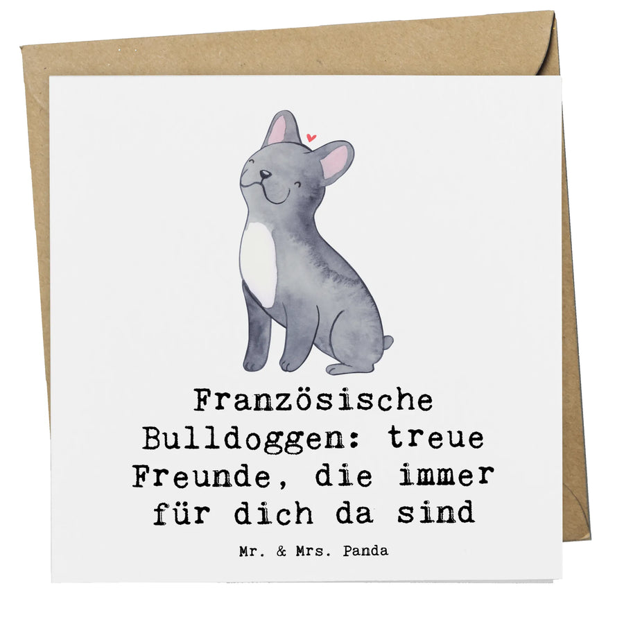 Die liebevoll gestaltete Vorderseite zeigt eine süße Französische Bulldogge mit dem Slogan "Französische Bulldoggen: treue Freunde, die immer für dich da sind" und sorgt garantiert für ein Lächeln auf dem Gesicht des Beschenkten. Hergestellt aus hochwertigem Karton (300 Gramm) und vollfarbig bedruckt, strahlt die Karte Eleganz und Stil aus.